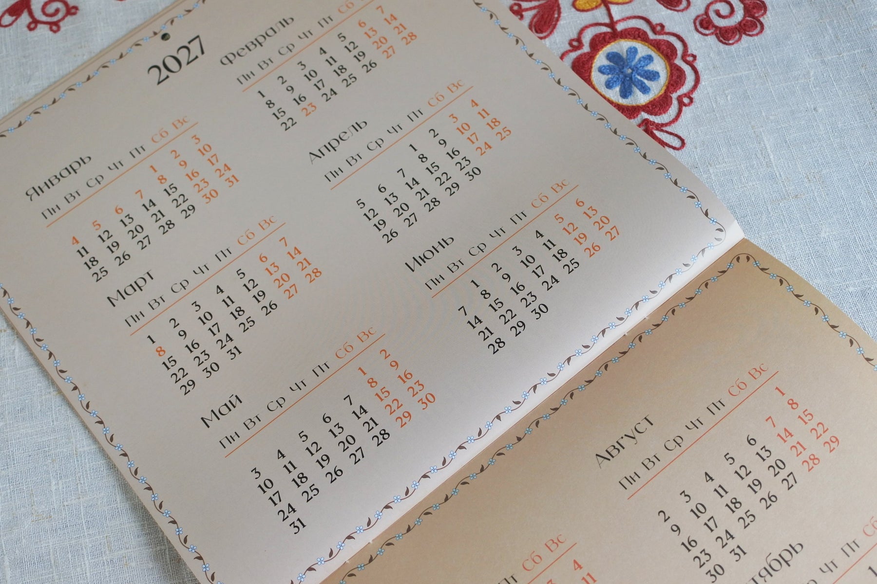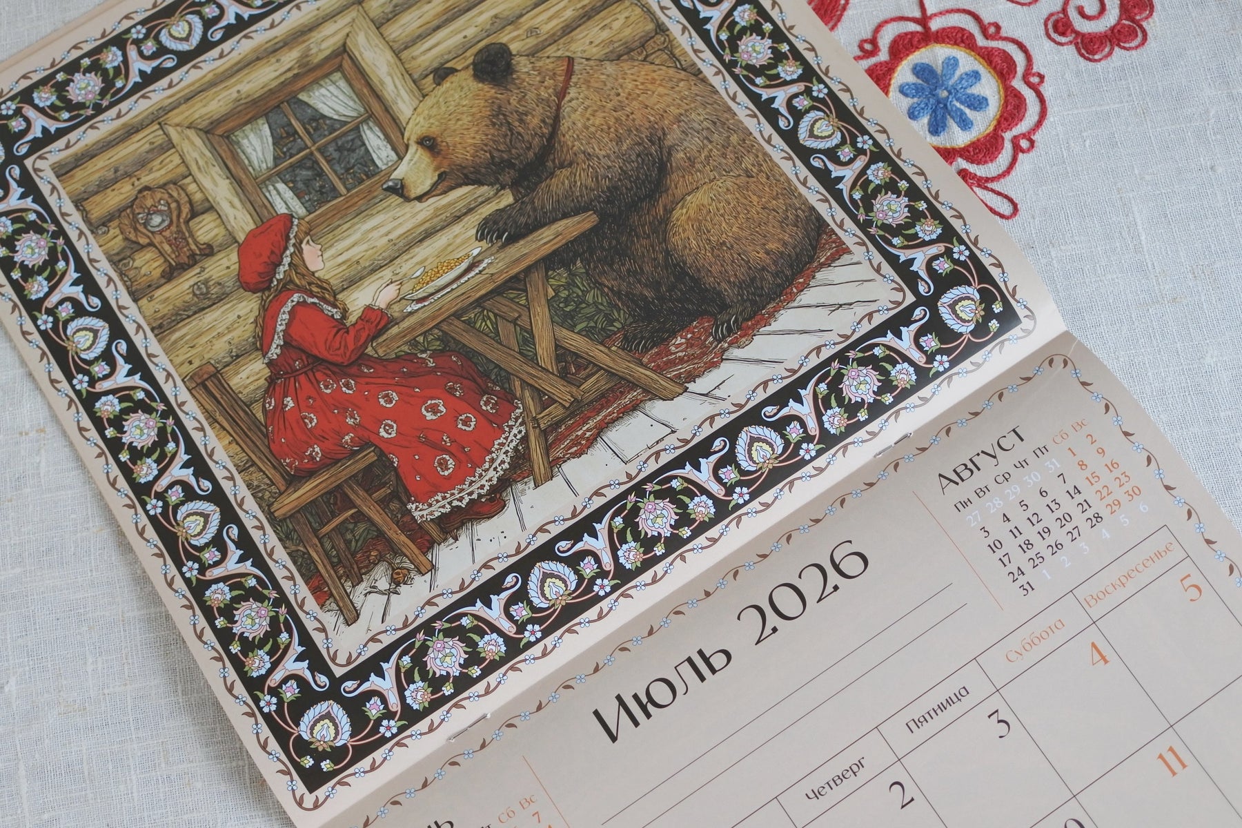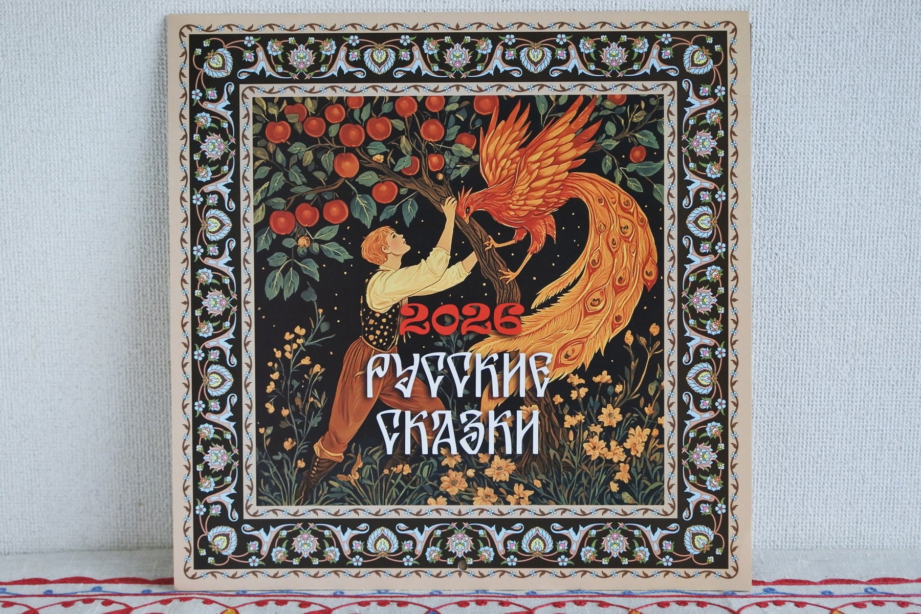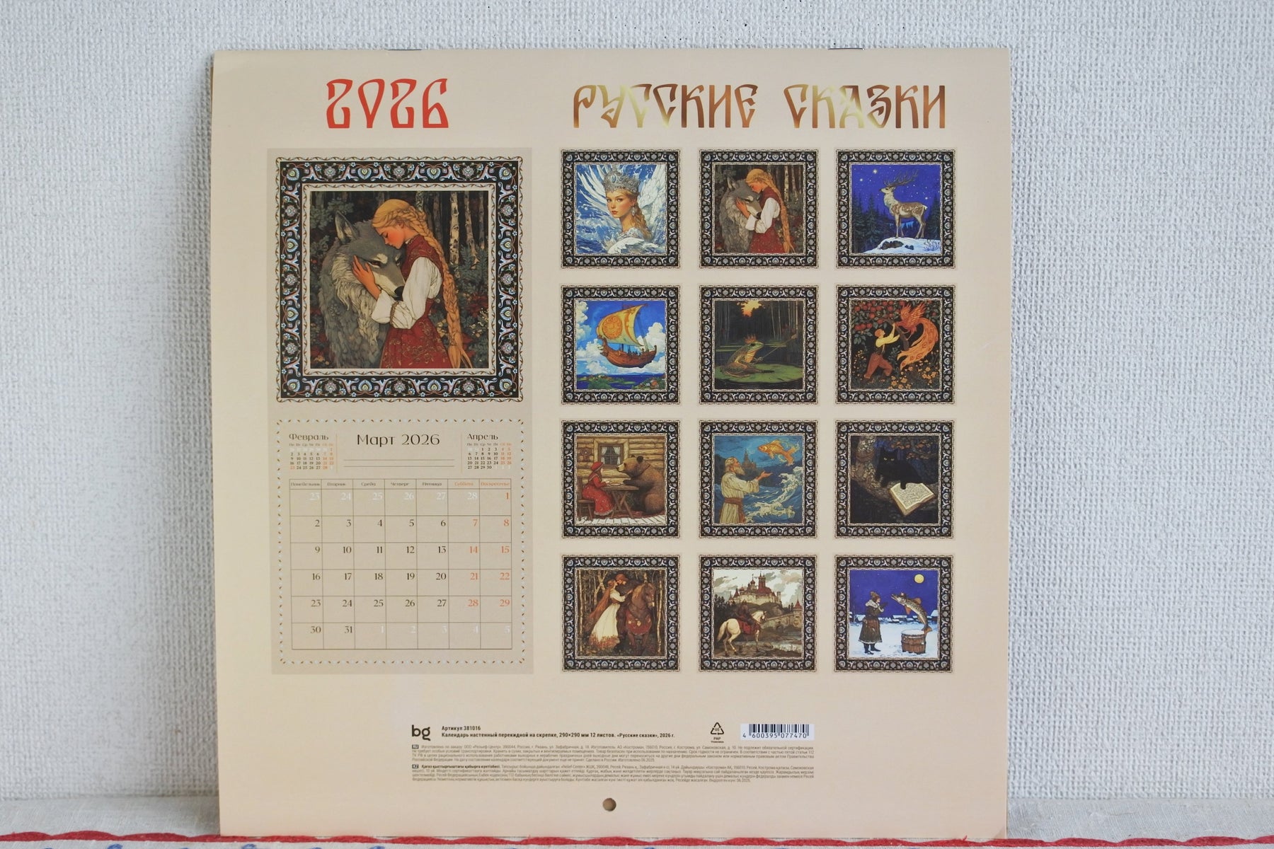 2026年版のロシアのカレンダーです。「カエルの王女」、「マーシャとくま」、「漁師と魚」など12枚の物語の挿絵が楽しめます。画像、暦それぞれ29.0x29.0cmで壁に掛けると58.0x29.0cmサイズになります。2027年の暦も付いています。