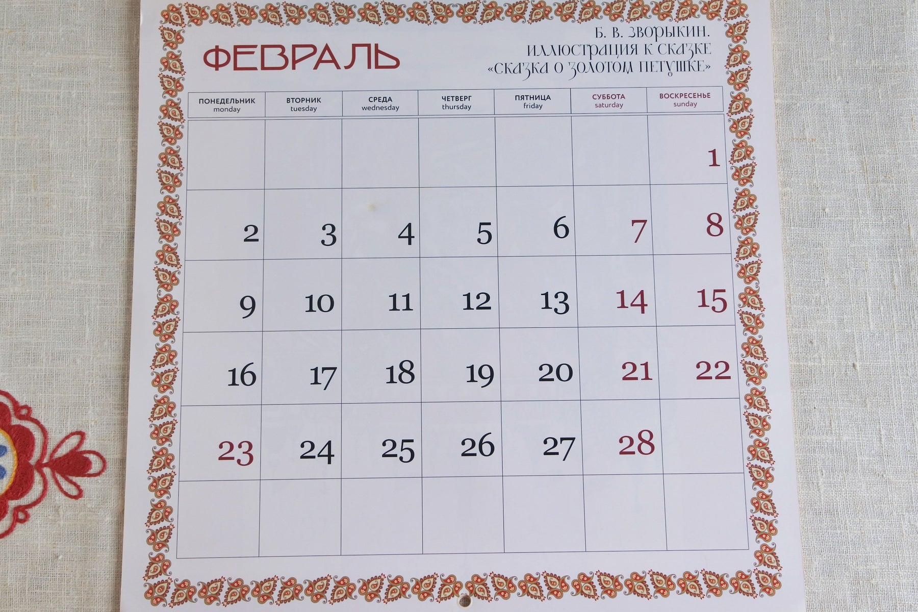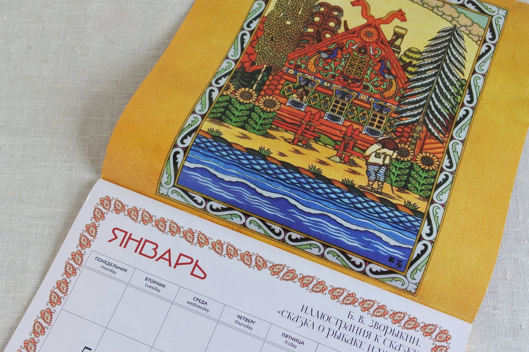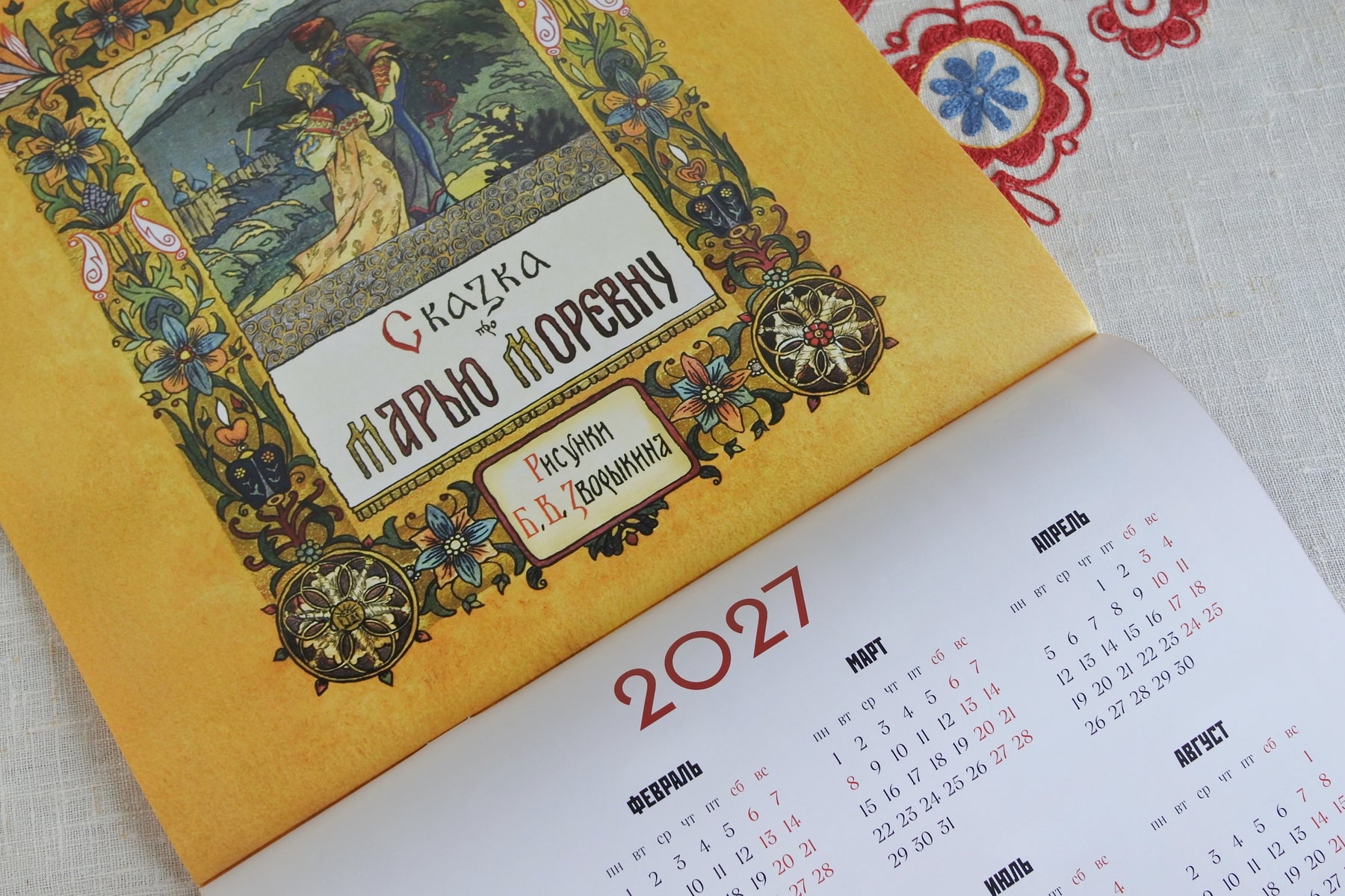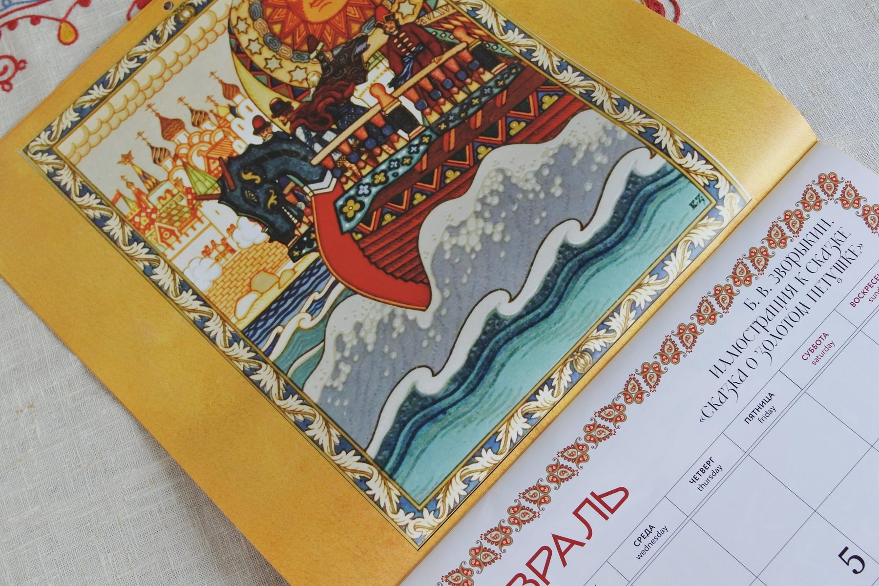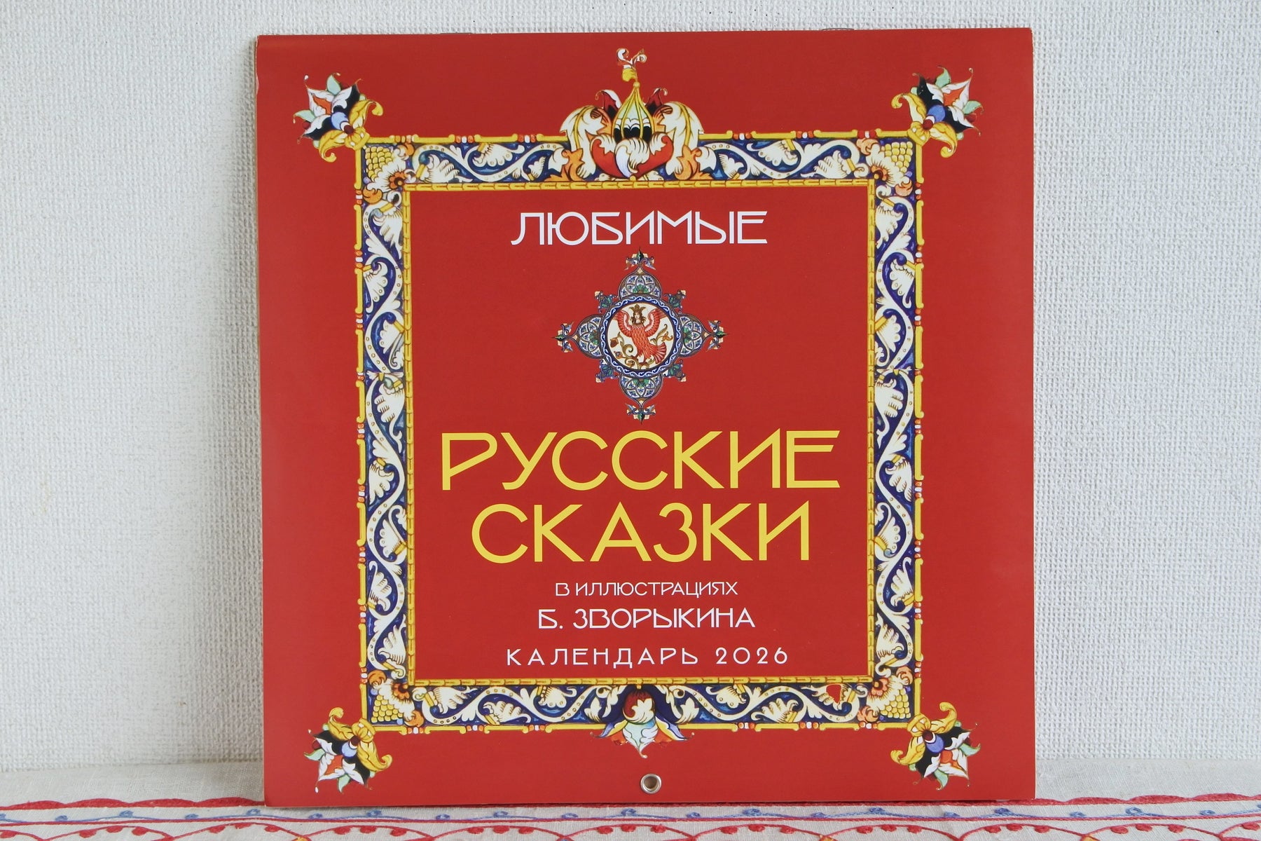 2026年版のロシアのカレンダーです。画家ボリス・ズヴァリーキン(1872〜1942)が描くロシアのおとぎ話。金鶏、サルタン王の物語、漁師と魚、死んだ王女と七人の勇士たち、 マリア・モレヴナ が描かれています。ひと月ひと月が待ち遠しいカレンダーです。