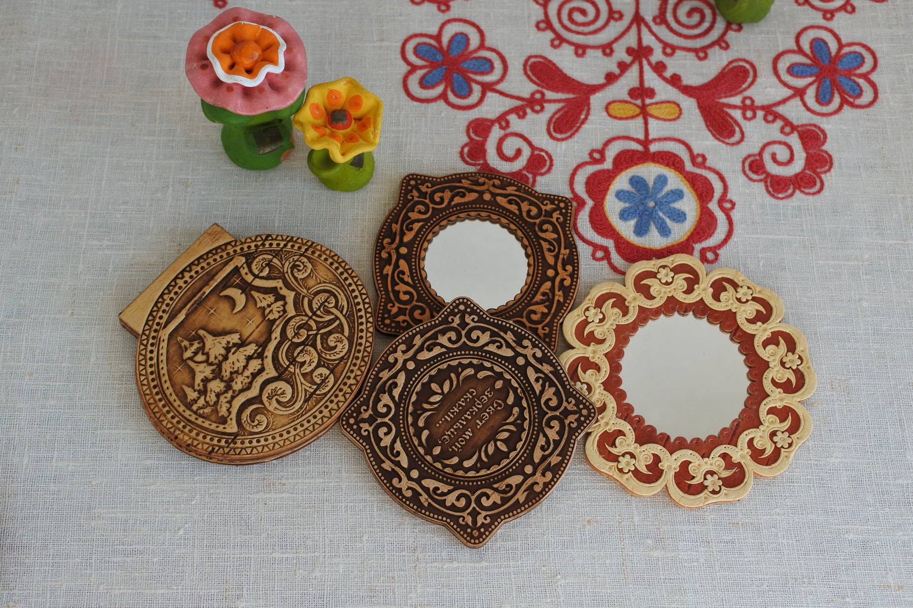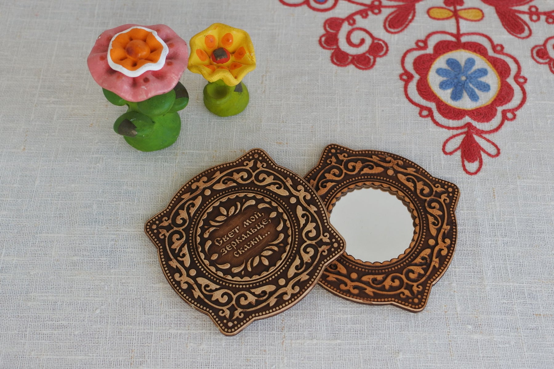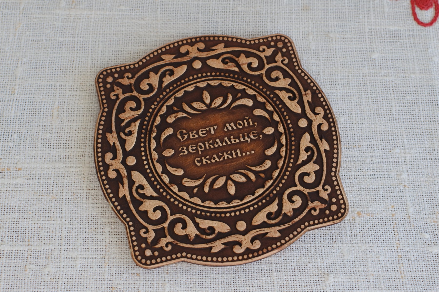 白樺の樹皮で作られる民芸品ベレスタ。おとぎ話に出てきそうな模様の美しいミラー。それもそのはず刻印されている文字は「私の光、鏡よ、教えておくれ・・・」。これはロシアの文豪プーシキンの「死んだ王女と7人の勇士」の物語の中で継母である王妃が魔法の鏡に向かって「この世で一番美しいのは誰か」と問う一節です。