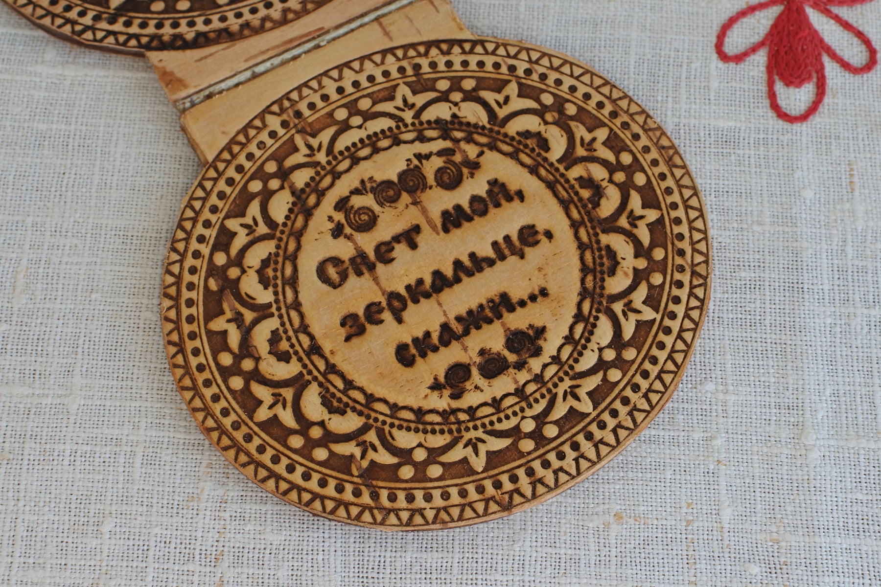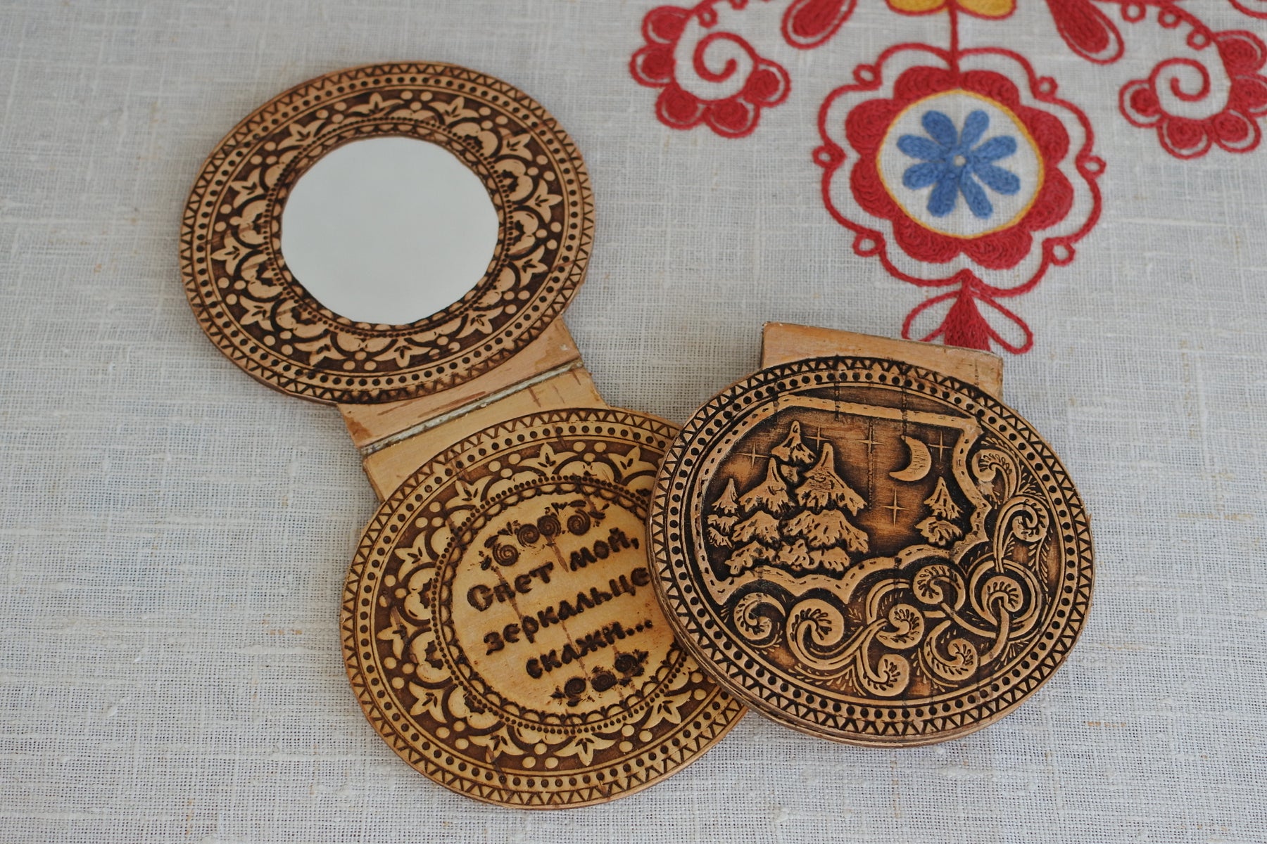 白樺の樹皮で作られる民芸品ベレスタのコンパクトタイプのミラー。シベリアの美しい原生林を照らす月。ツンと透き通った空気を感じます。