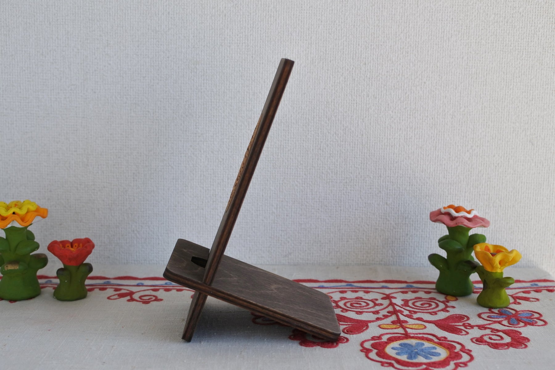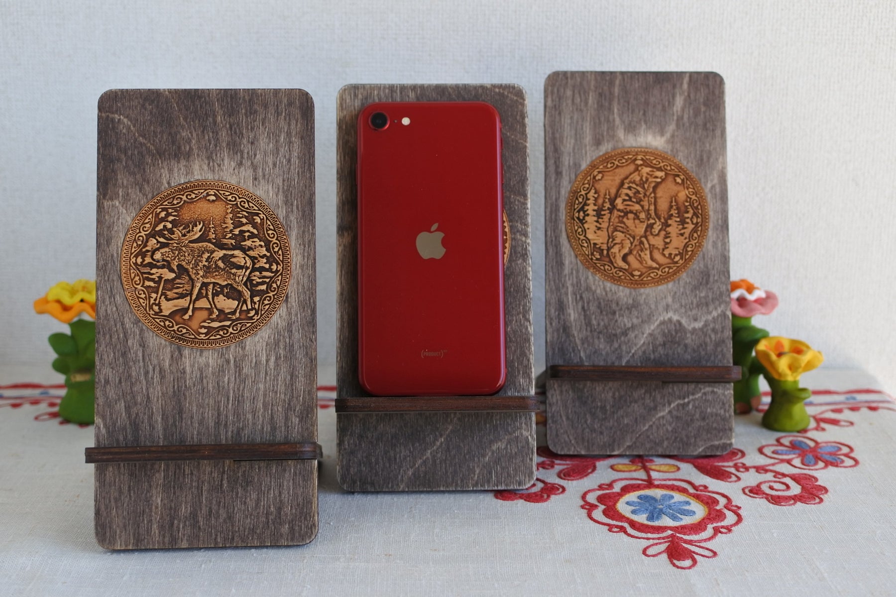 森の動物や景色を型押しした白樺樹皮が貼られたシベリア杉。その板を2枚組み立ててシベリアならではのモバイルスタンドが出来上がりました。充電コードを通せる仕組みもうれしい。携帯電話だけでなく大きめのタブレットもバランスも良く置くことができます。