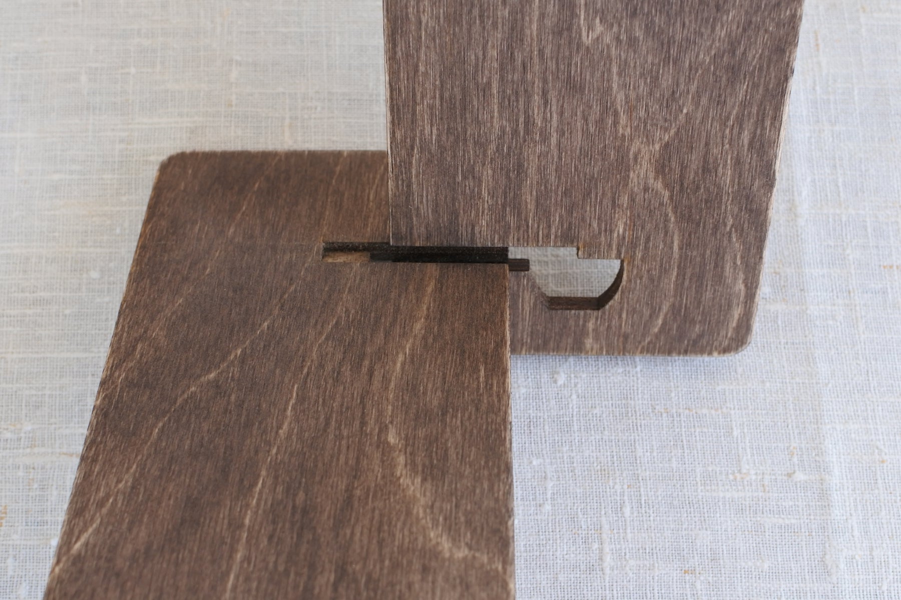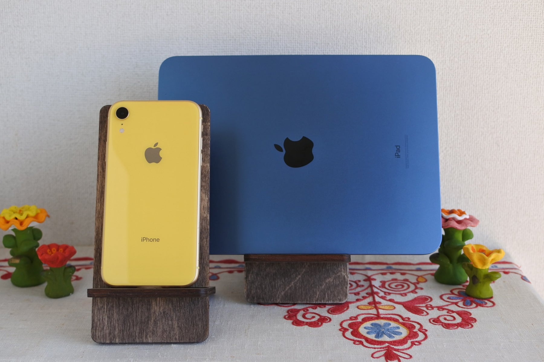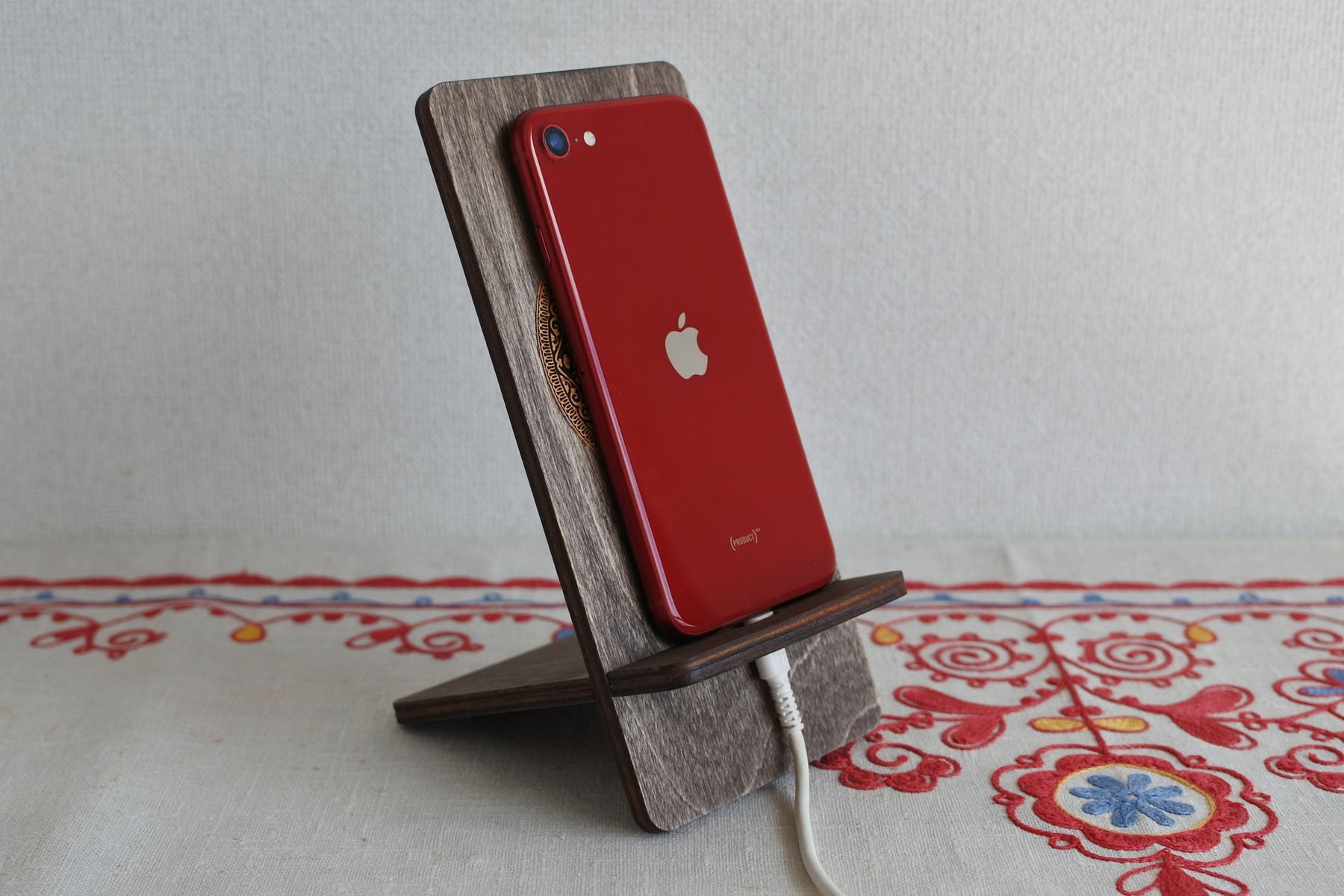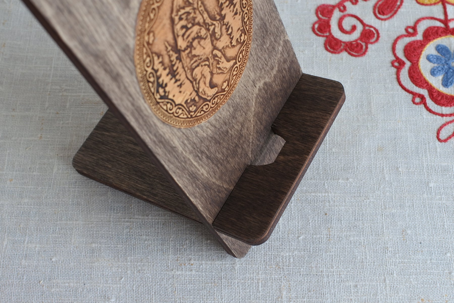森の動物や景色を型押しした白樺樹皮が貼られたシベリア杉。その板を2枚組み立ててシベリアならではのモバイルスタンドが出来上がりました。充電コードを通せる仕組みもうれしい。携帯電話だけでなく大きめのタブレットもバランスも良く置くことができます。