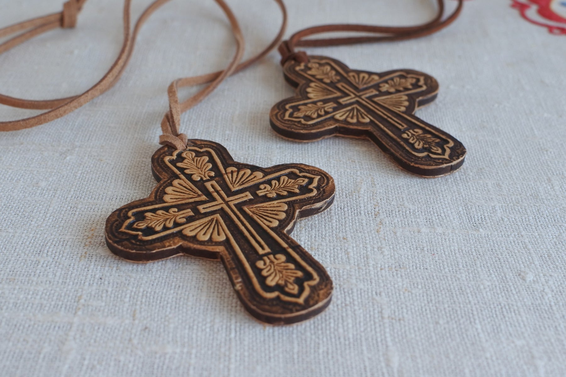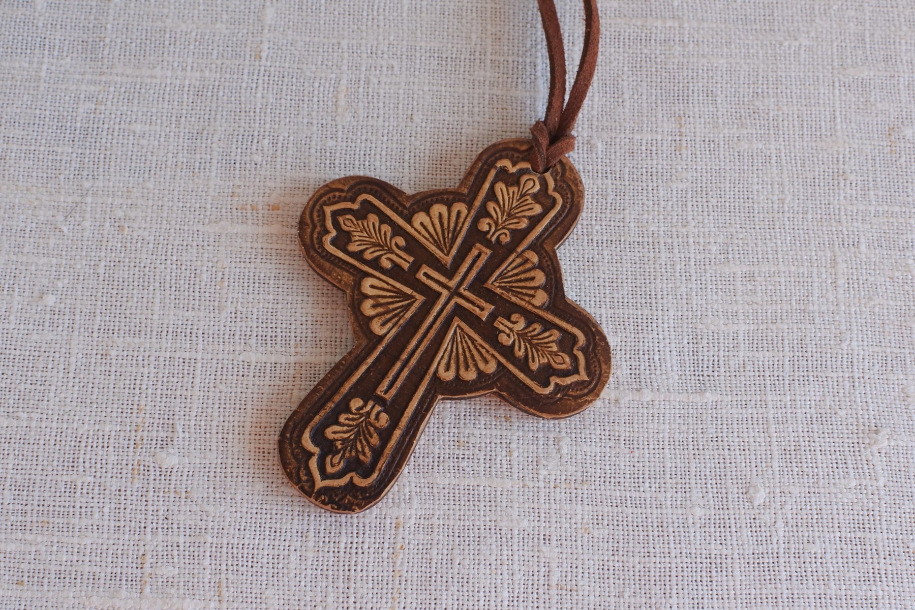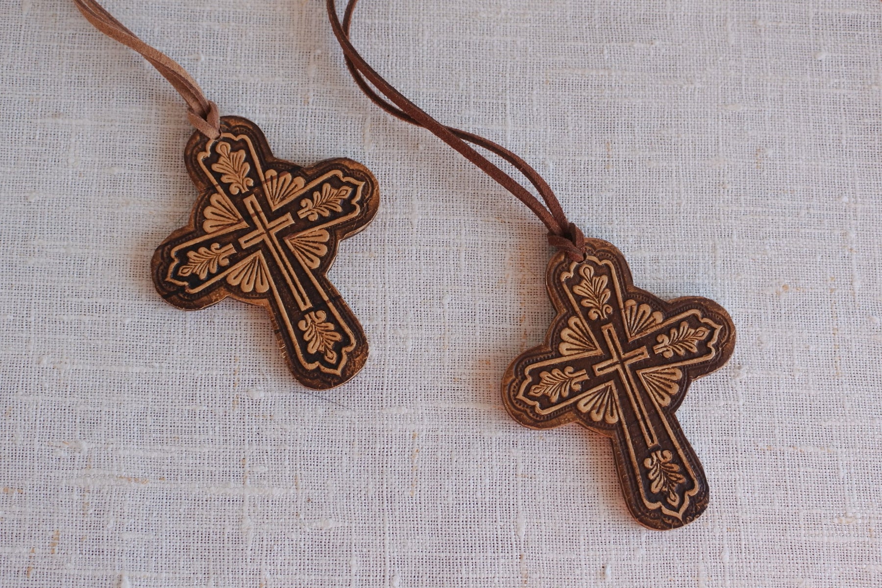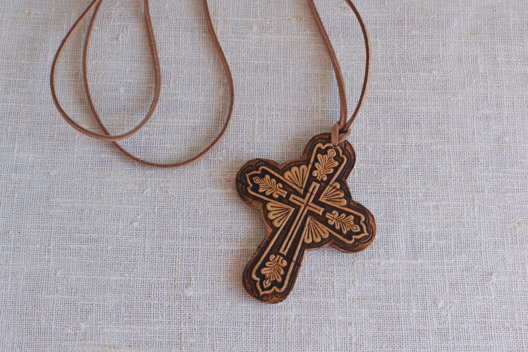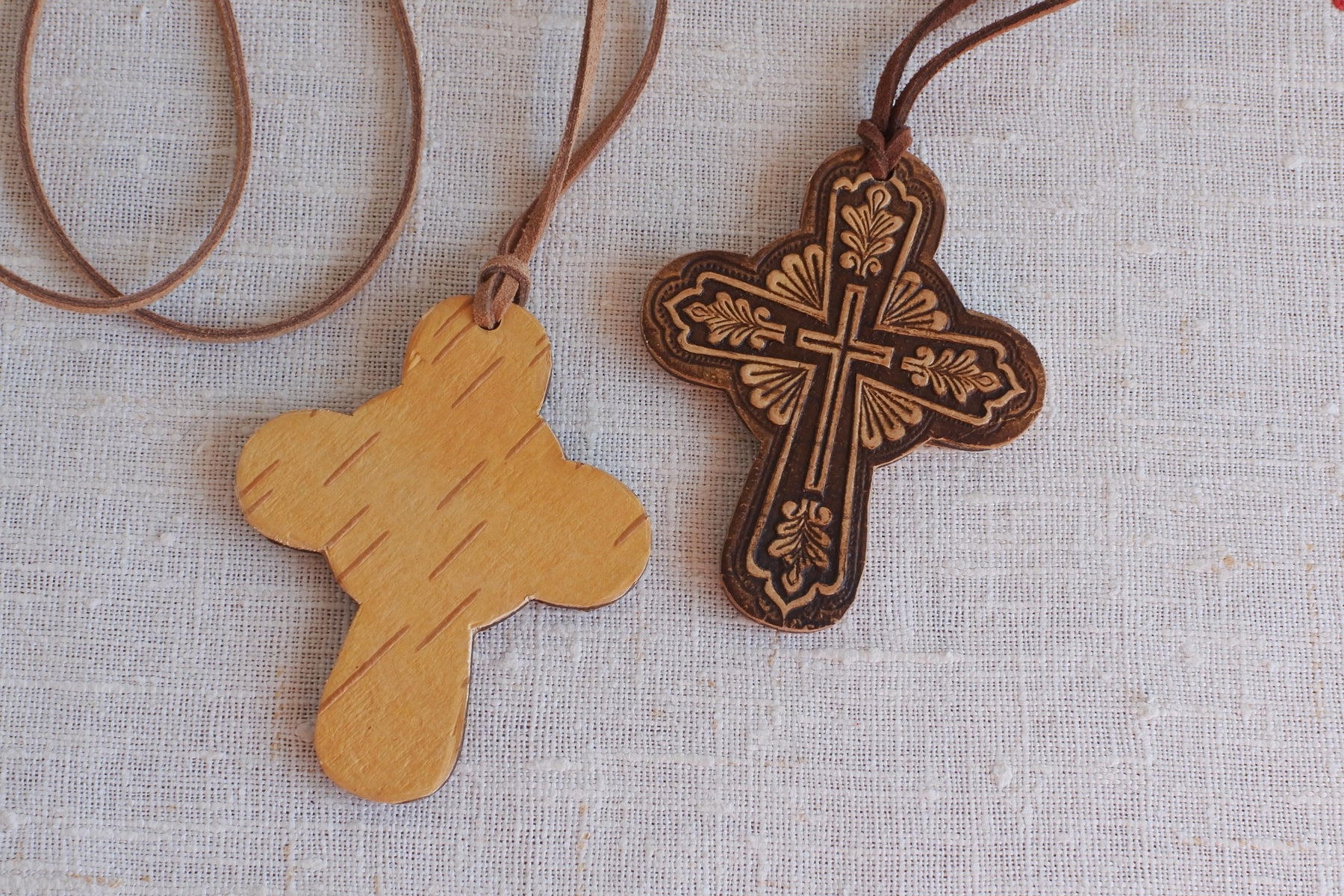 シべリアの白樺樹皮を使った十字架のネックレスです。十字架の中心から新芽が延び、花開く状態を表しています。これは再生、またキリストの復活を意味するデザインです。