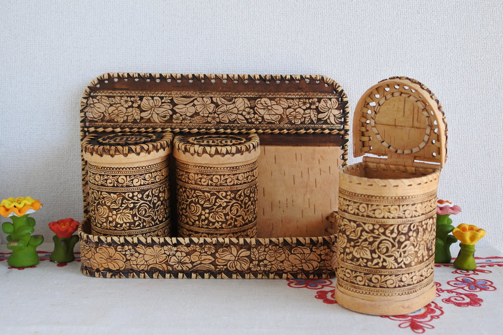 白樺の樹皮で作られるロシアの民芸品ベレスタ。湿気、乾燥に強く殺菌作用があると言われ古くから調味料入れに使われてきました。自然の風合いが楽しめるキッチン用品です。