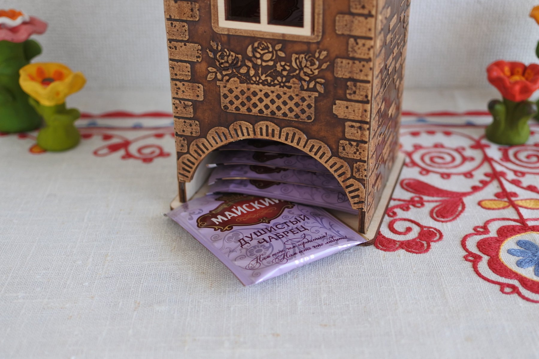 白樺樹皮ベレスタがお家になったティーバッグ用のストックホルダーです。一番下から1パックずつ取ることができます。屋根は取り外しができます。