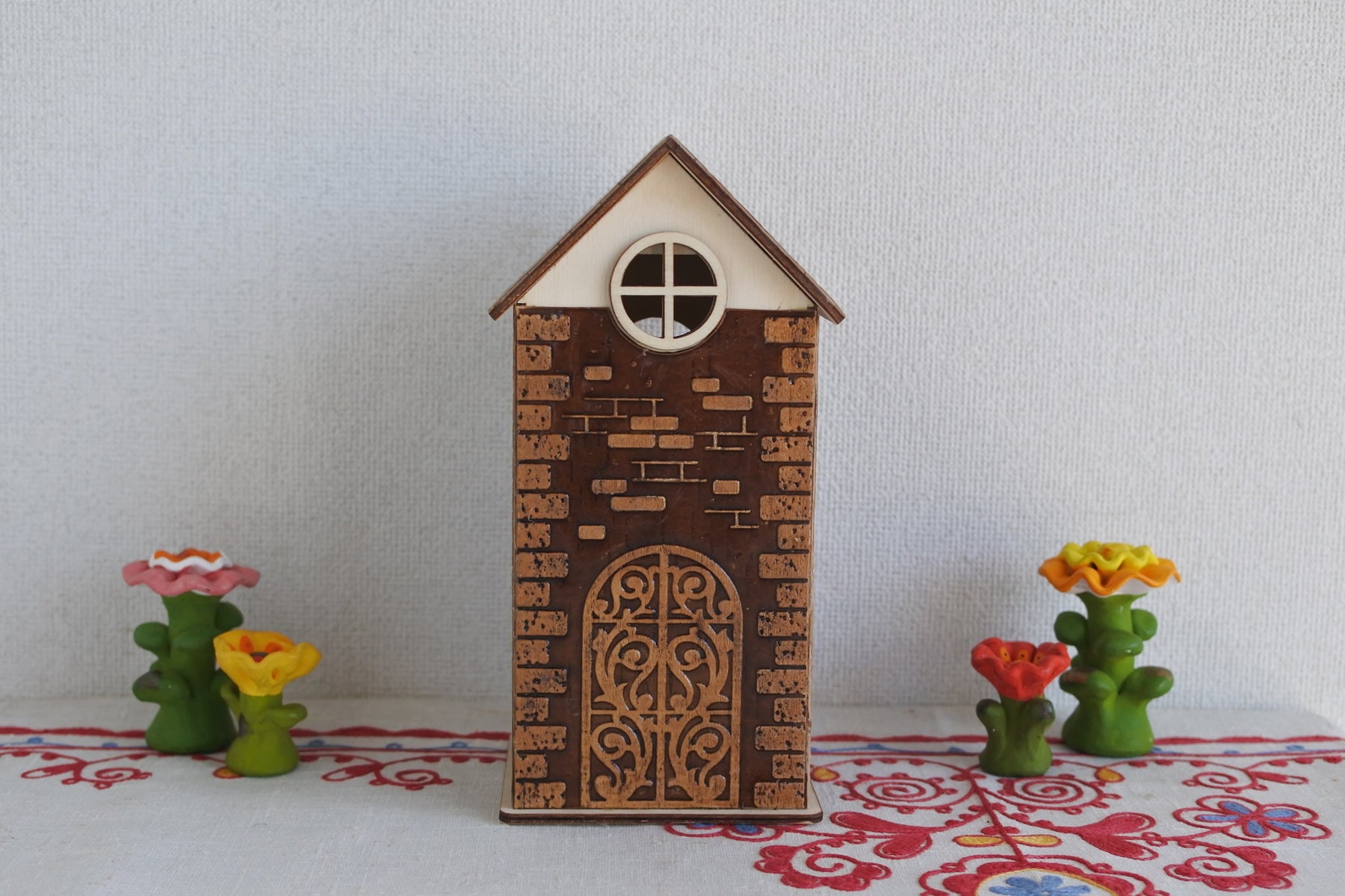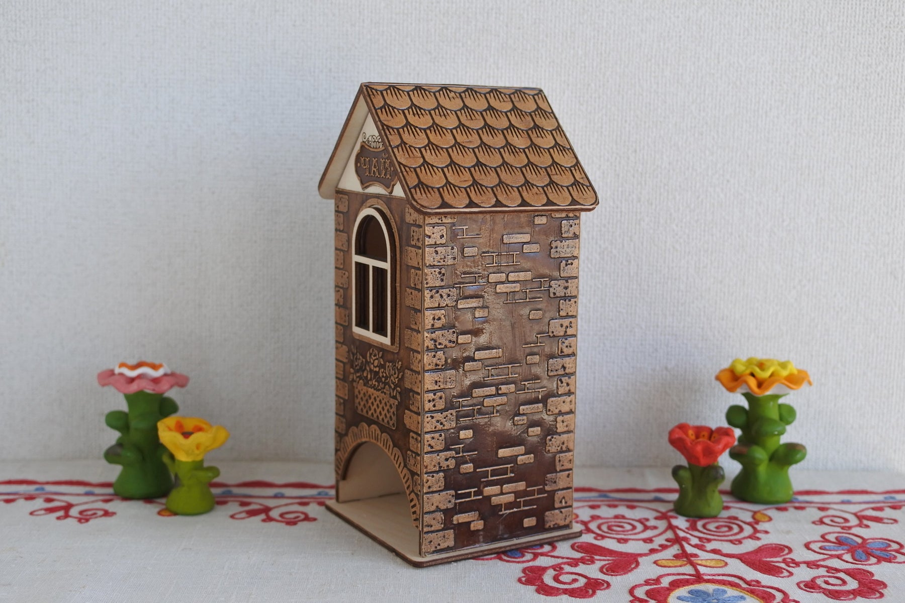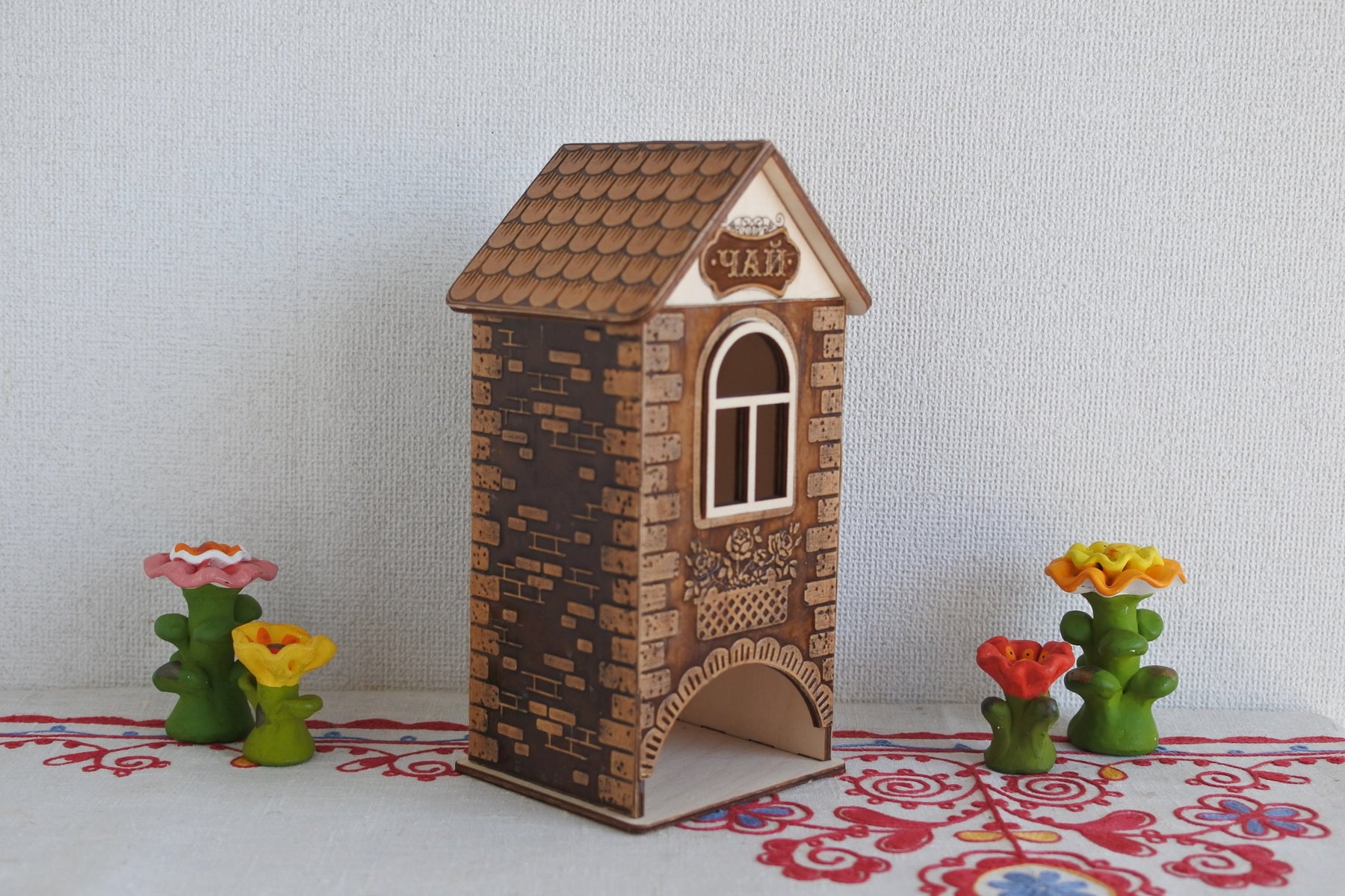 シベリア杉で枠組みされたお家に瓦やレンガ、バルコニーに飾られた花を型押しで模様付けされた白樺樹皮が貼られています。
