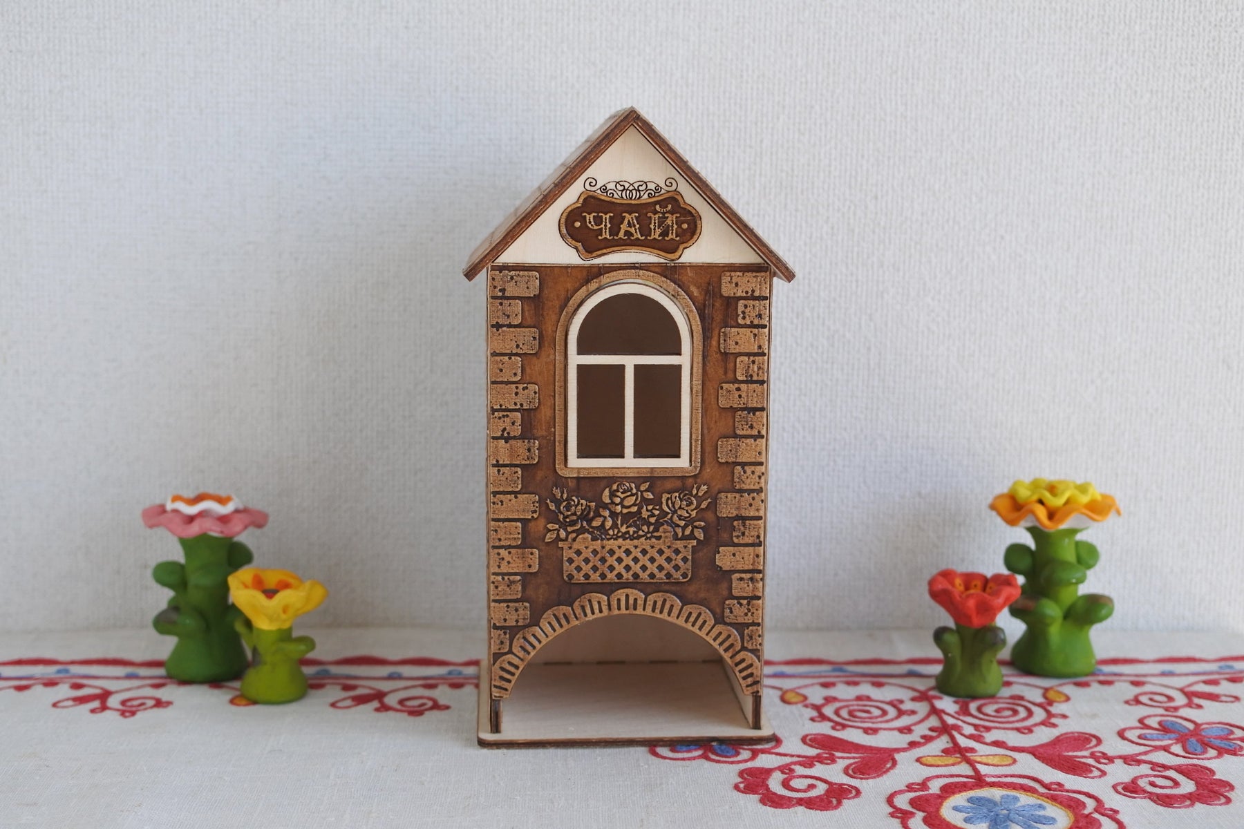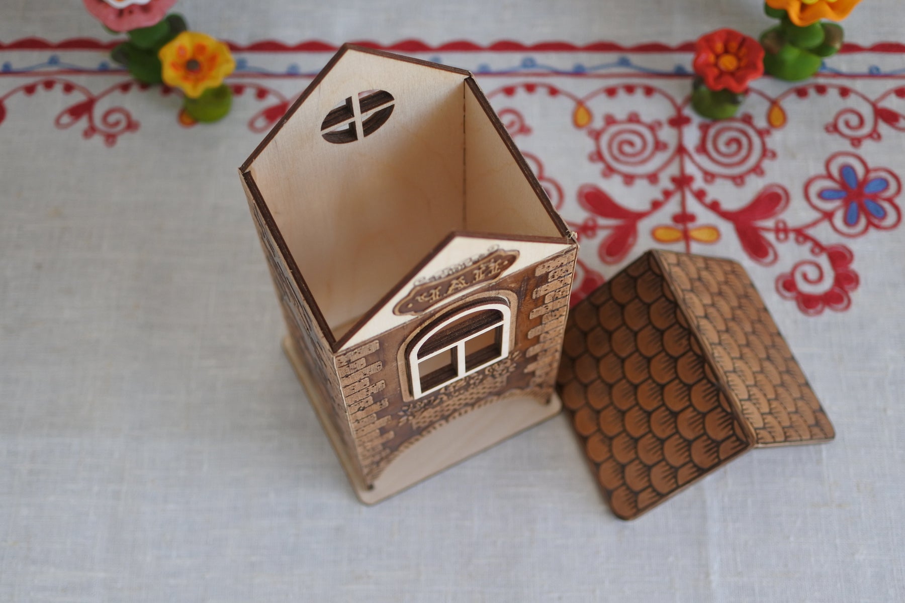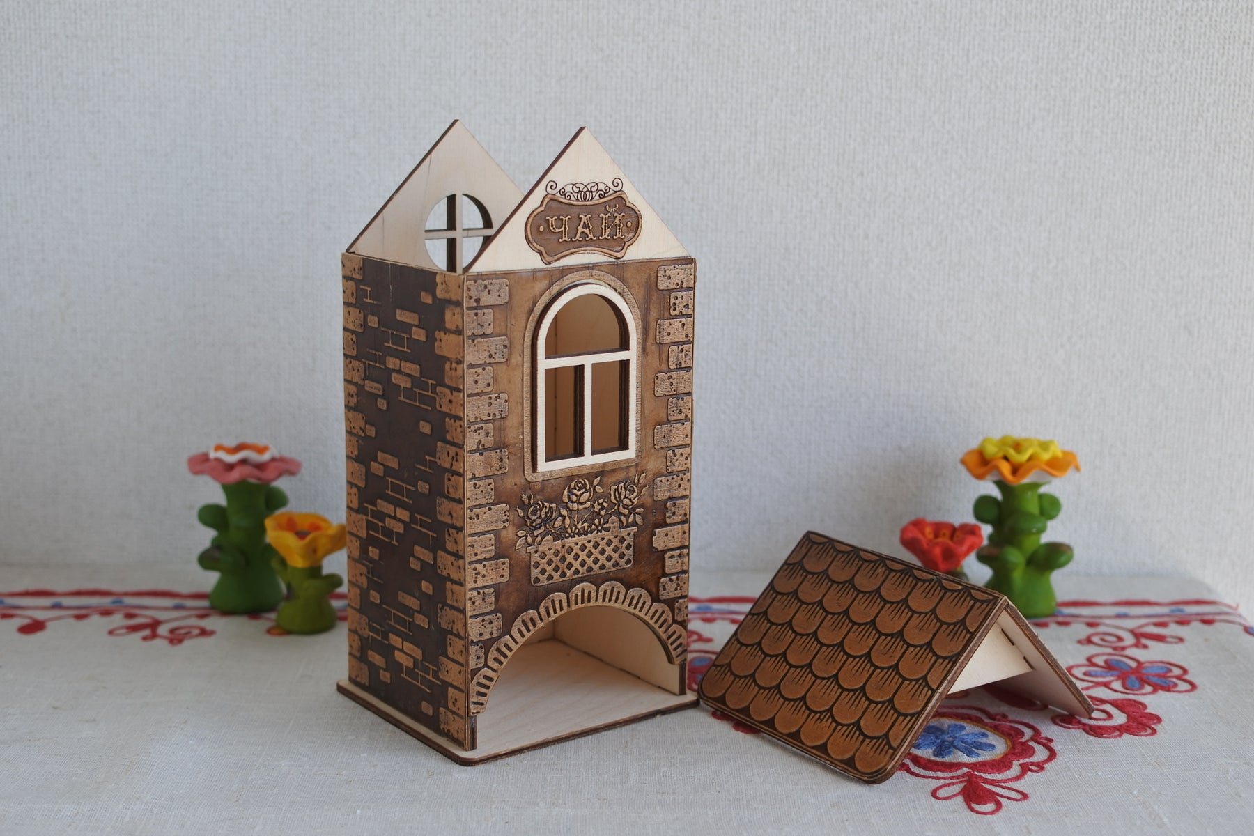 シベリア杉で枠組みされたお家に瓦やレンガ、バルコニーに飾られた花を型押しで模様付けされた白樺樹皮が貼られています。
