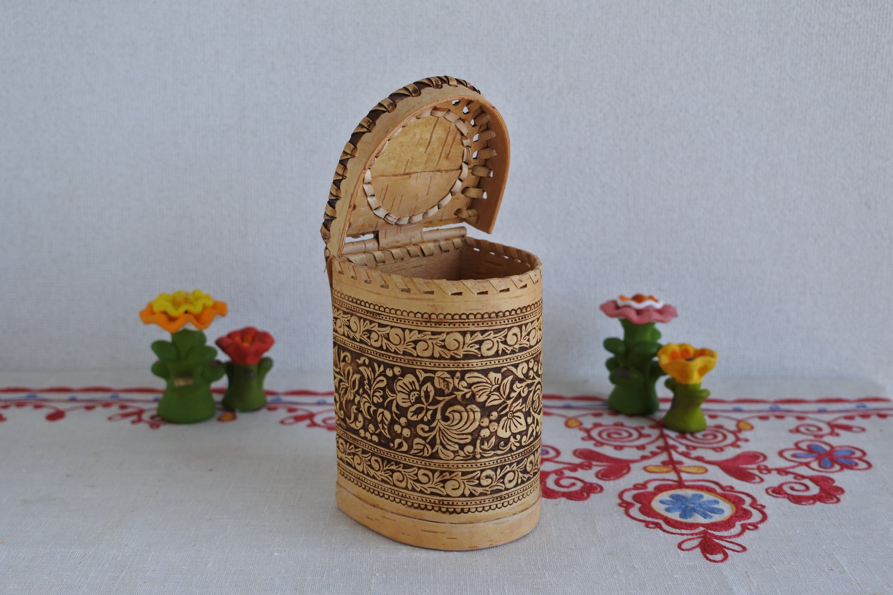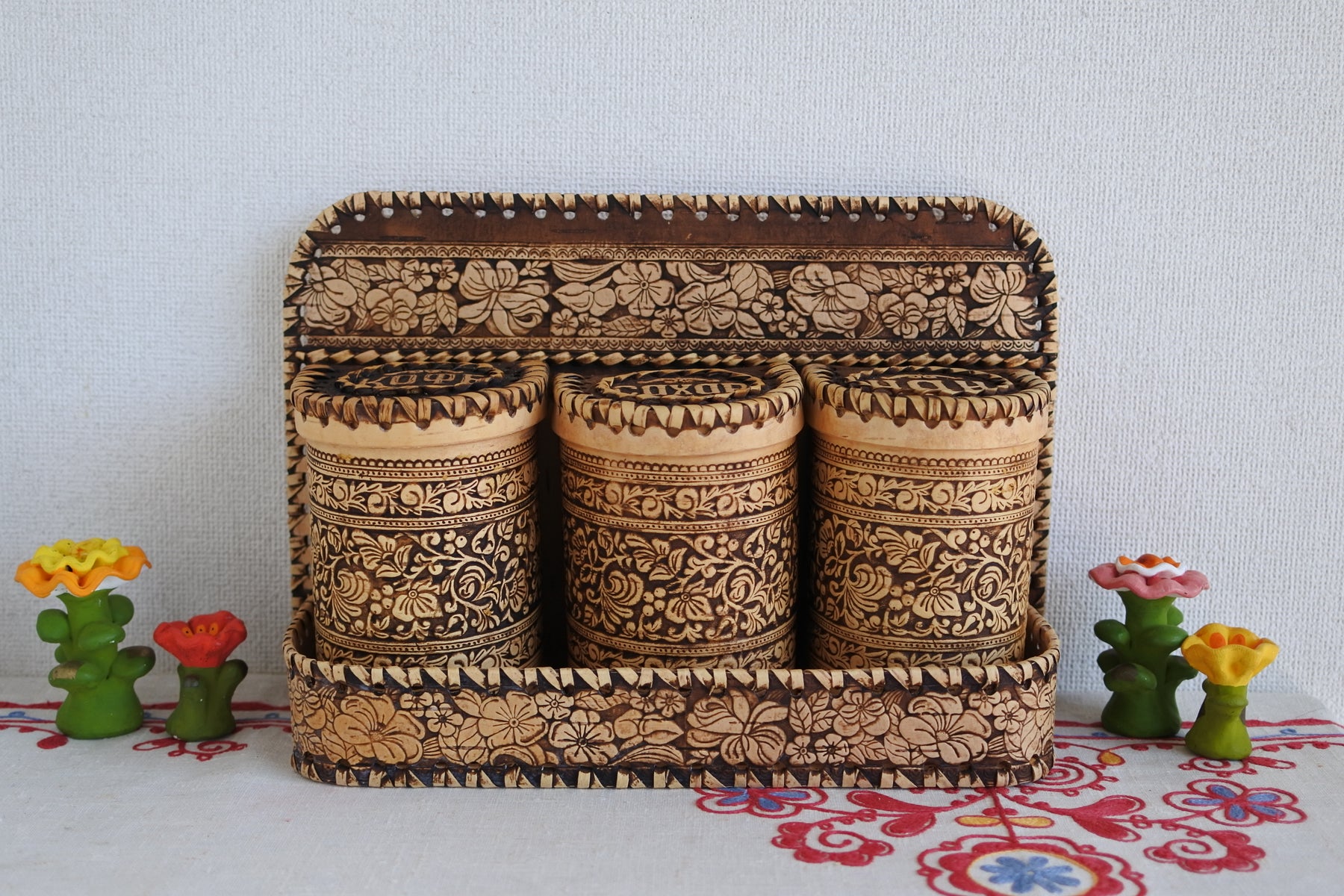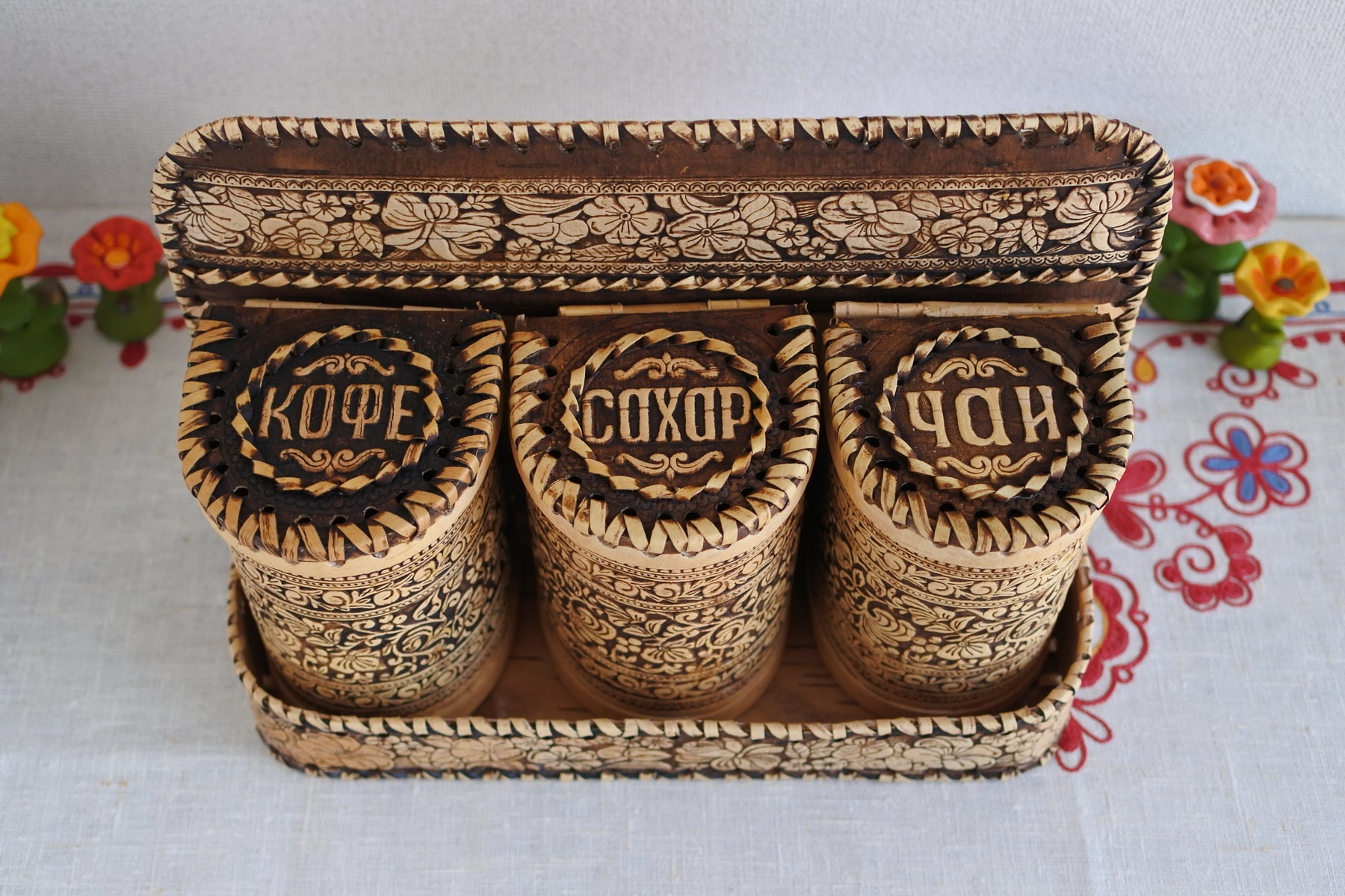白樺樹皮は湿気、乾燥に強くロシアでは古くから保存容器として使われてきました。シベリアの森のキャニスター。ロシア語で「コーヒー」、「砂糖」、「紅茶」と記されています。 蓋はパカッと開きますが縁をかがっているのでしっかりと閉まるので安心です。