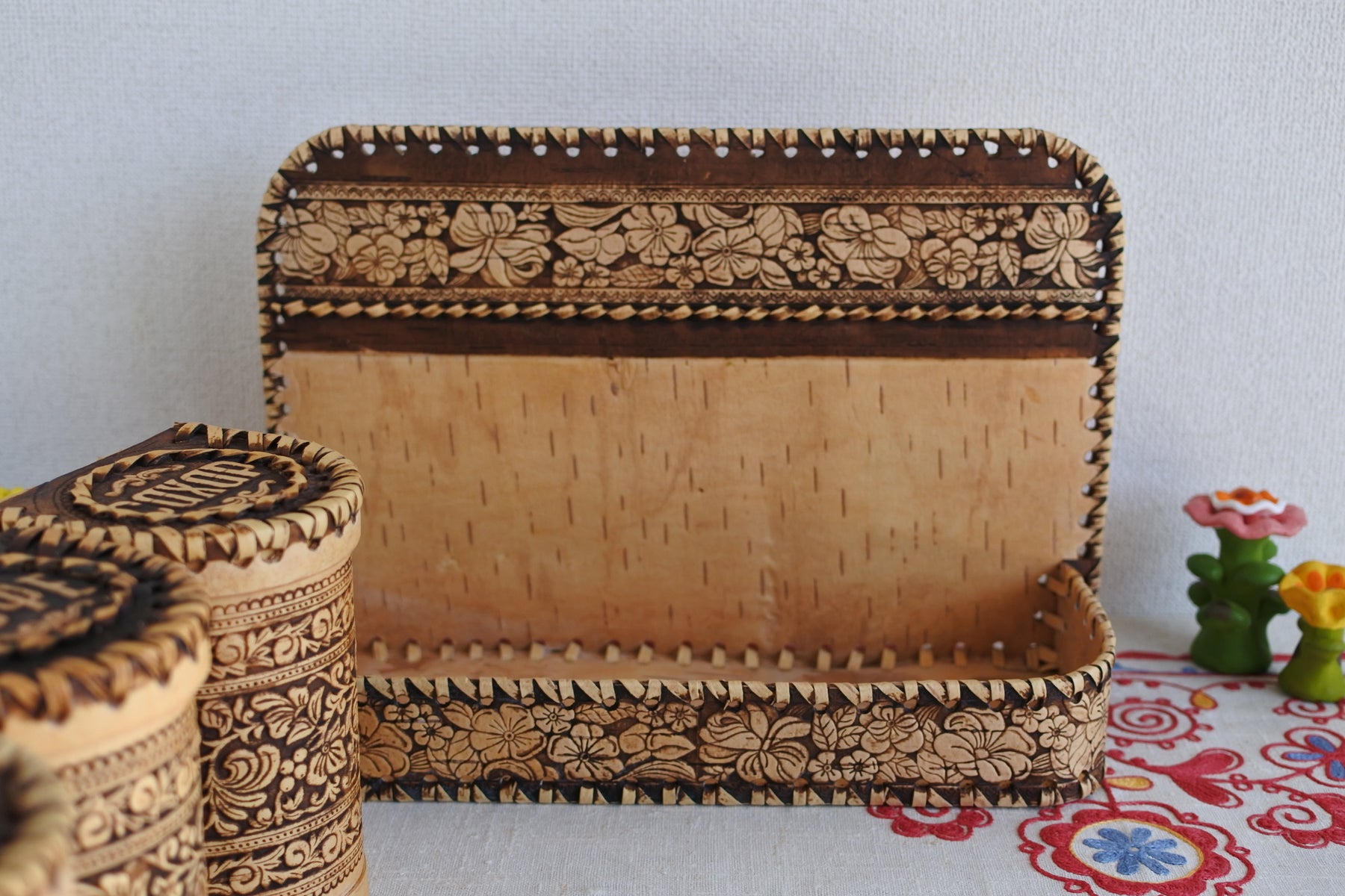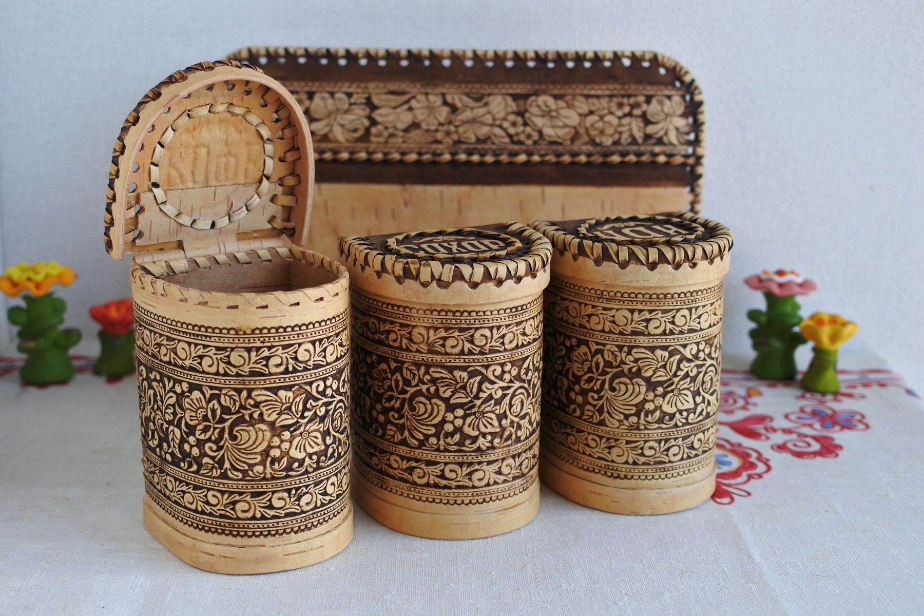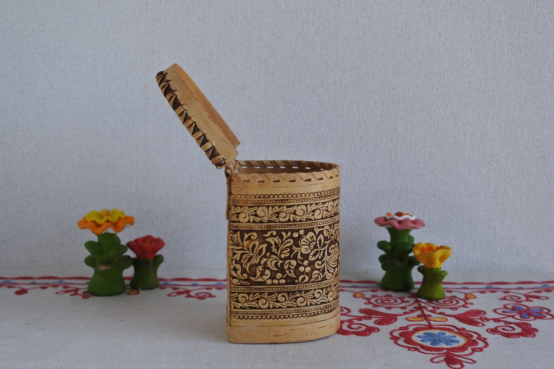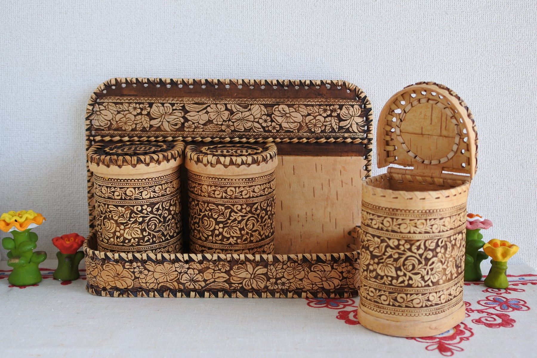 白樺樹皮は湿気、乾燥に強くロシアでは古くから保存容器として使われてきました。シベリアの森のキャニスター。ロシア語で「コーヒー」、「砂糖」、「紅茶」と記されています。 蓋はパカッと開きますが縁をかがっているのでしっかりと閉まるので安心です。