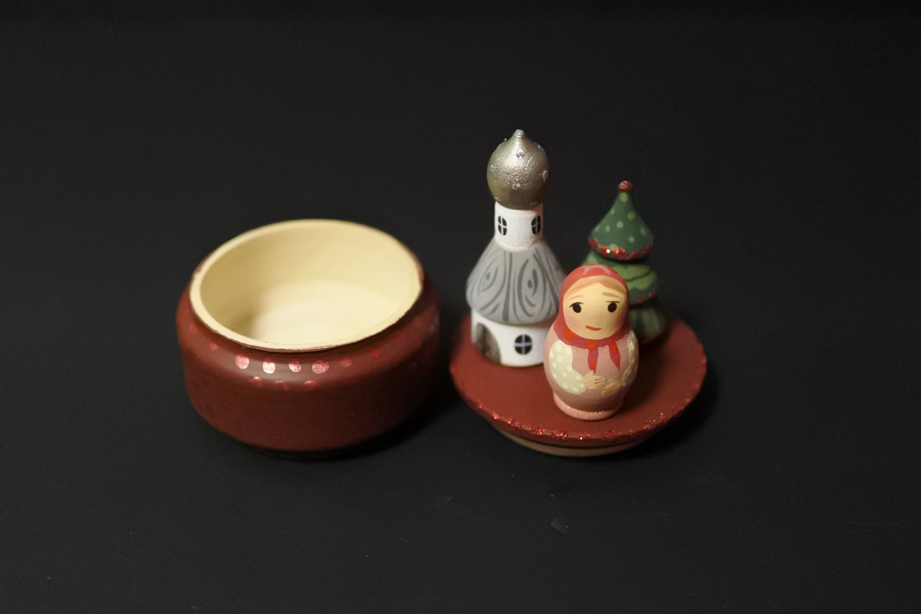 マトリョーシカ作家オーリャ・ロバノワのクリスマスの小箱です。箱の上にはマトリョーシカと教会ともみの木。もみの木や箱の蓋の縁にはキラキラと光るラメの装飾も施してあります。