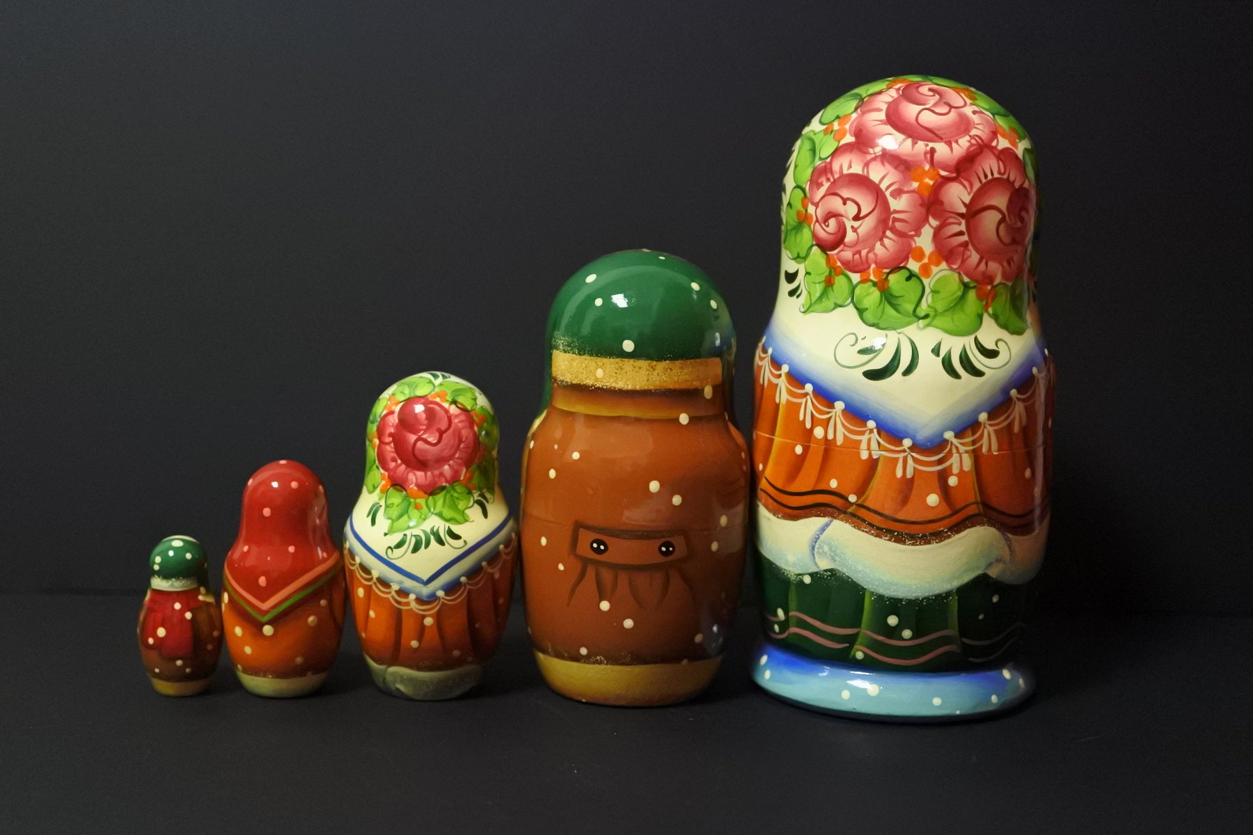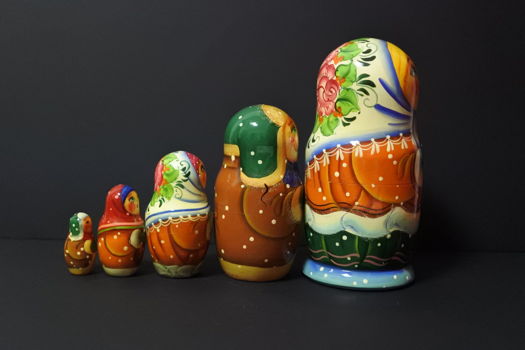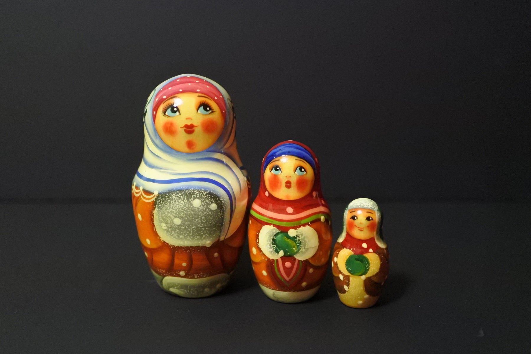 雪の日に冬支度の買い物に行く家族のマトリョーシカ。ミトンやマフ、プラトークにシャープカをかぶって防寒もしっかりと。ロシアの冬は厳しくとも楽しさもあたたかさもいっぱいです。