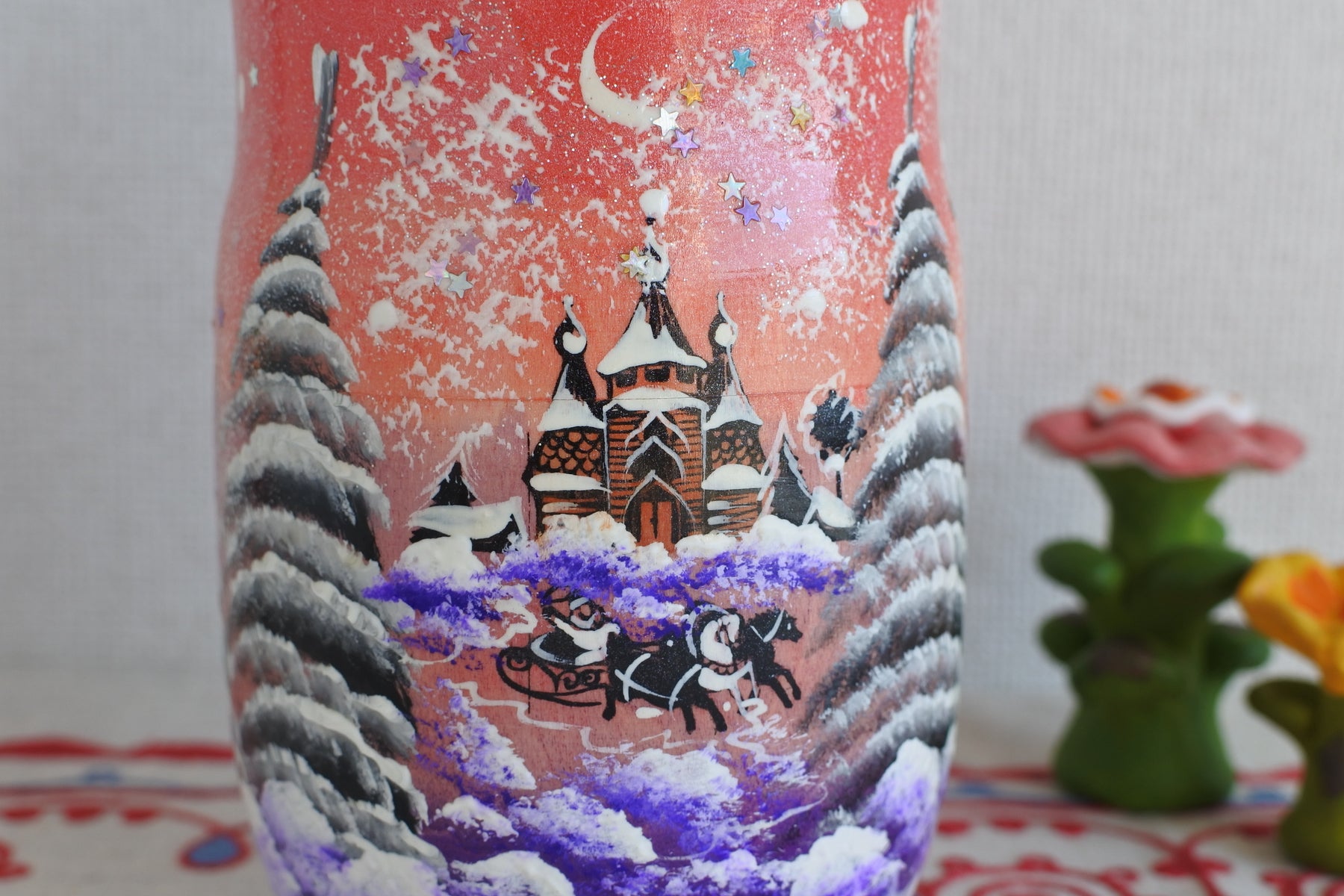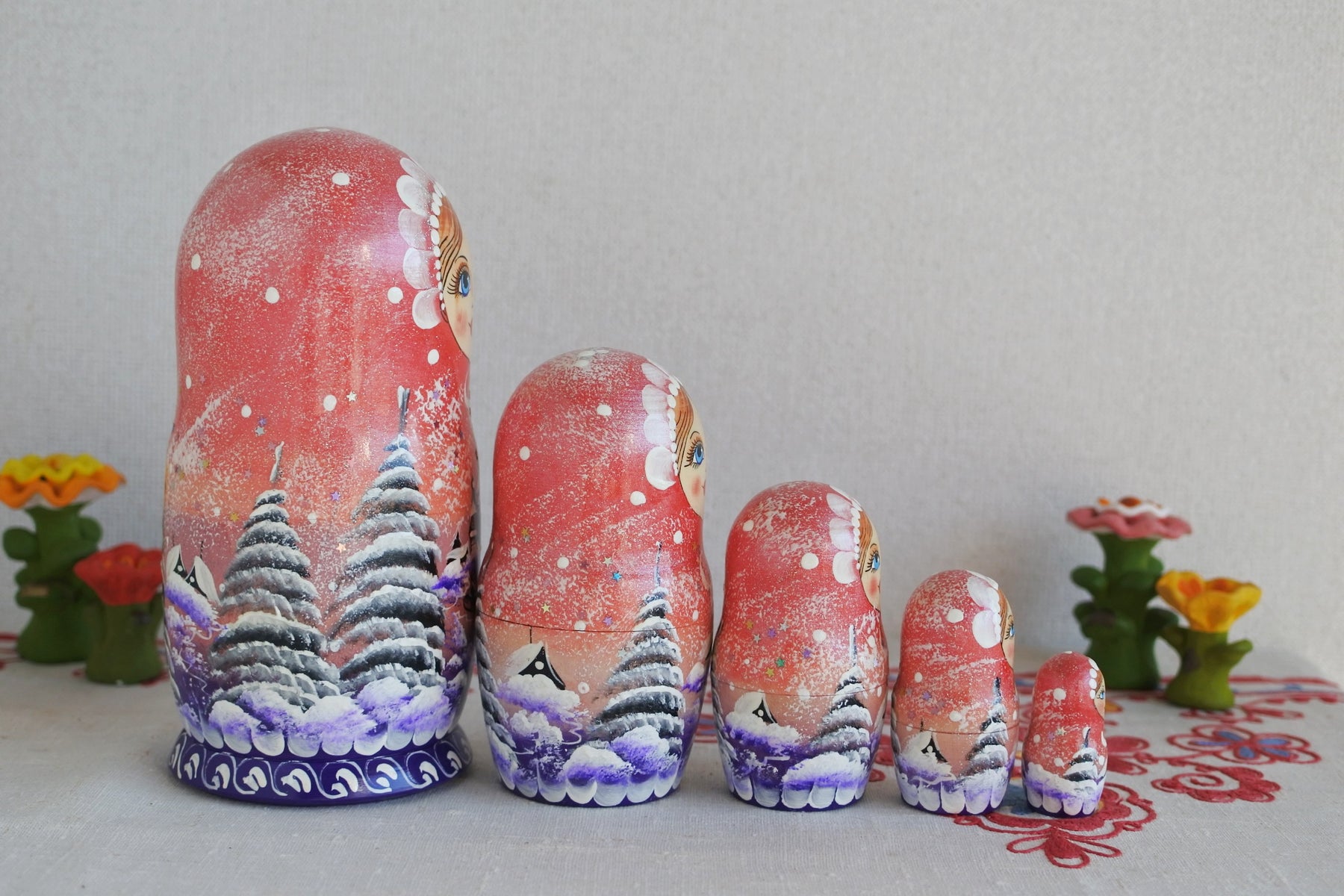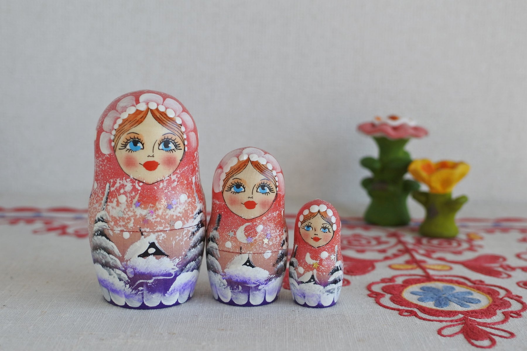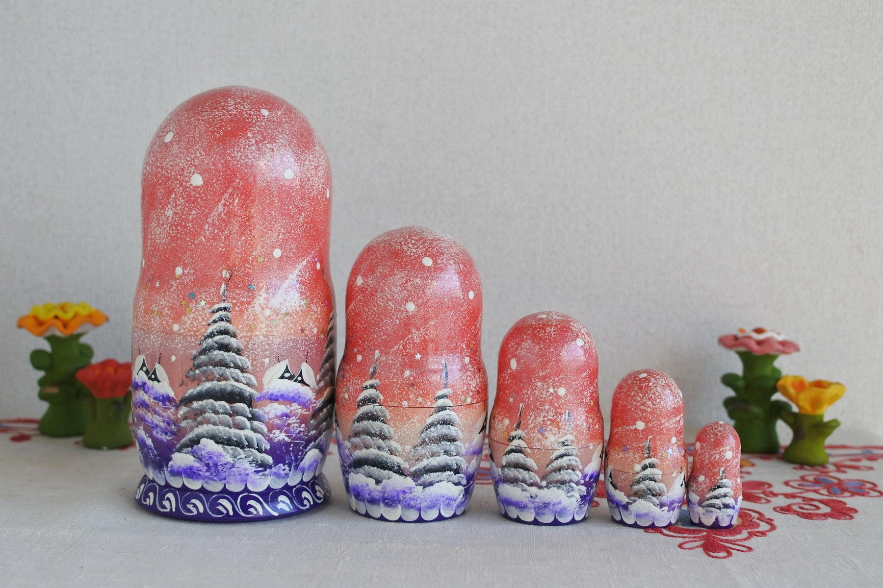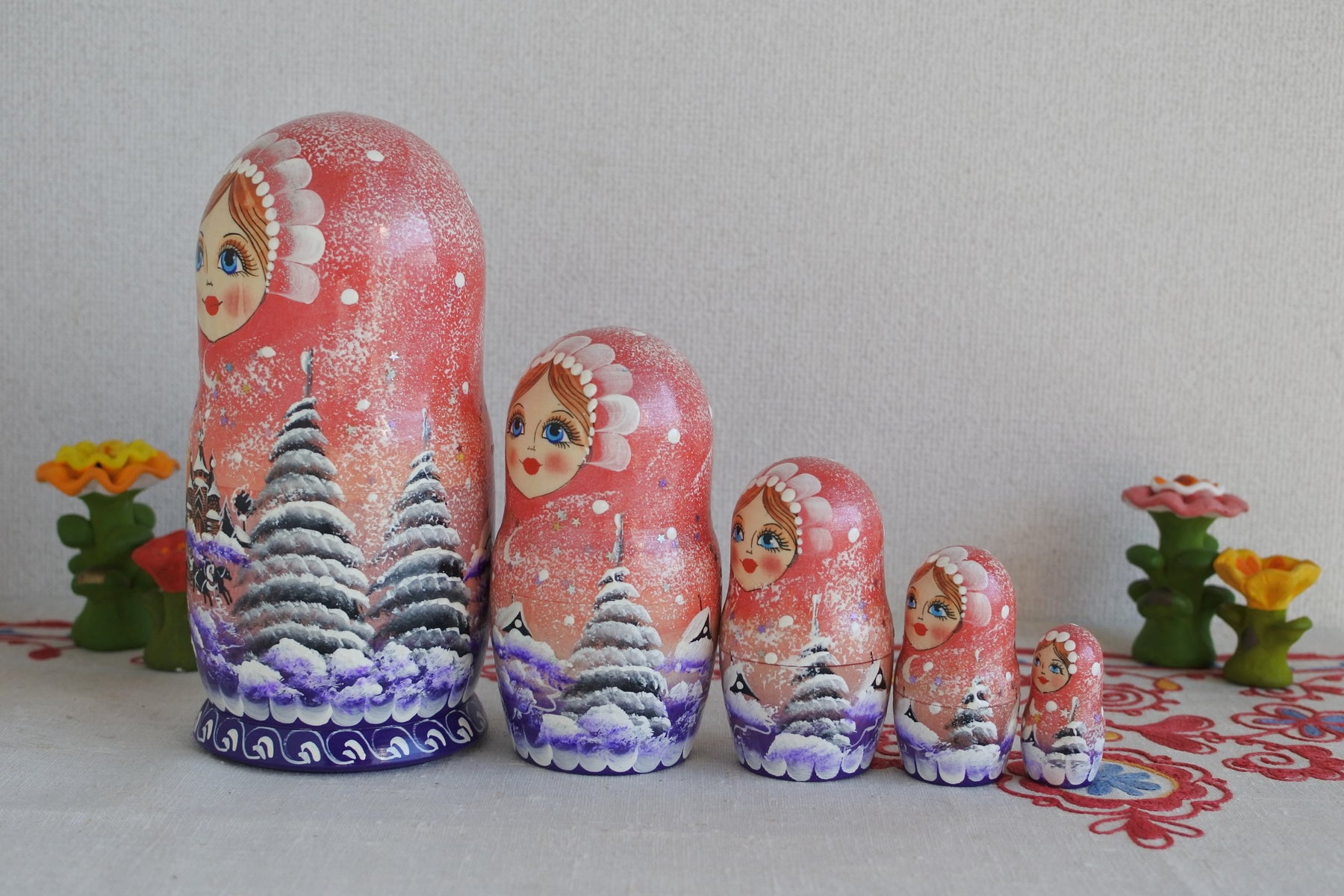 雪の降る夜空を眺めながら雪原を駆け抜けるトロイカ。見守るように佇むロシア正教会。大きな青い瞳を輝かせる5人のマトリョーシカのあたたかい頬笑みに癒しを感じます。