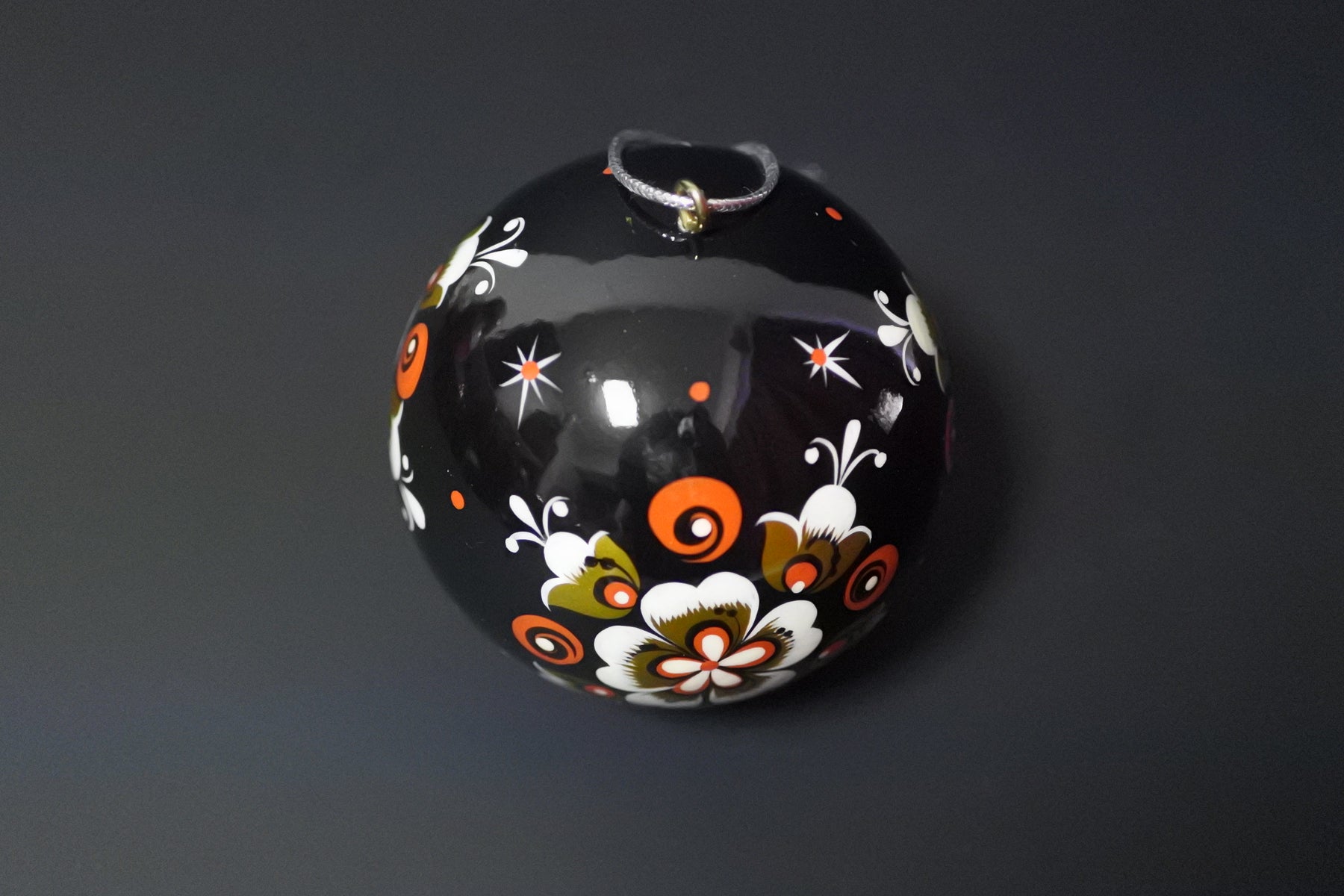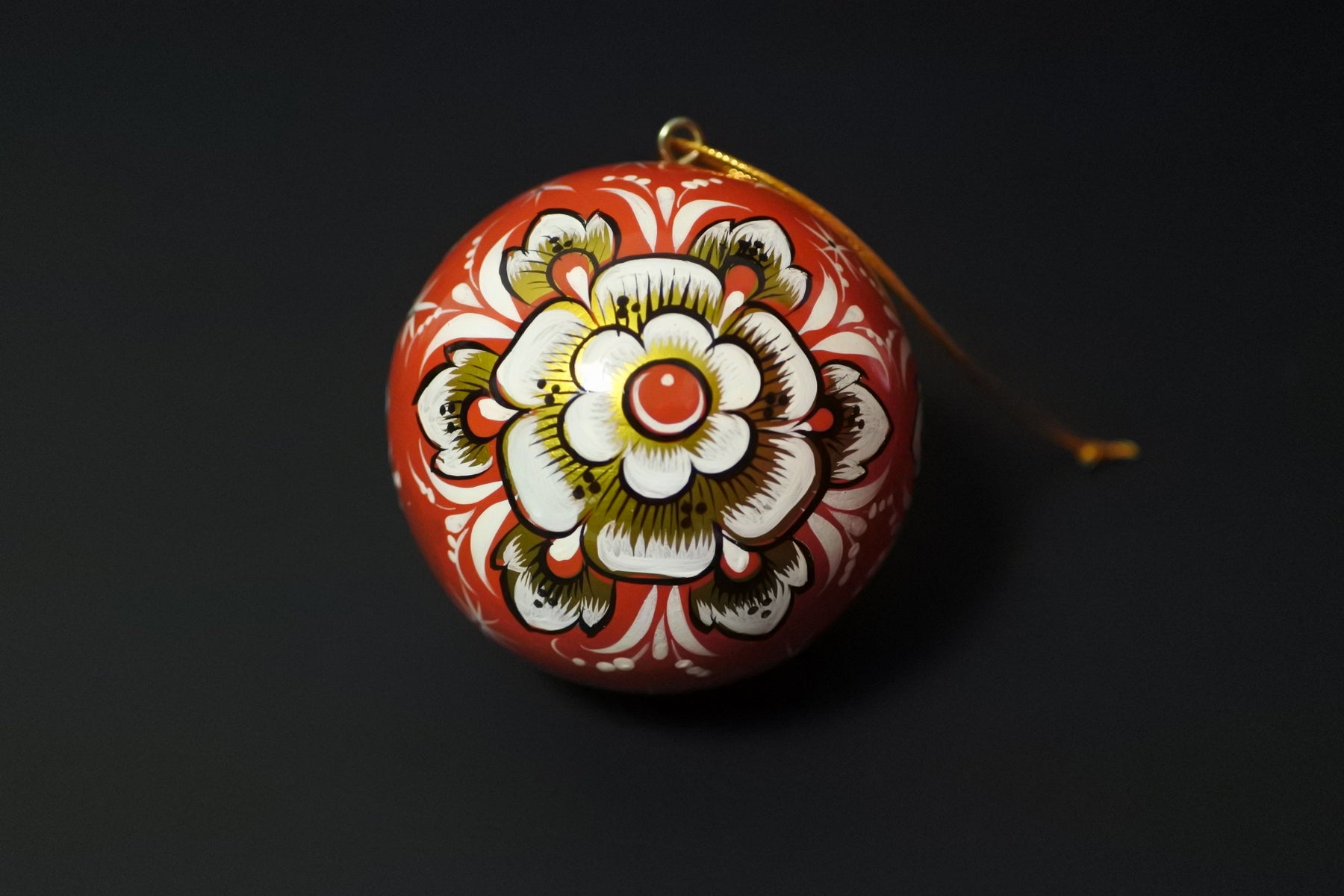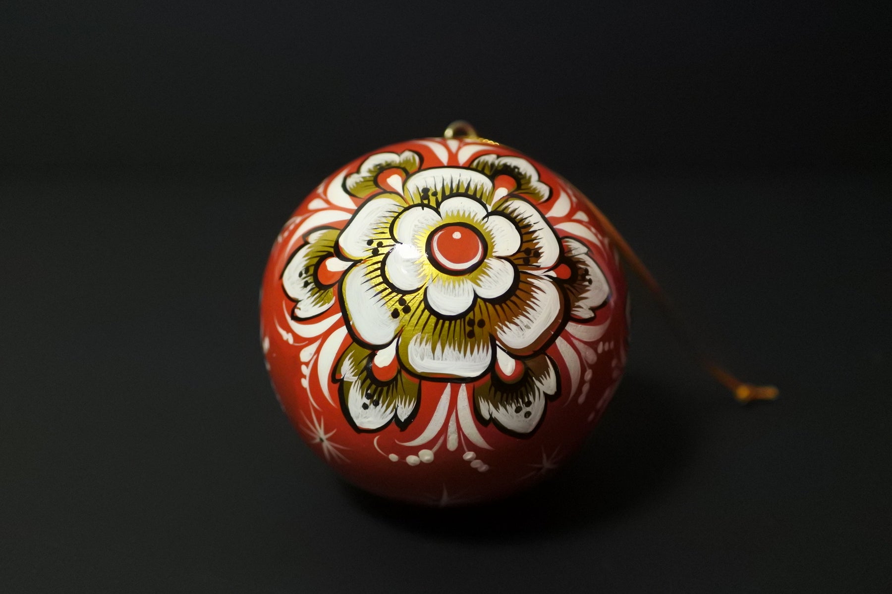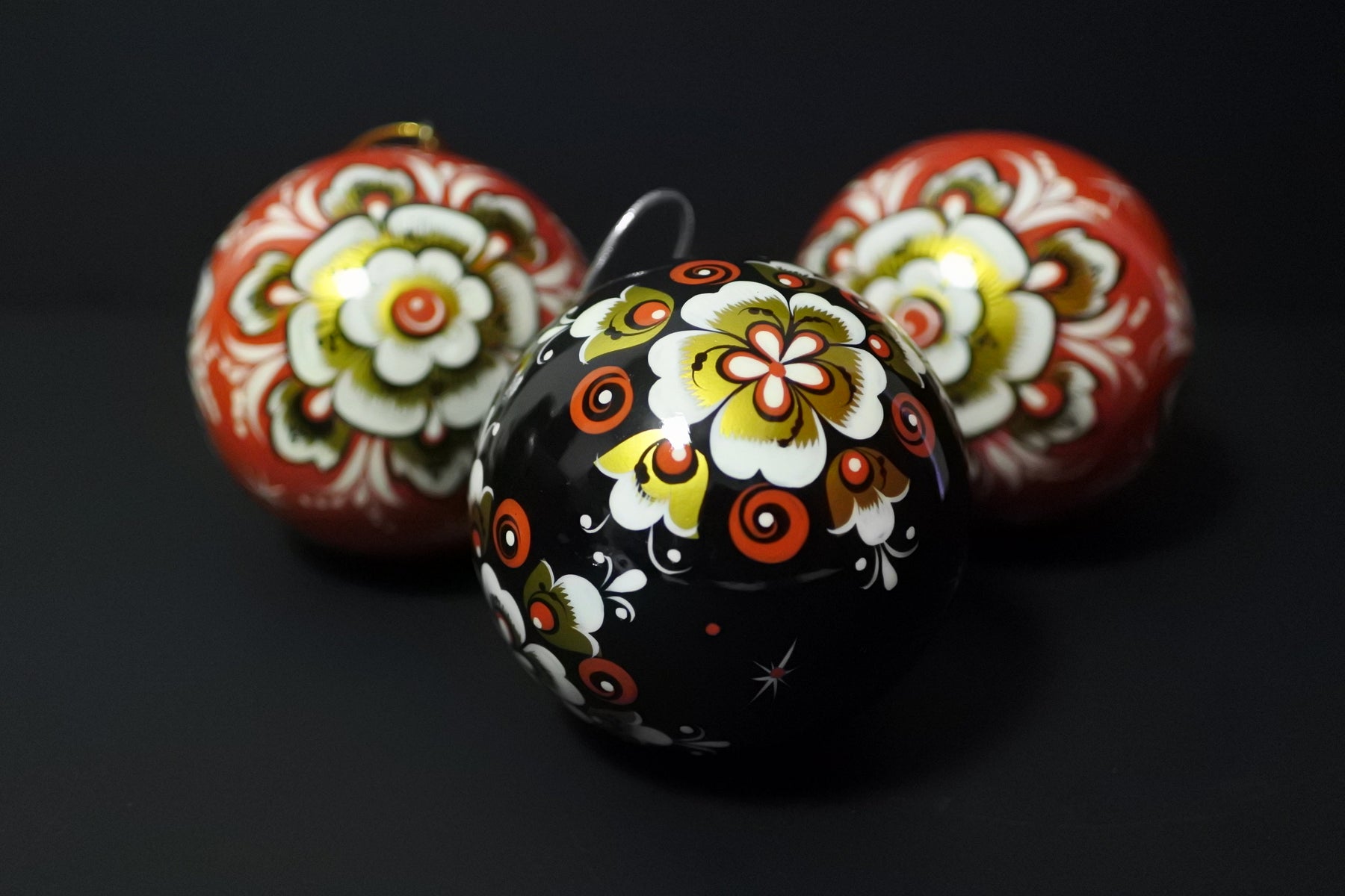 ロシアの工芸品ホフロマ塗のクリスマス。木製のクリスマスボールに金属の錫を塗り高温を当てゴールドに変色させるホフロマ塗の技法を使い、絵付けされています。鮮やかな色彩がクリスマスの夜を灯します。