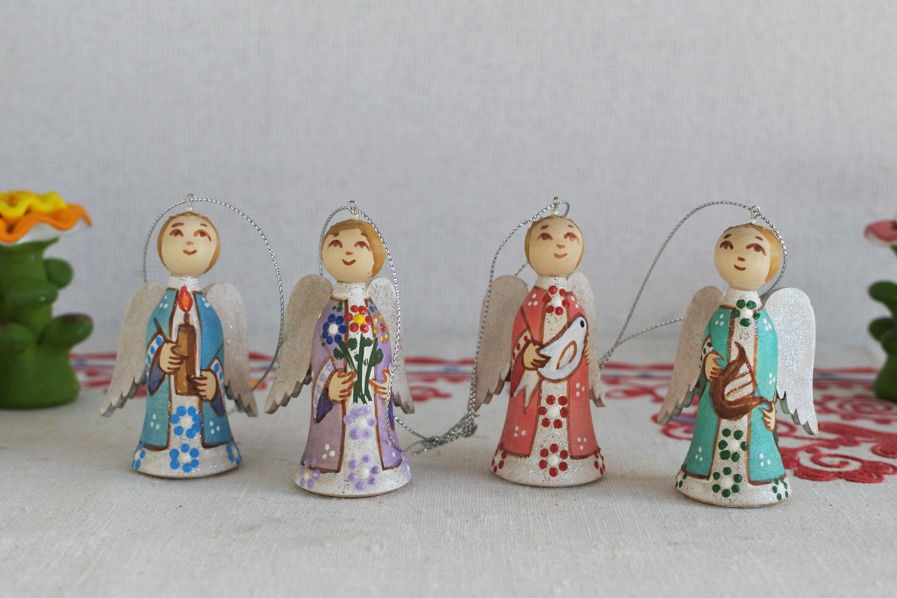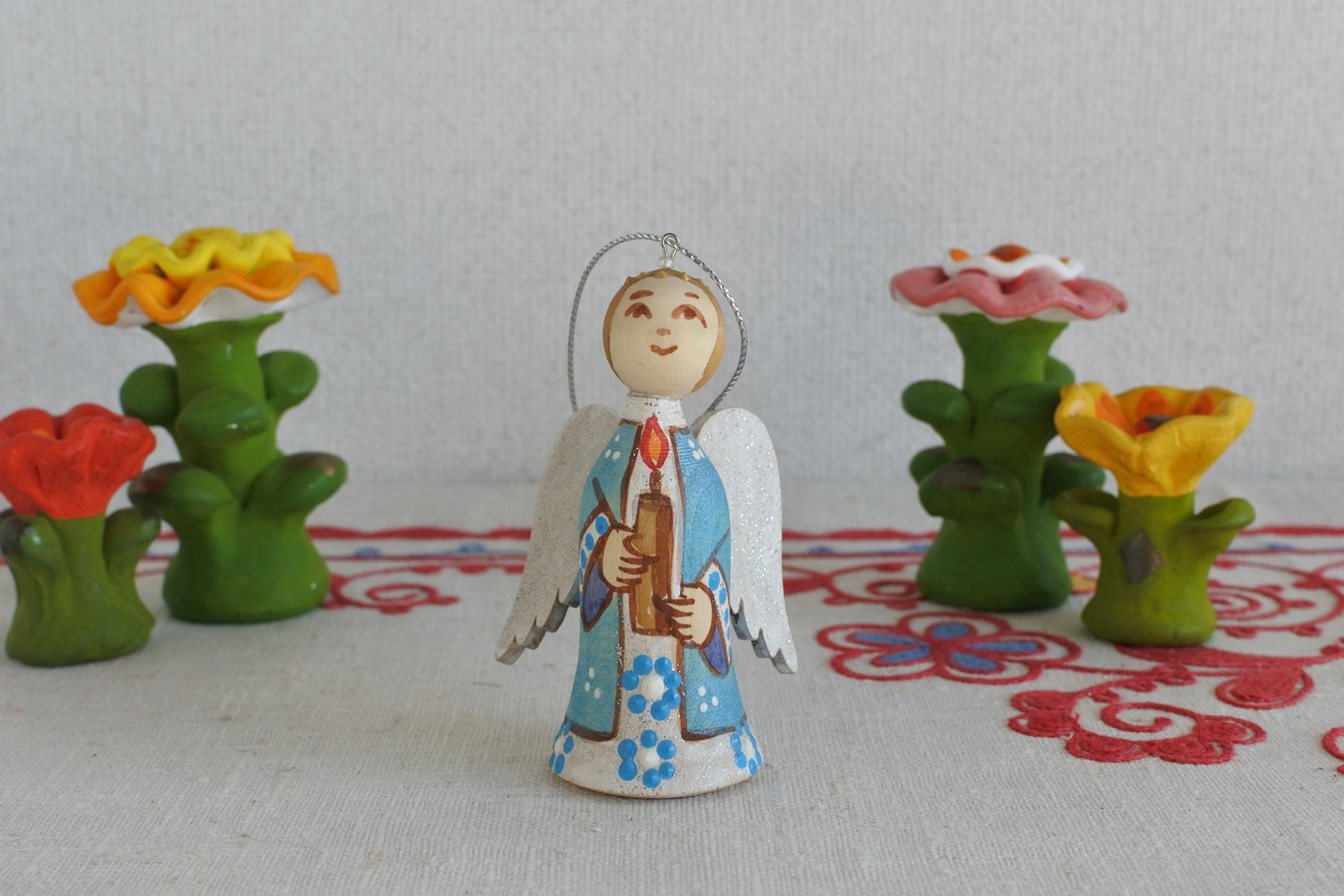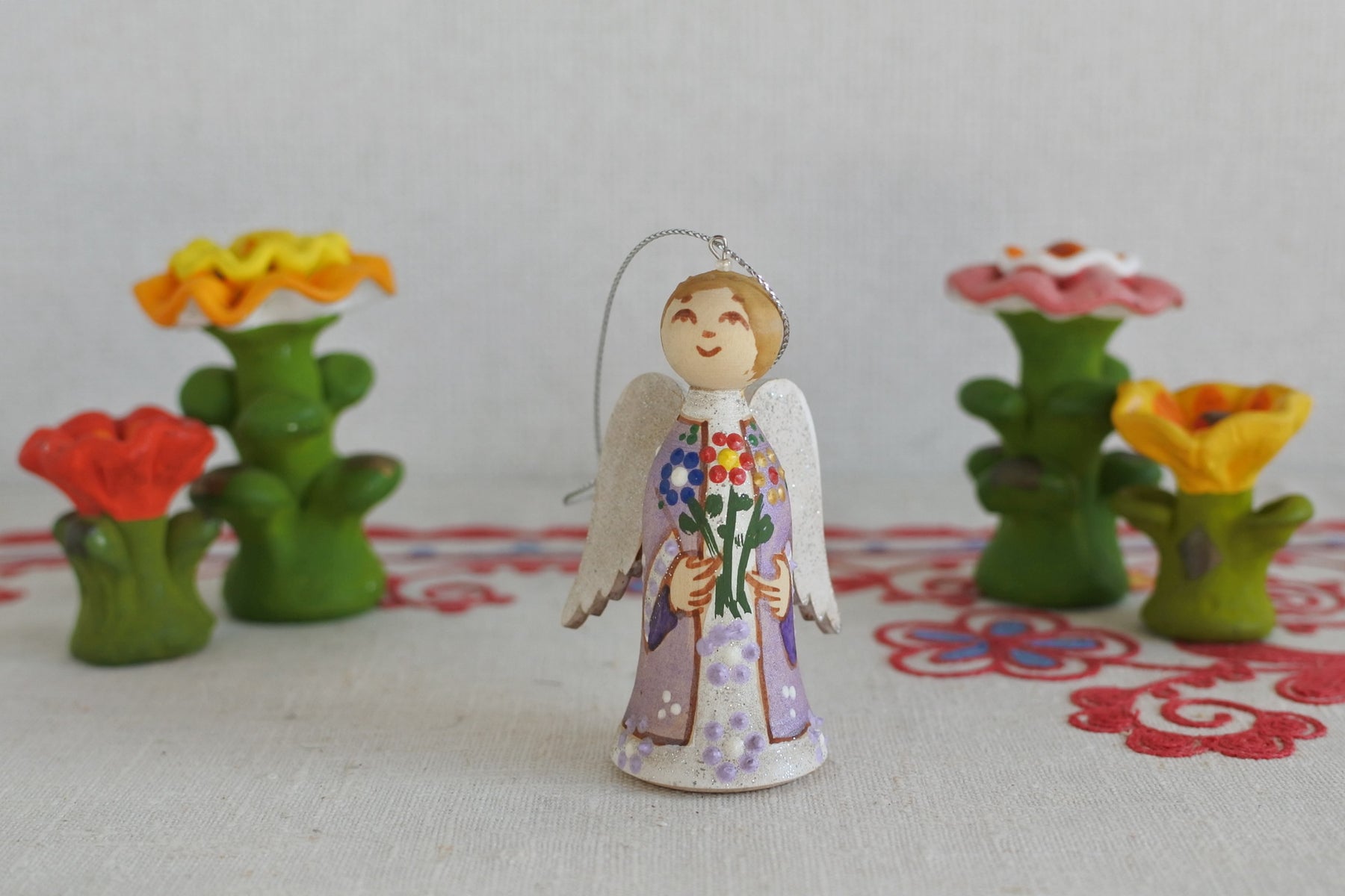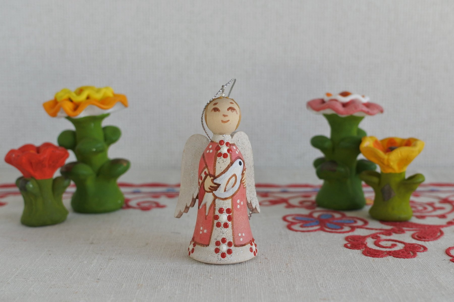 マトリョーシカ作家オリガ・アタジャーノワの天使のオーナメント。天使の大きな羽根は今にも飛んでいきそうな立体感。持っているものや色合いはもちろん、髪形や表情もそれぞれ個性があります。