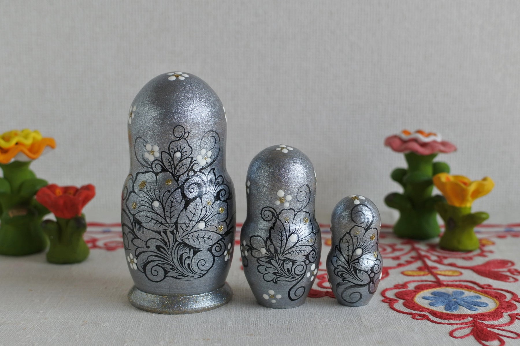 メタリックシルバーのプラトークに体丸ごと包んだ女の子のマトリョーシカ。金色の髪がよく映えます。やさしい頬笑みに今日も癒されそうです。