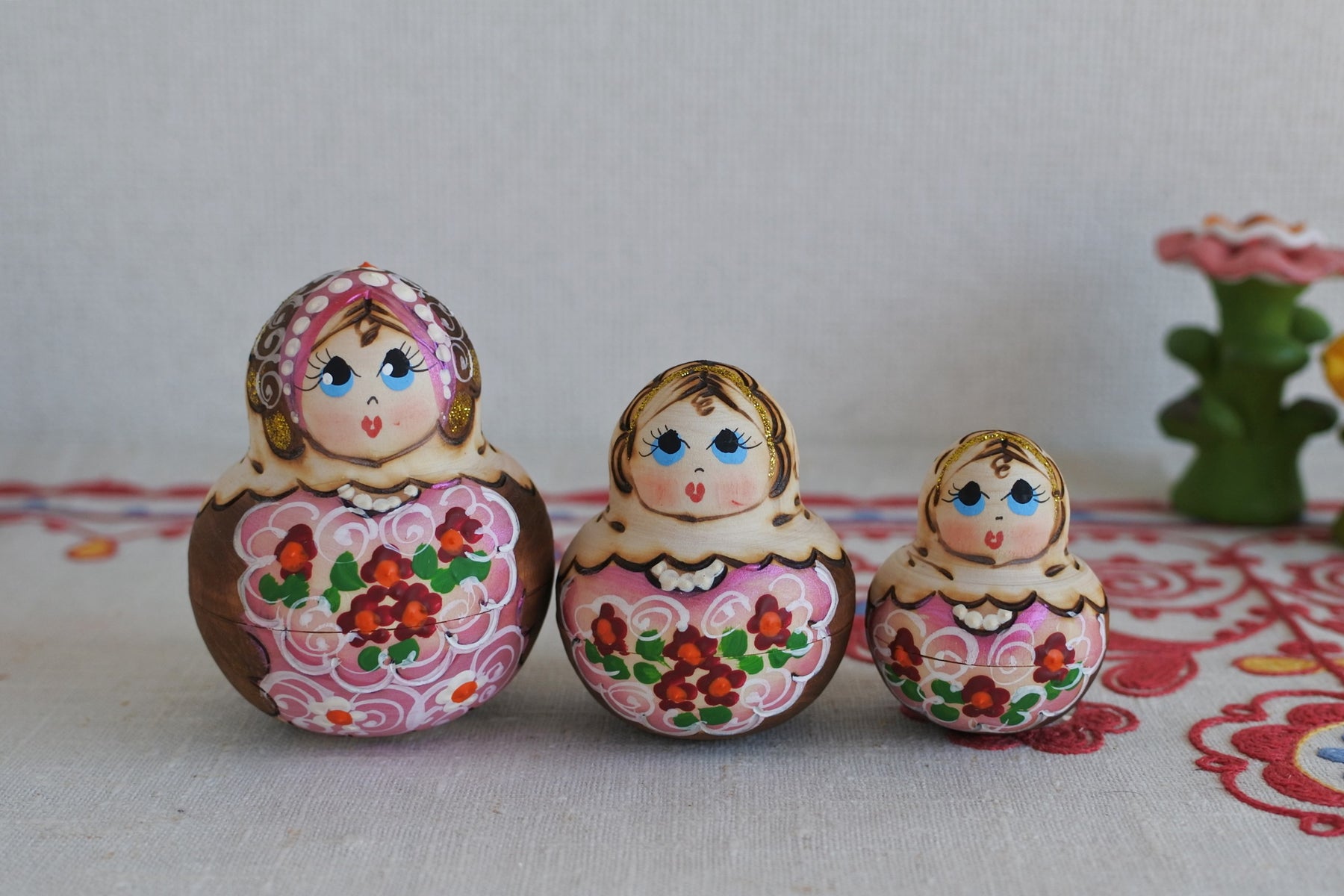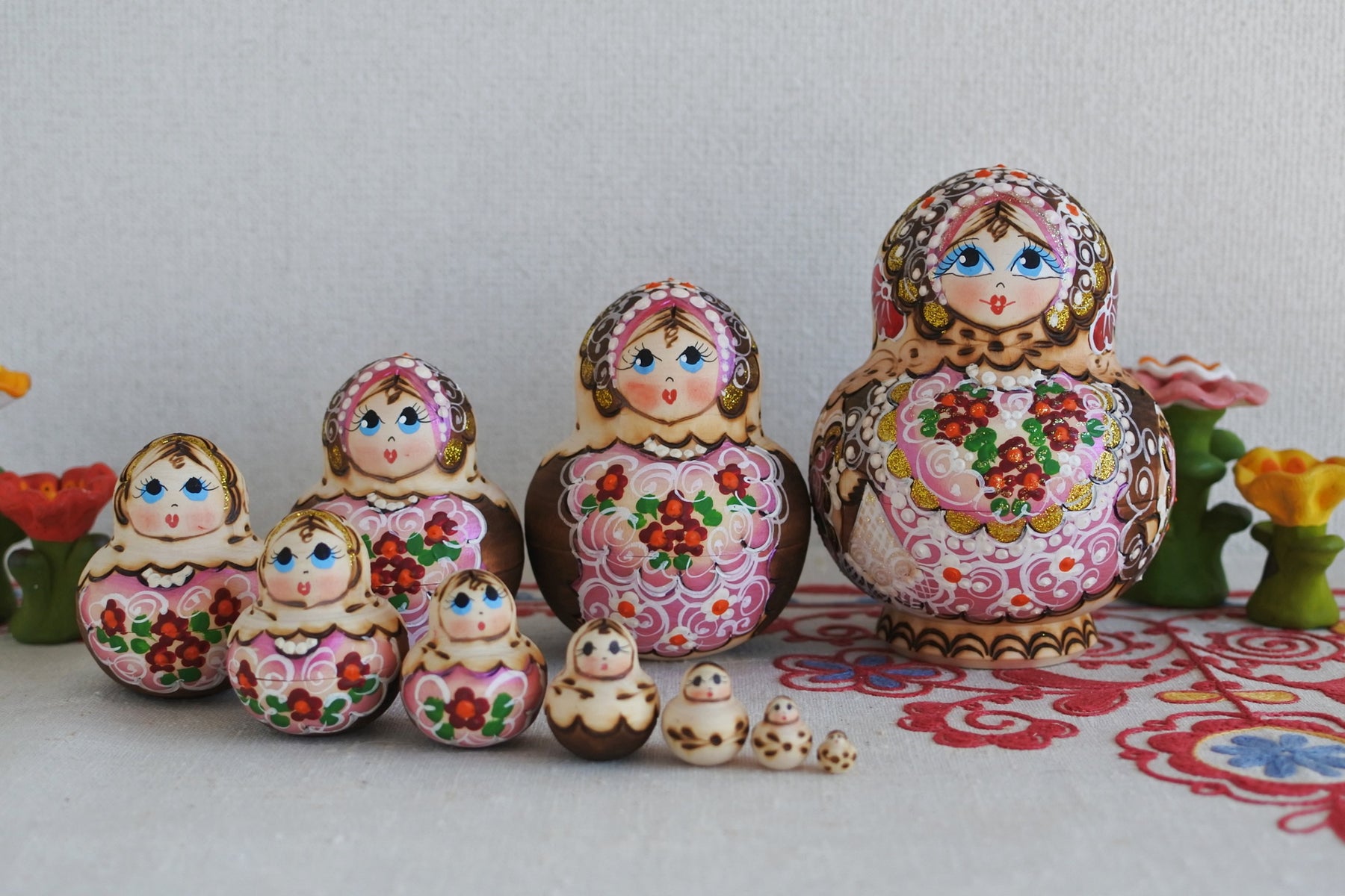継母にいじめられ、最後は王様のお妃に・・・「麗しのワシリーサ」の幸せな姿を描いたマトリョーシカです。