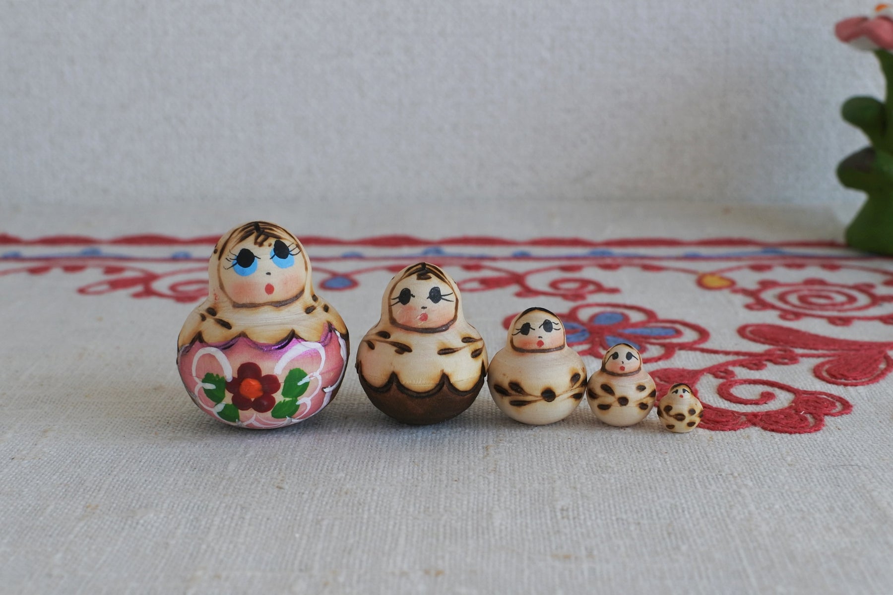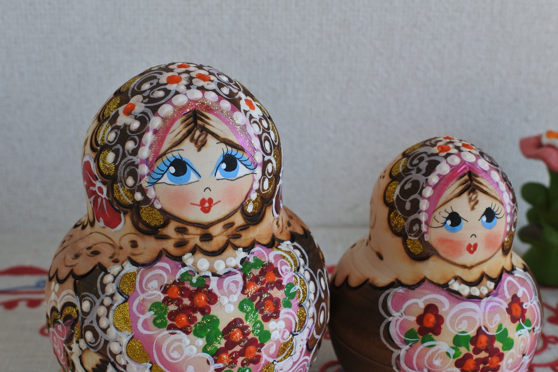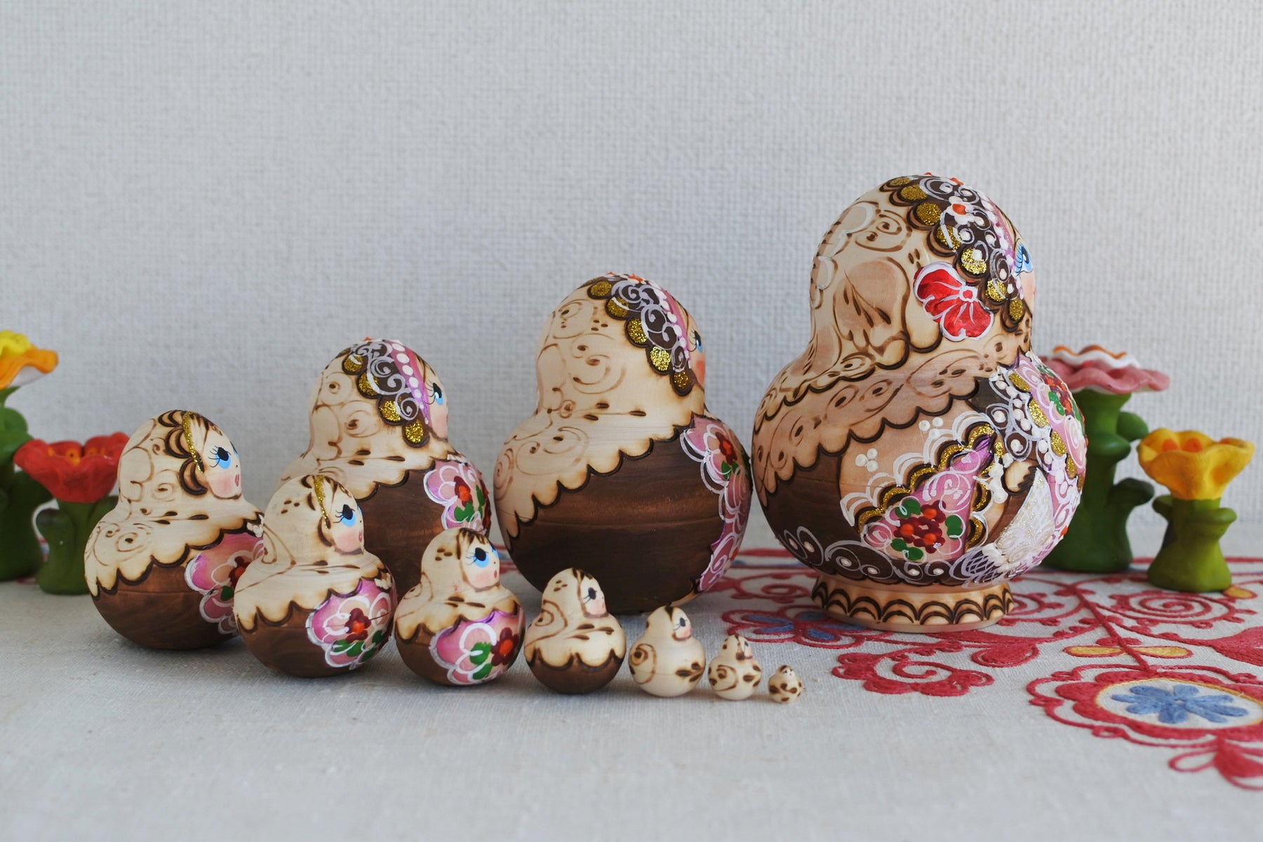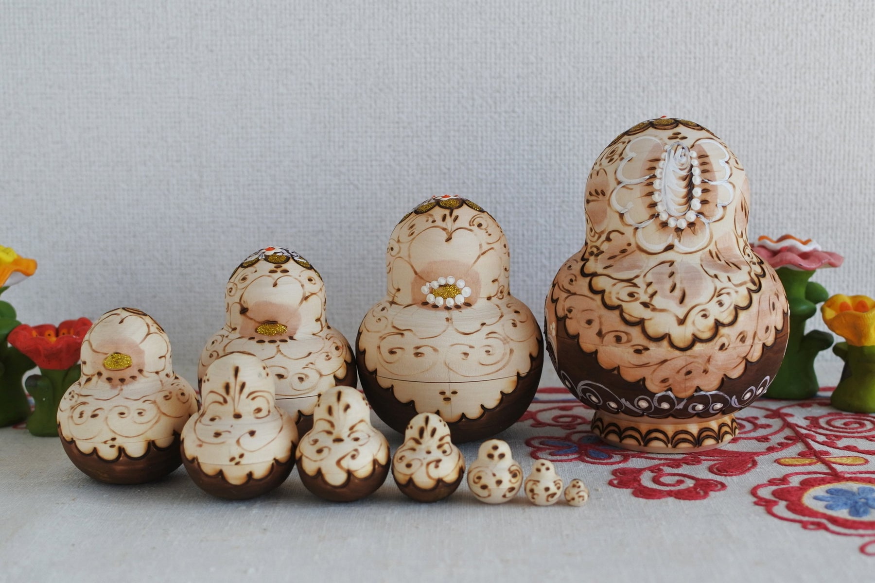 焼きごてで輪郭を描くバーニングという技法を用いたマトリョーシカです。白木そのものの素材を生かしたマトリョーシカは金や鮮やかな色ととてもよく合い、あでやかな絵付けは王女の気品がよく伝わってきます。