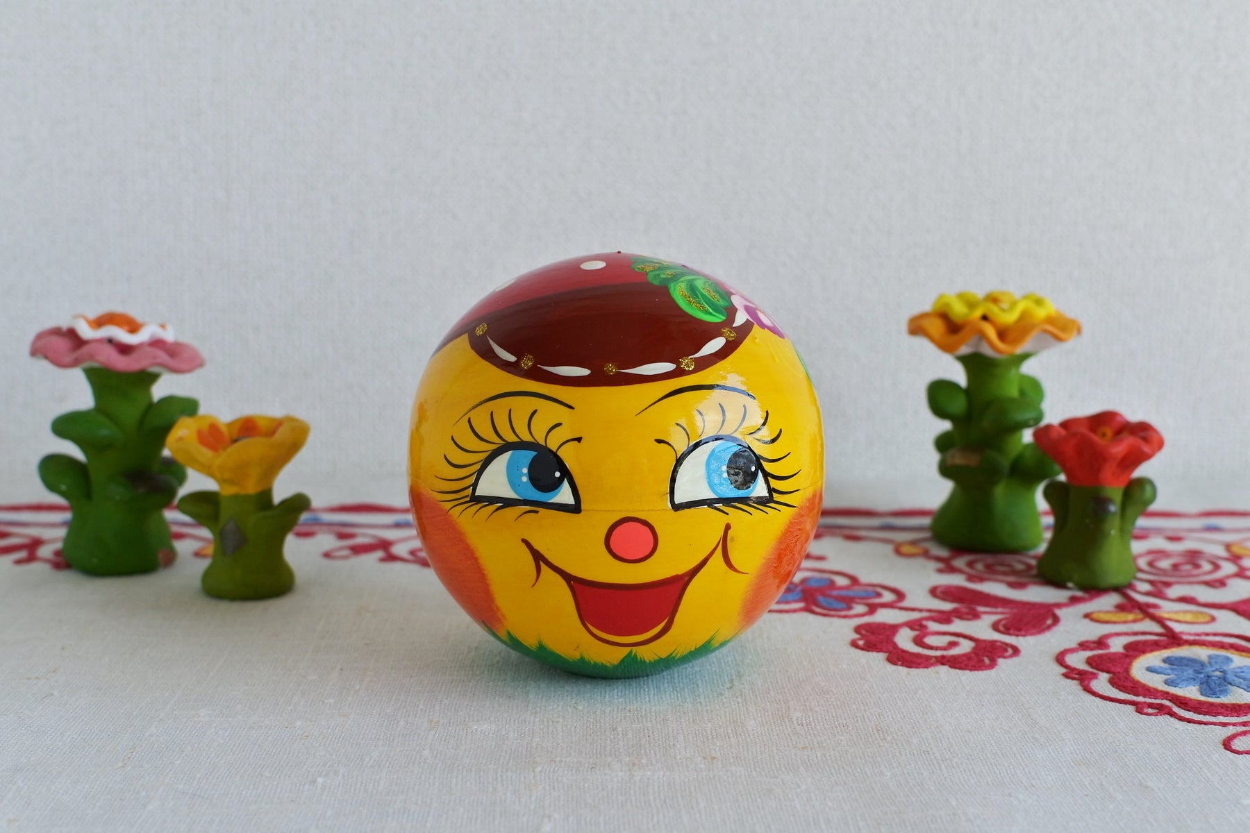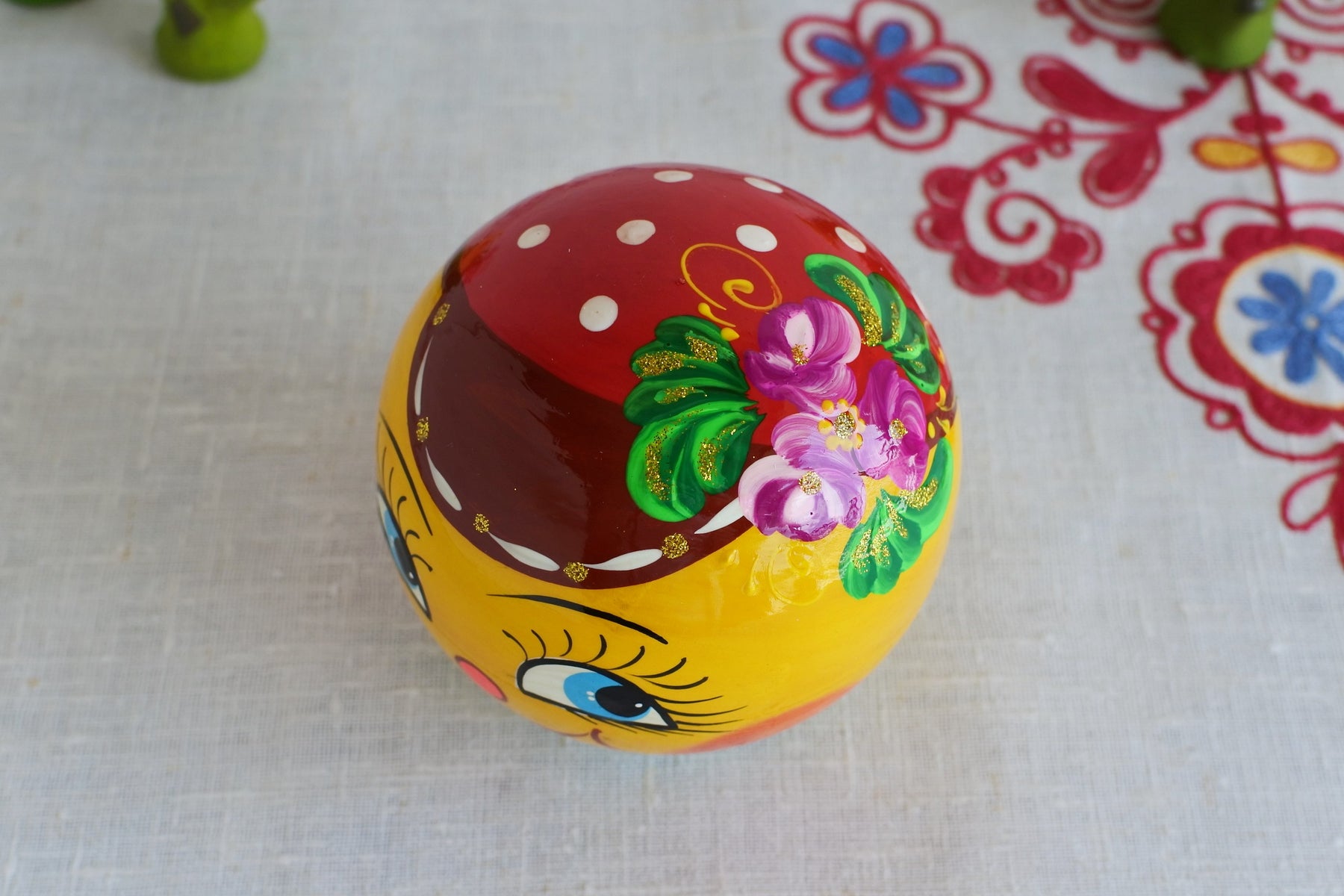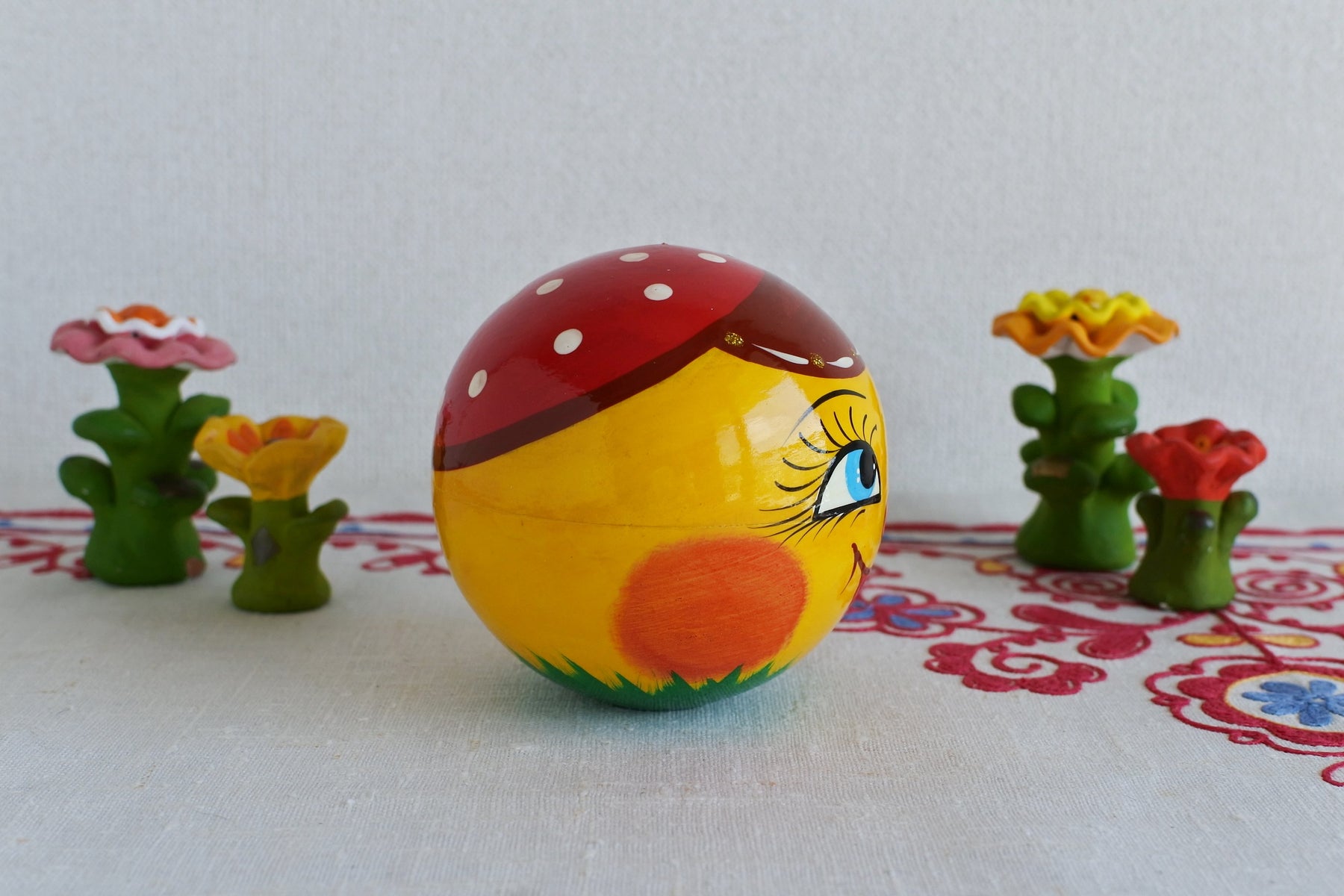 赤い帽子をかぶったまあるいお顔はロシア民話「おだんごパン」。お顔をパカっと開けると中には子供用の指人形になった物語の登場人物たちが入っています。お話をしながら楽しめます。飾っておくだけども癒される作品です。