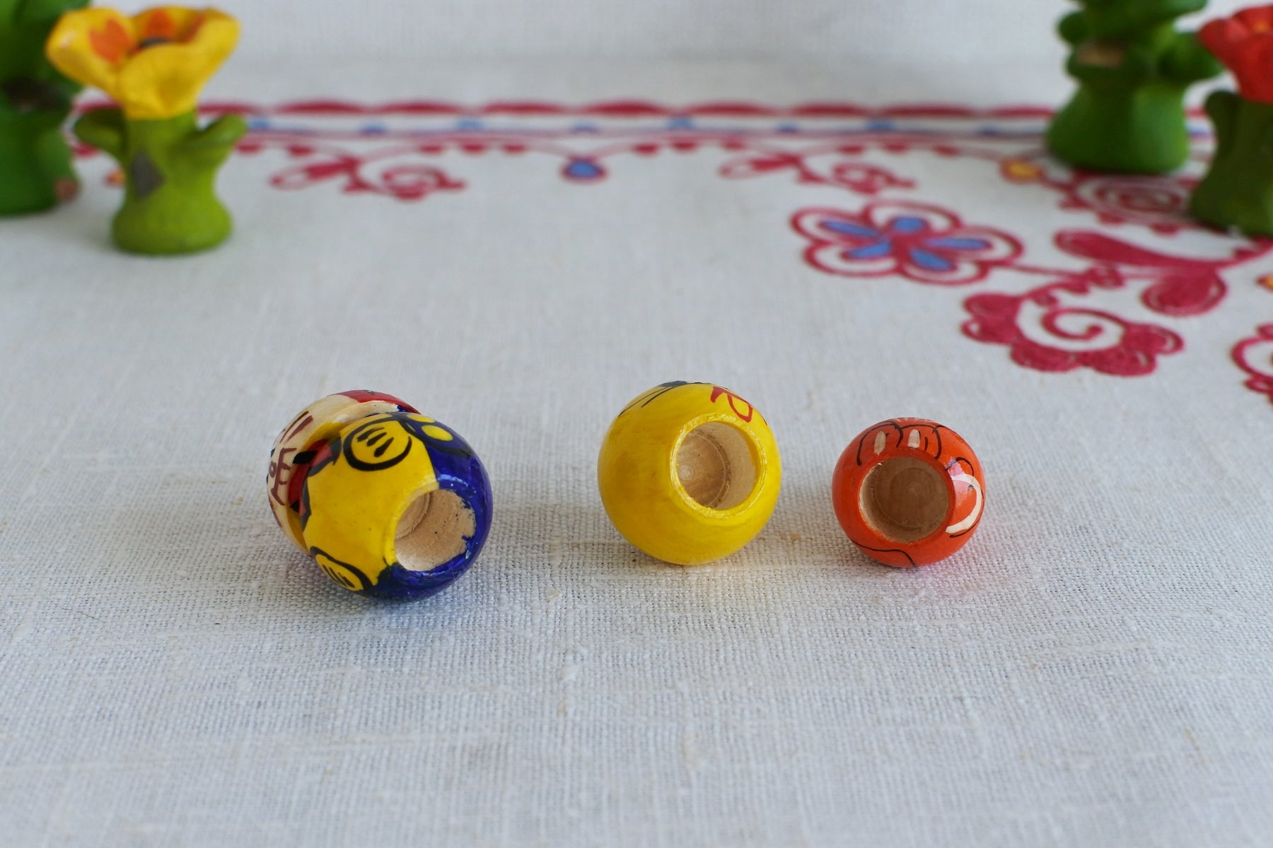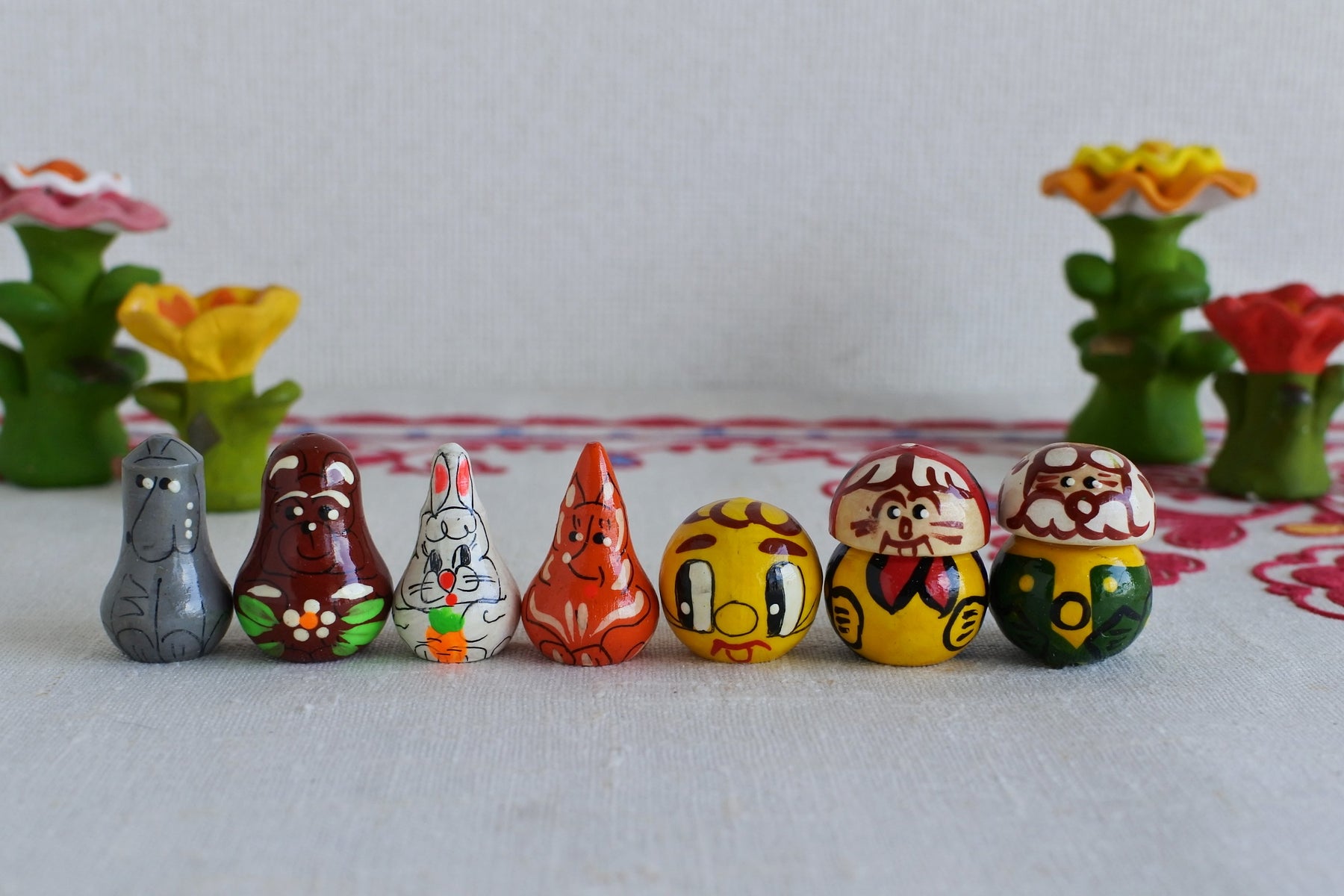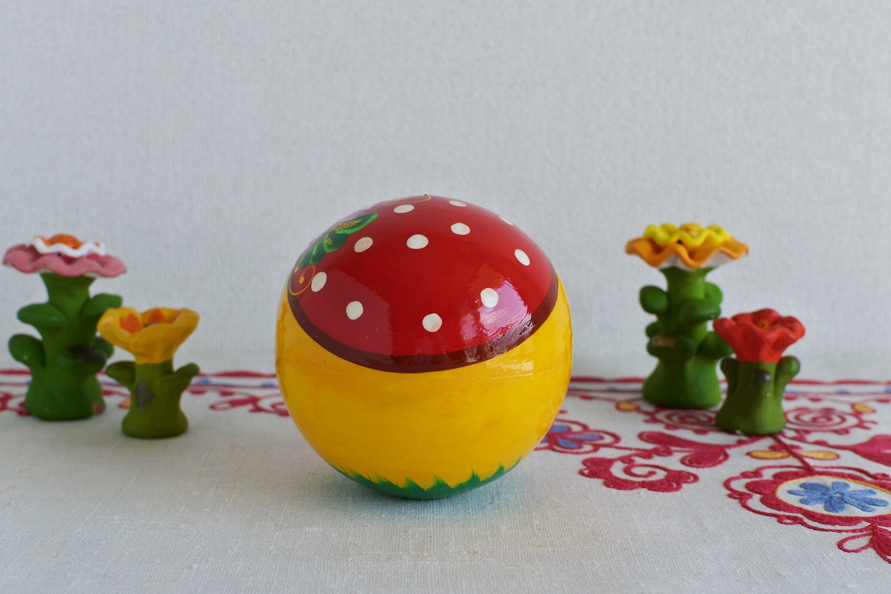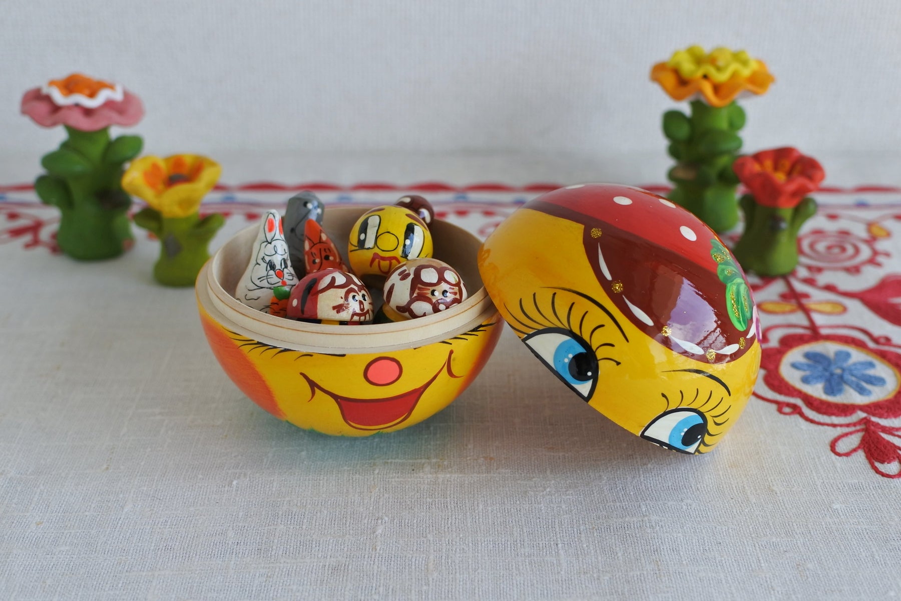 赤い帽子をかぶったまあるいお顔はロシア民話「おだんごパン」。お顔をパカっと開けると中には子供用の指人形になった物語の登場人物たちが入っています。お話をしながら楽しめます。飾っておくだけども癒される作品です。