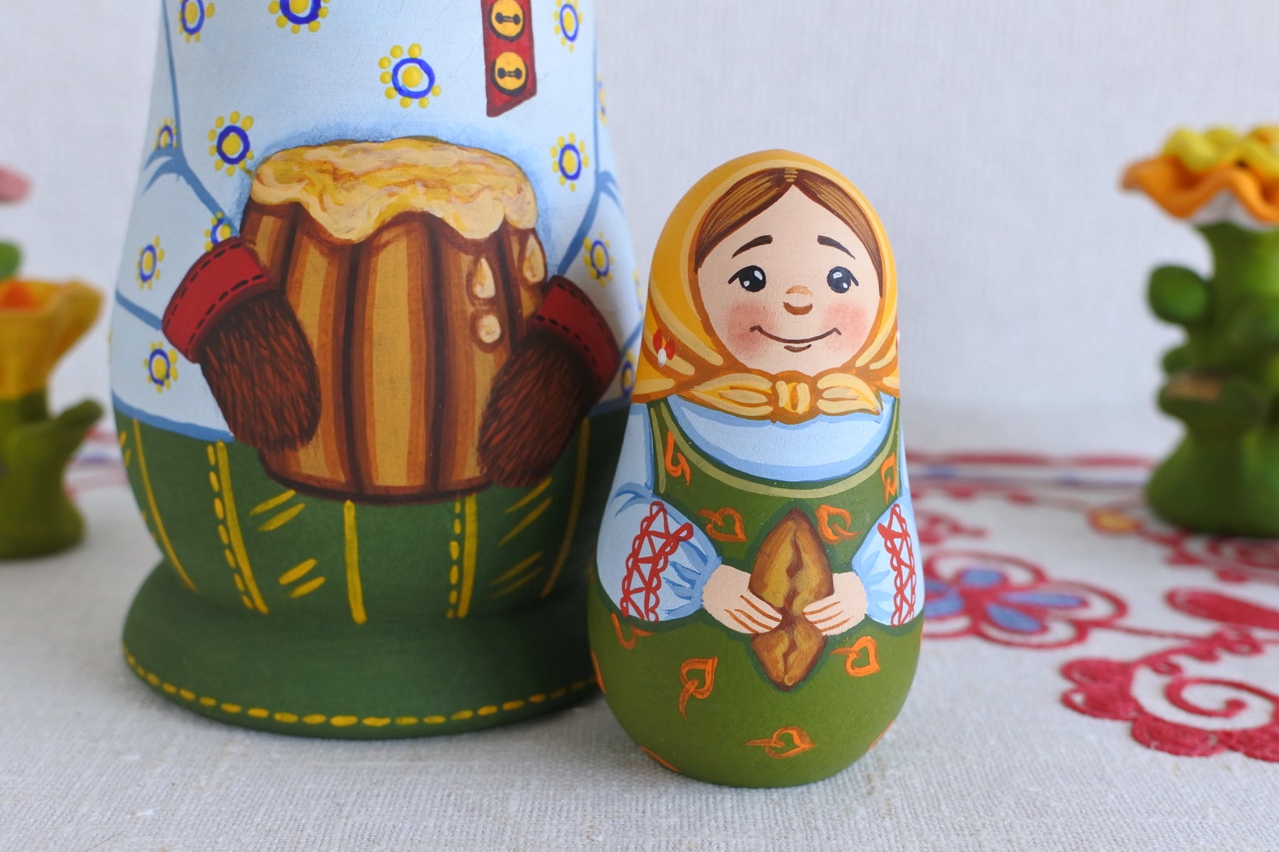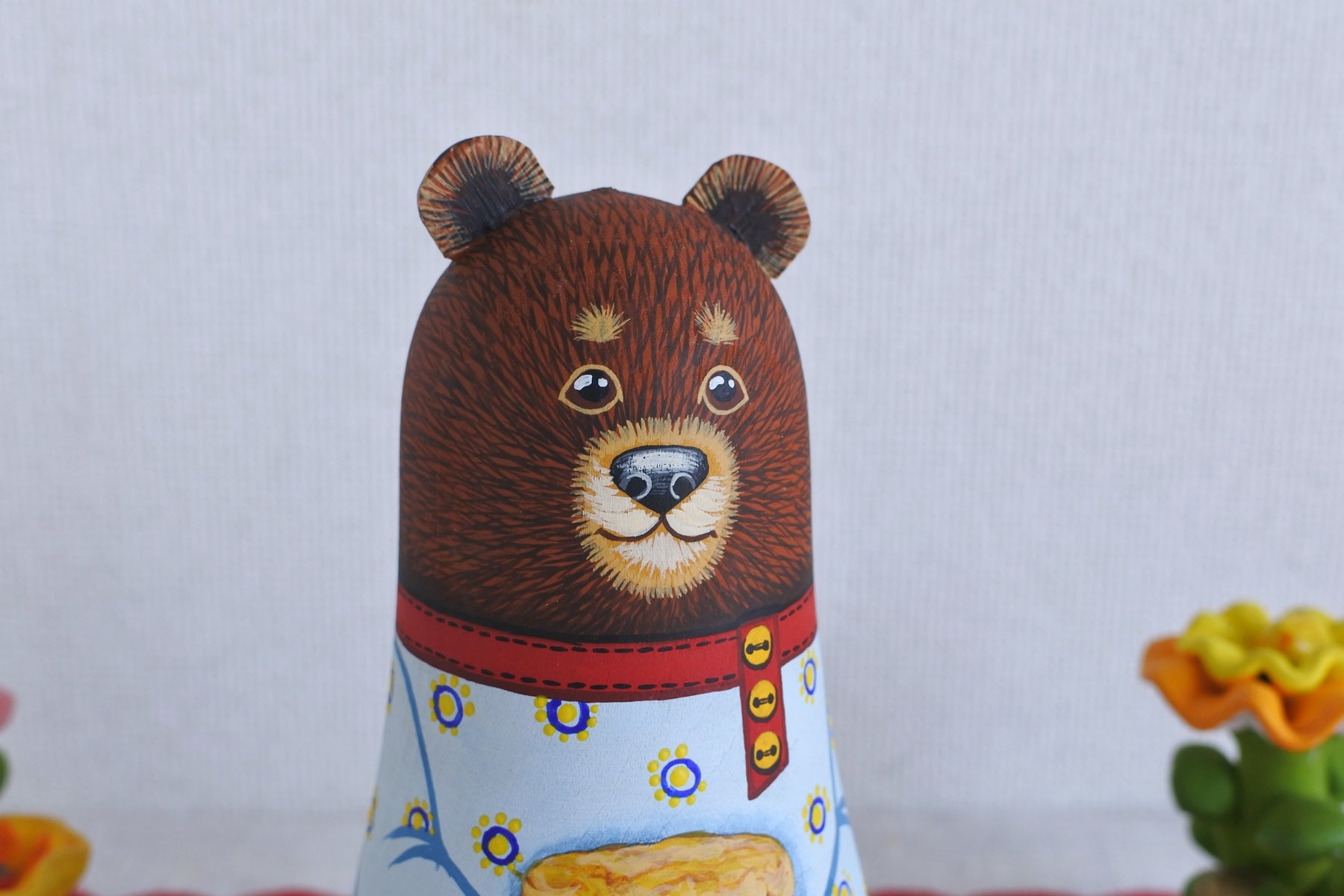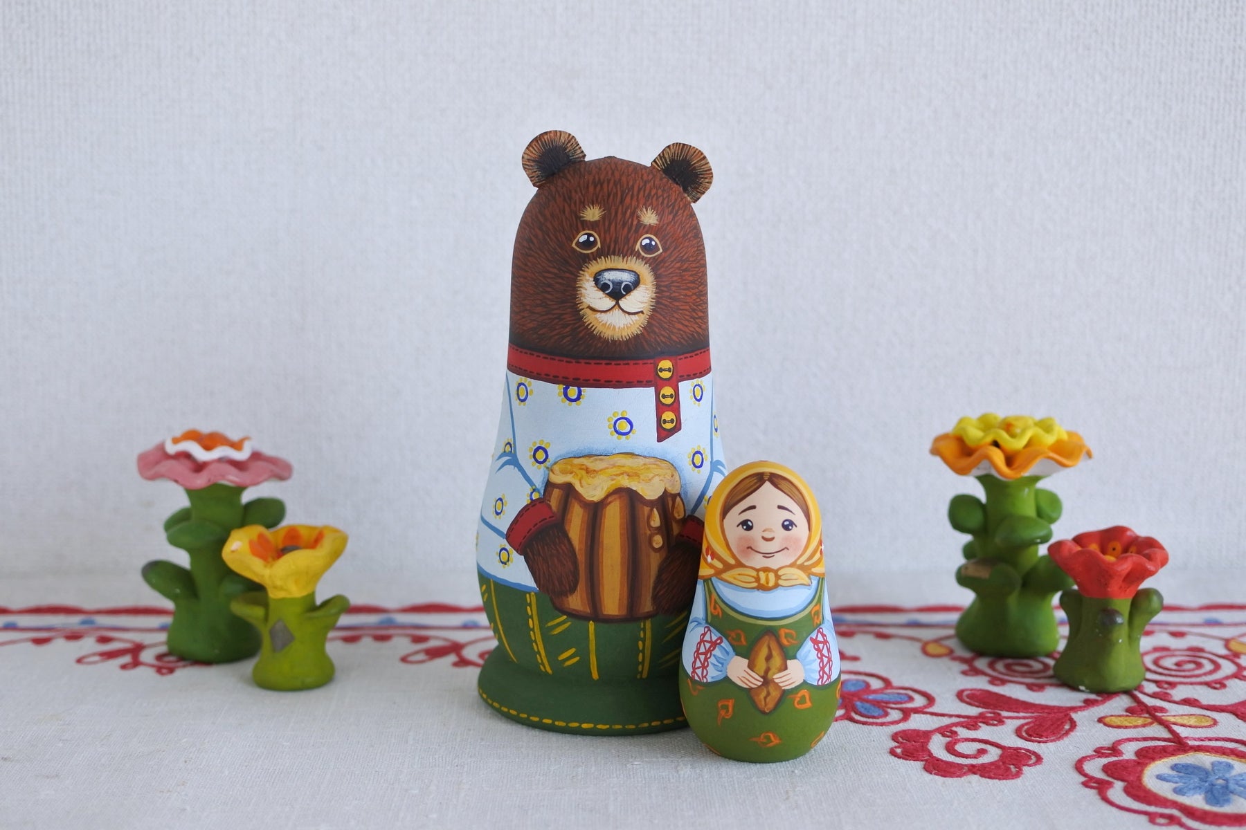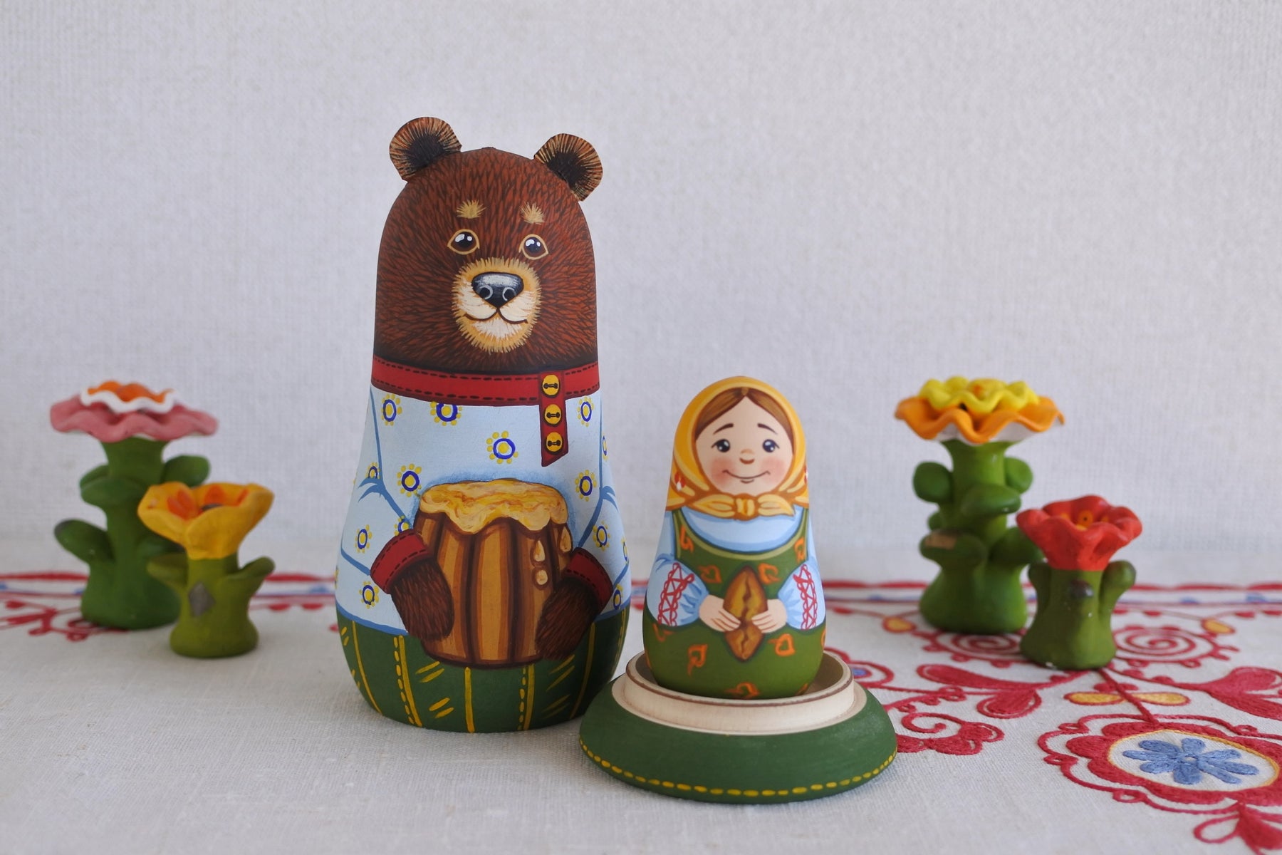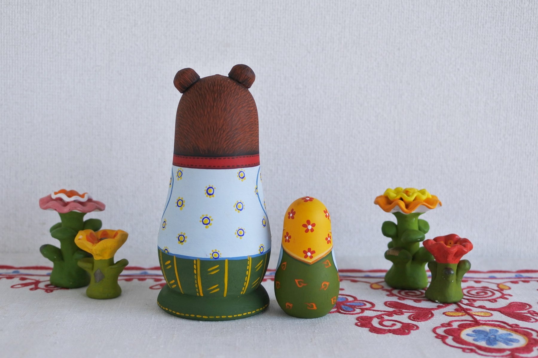 マトリョーシカ作家エカテリーナ・ペトゥホワのロシア民話「マーシャとくま」。それもマーシャとくま、2ピースだけのマトリョーシカです。明るい色彩とつや消しニスで仕上げられたやさしい雰囲気が物語をより楽しく想像させてくれます。