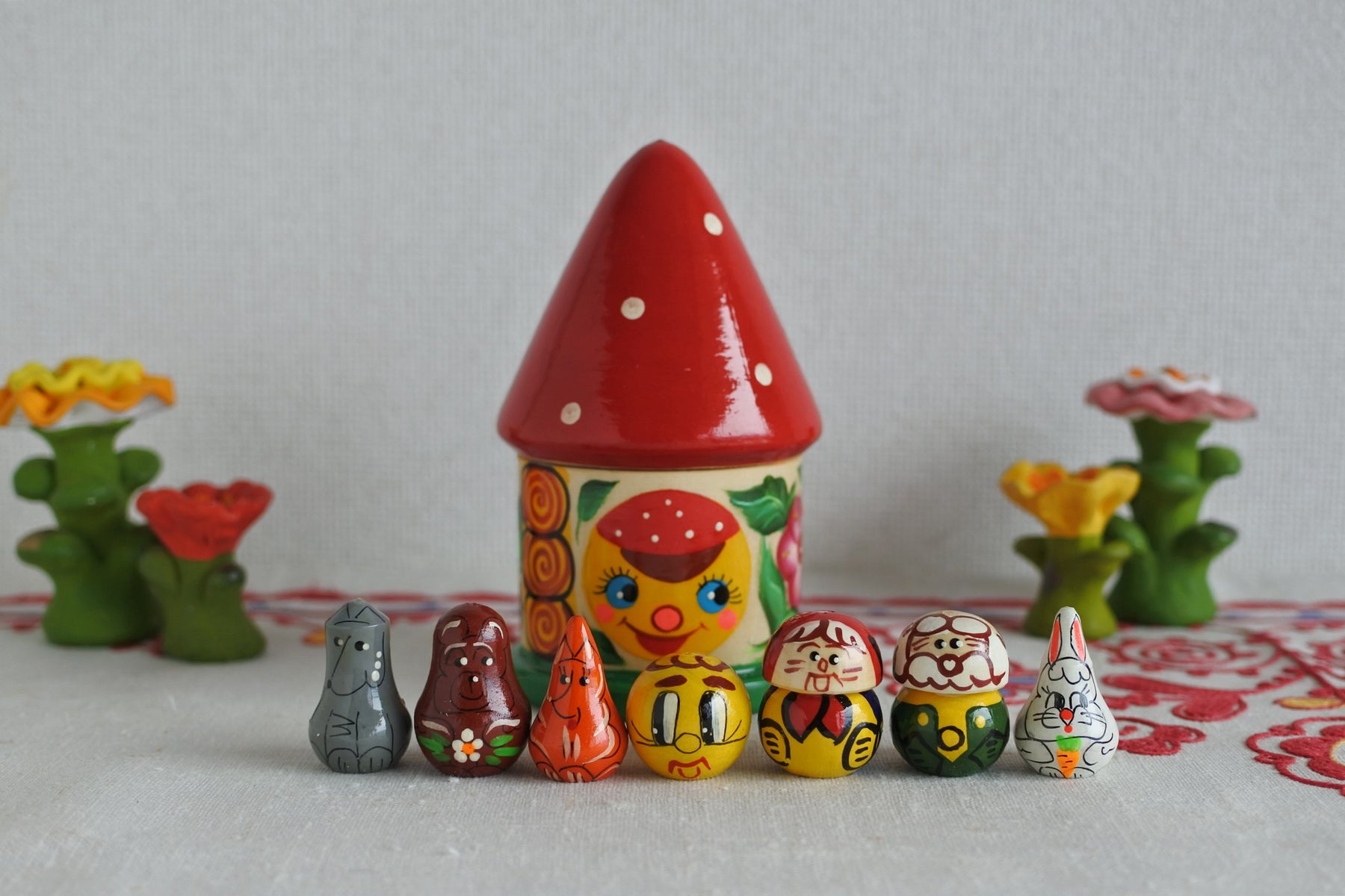 ロシア民話「おだんごパン」の木のおうち。中にはおじいさん、おばあさん、おだんごパンと森の動物たち。指人形になっているのでお子さんもお話しながら遊べます。