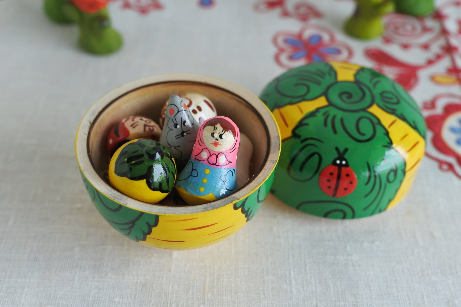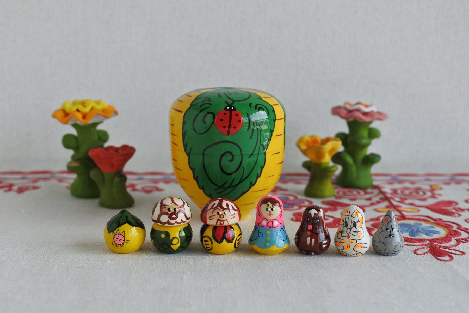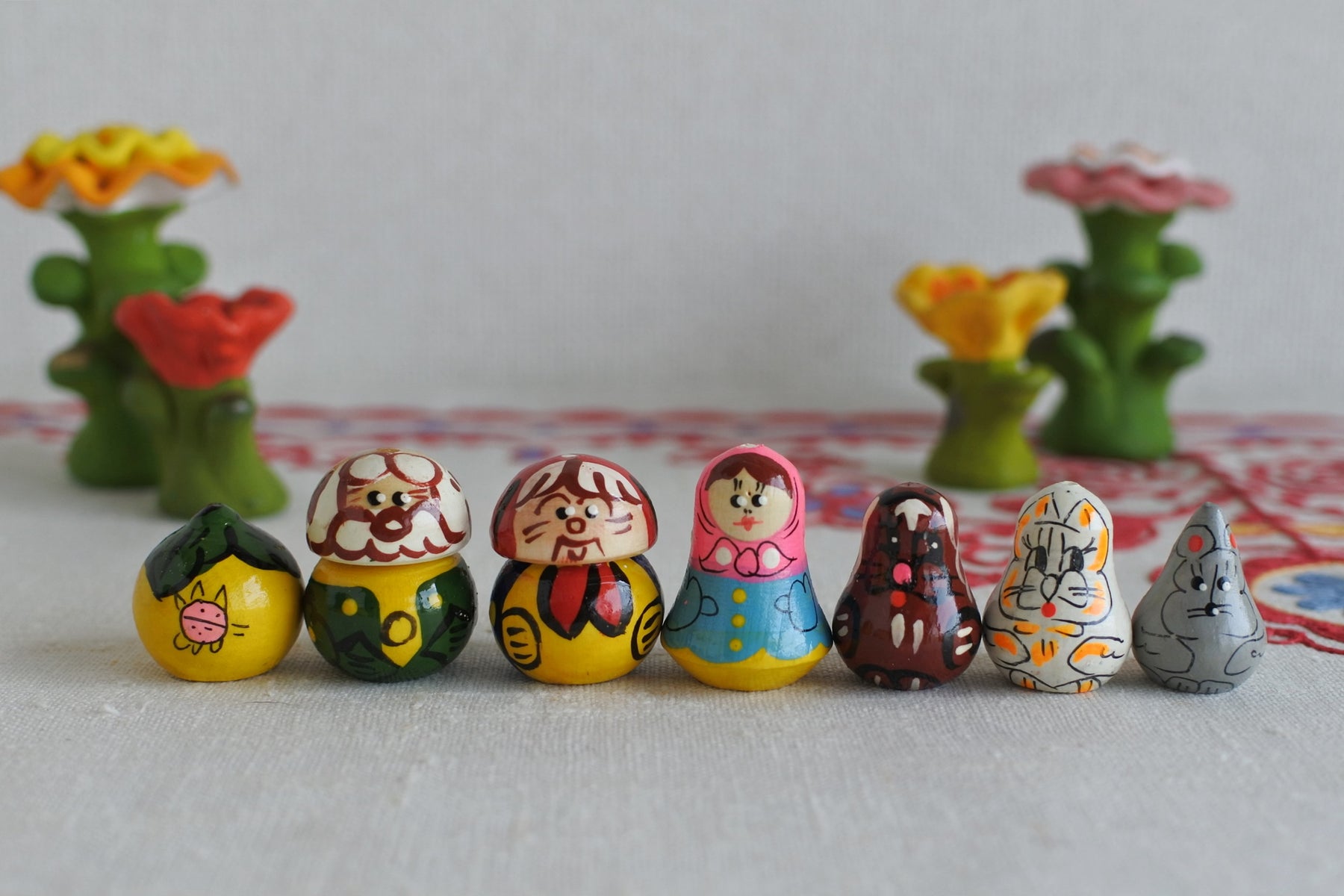 おおきなかぶにはロシア民話「おおきなかぶ」の登場人物たちが入った木のおもちゃ。おじいさんが引っ張って、おばあさんが引っ張って・・・孫娘、犬、猫、最後にネズミがやって来て「うんとこしょ!どっこいしょ!」。お人形は子供用の指人形になっています。お話をしながら楽しく遊べます。