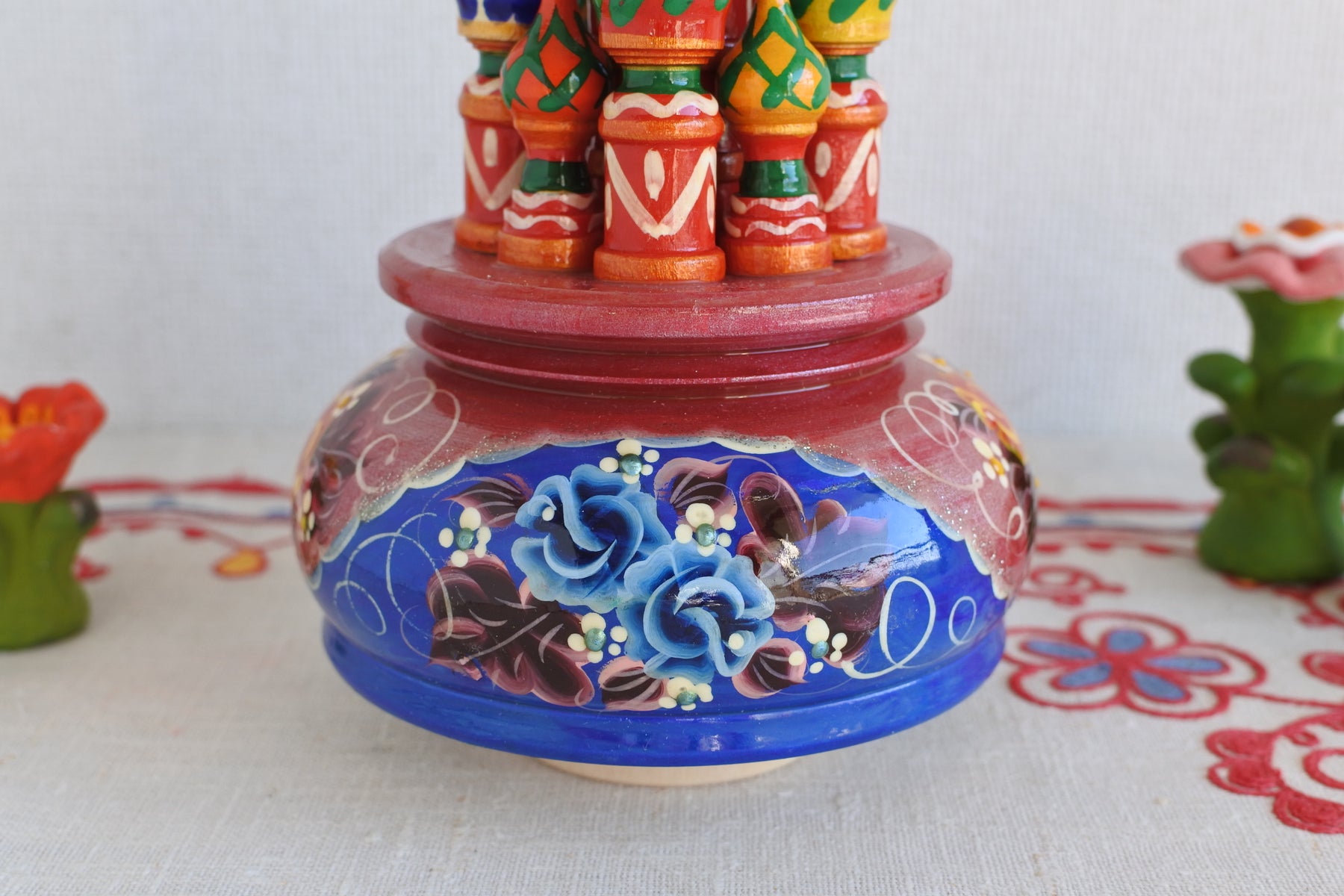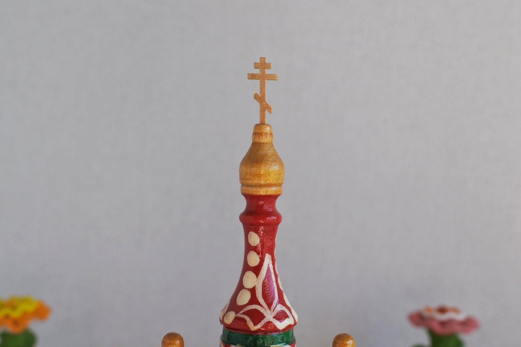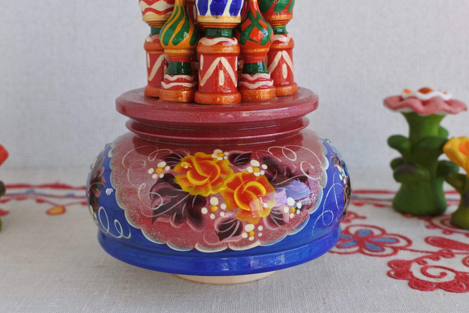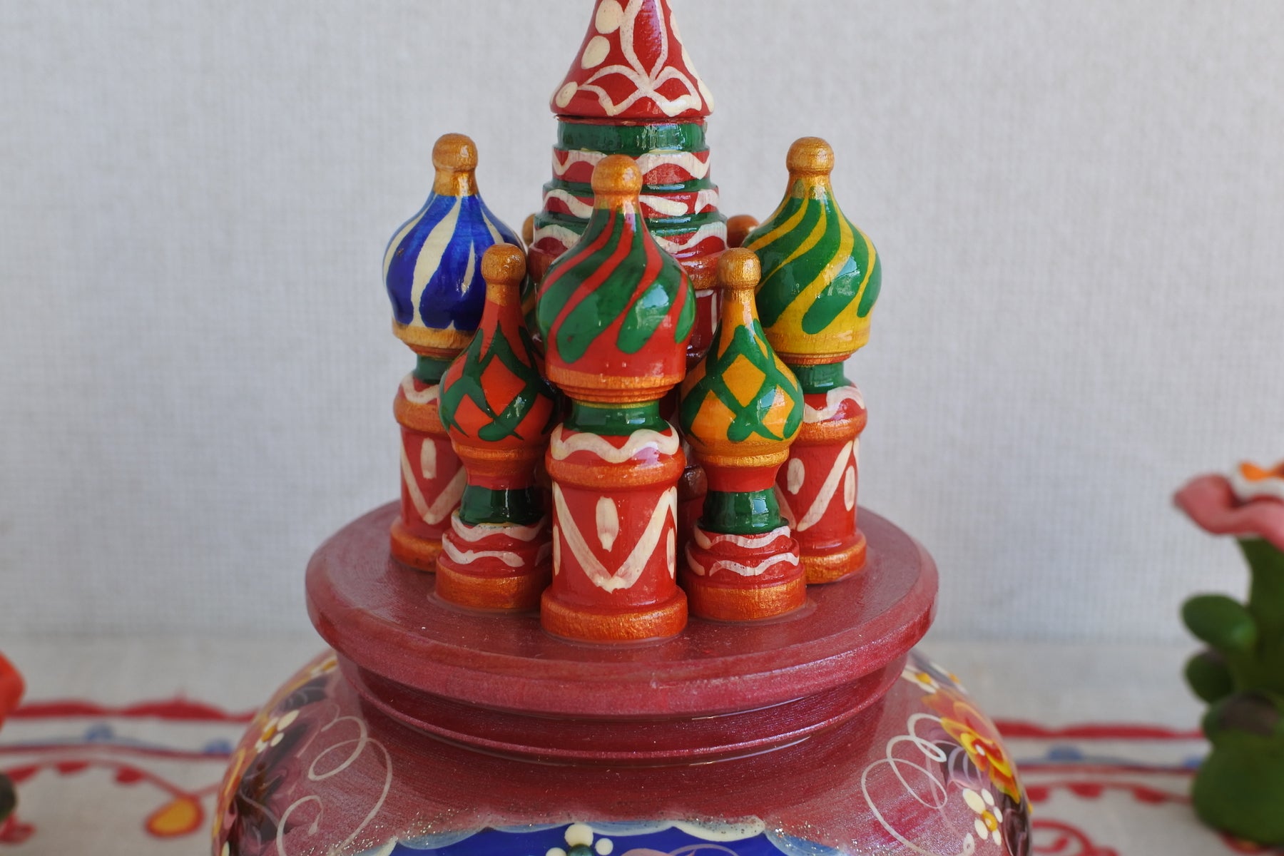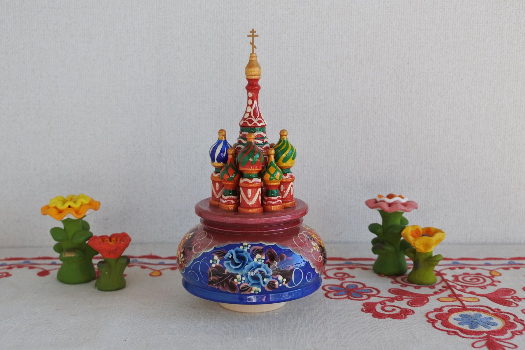 ワシリー大聖堂の木製オルゴールです。大聖堂がくるくると回りながらロシアの曲が流れます。天辺にはロシア正教会の八反十字架が付いています。