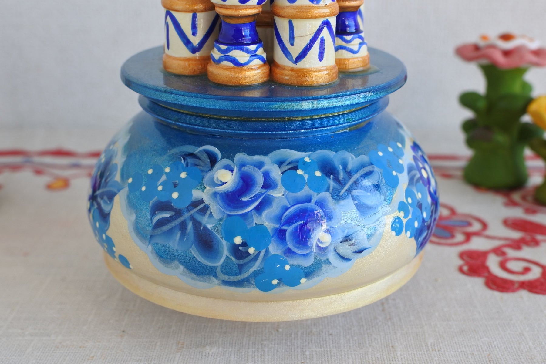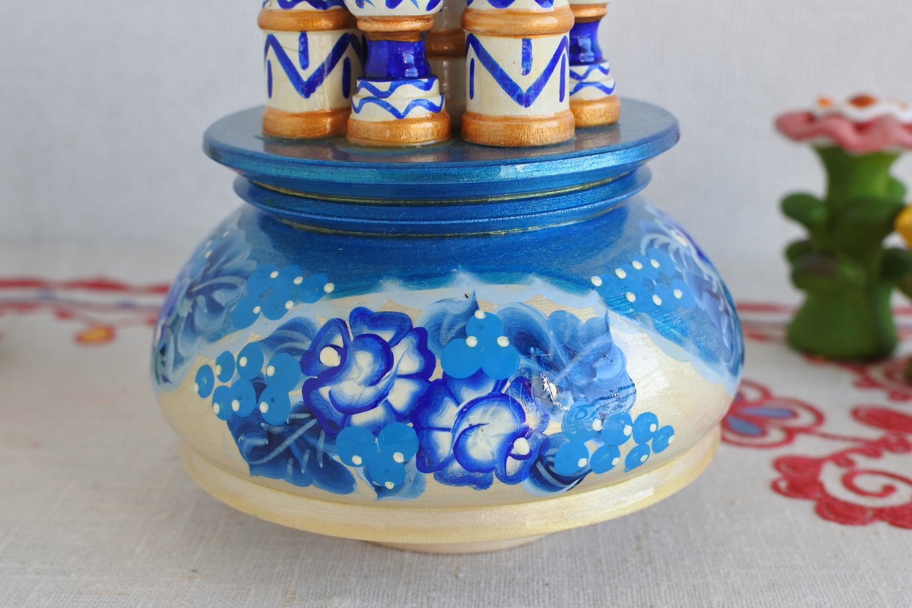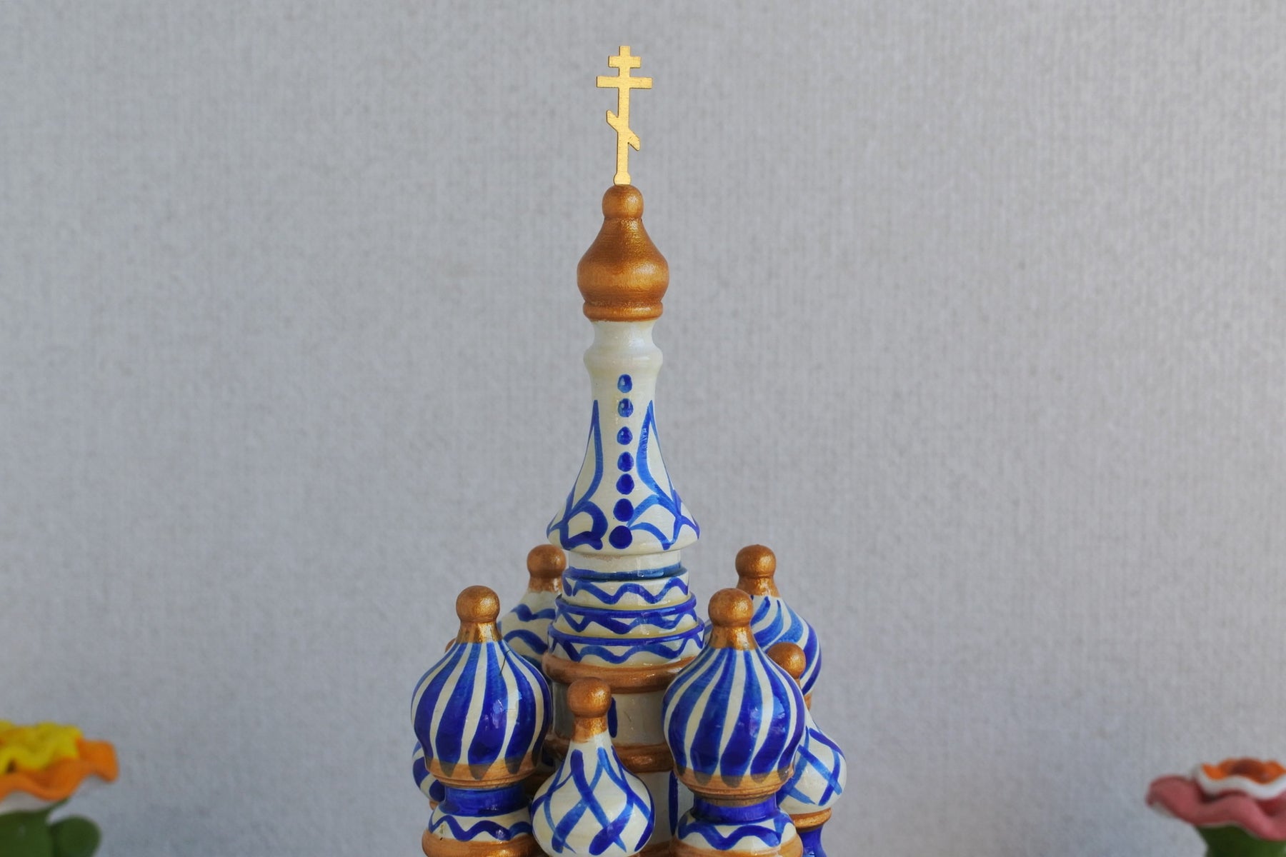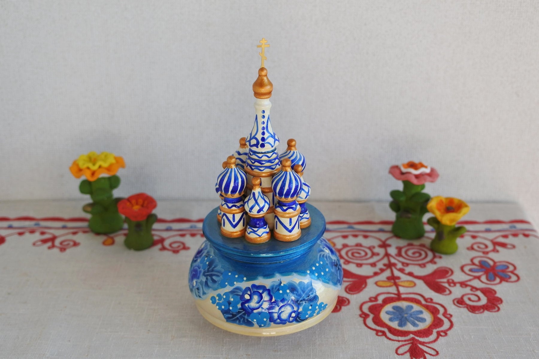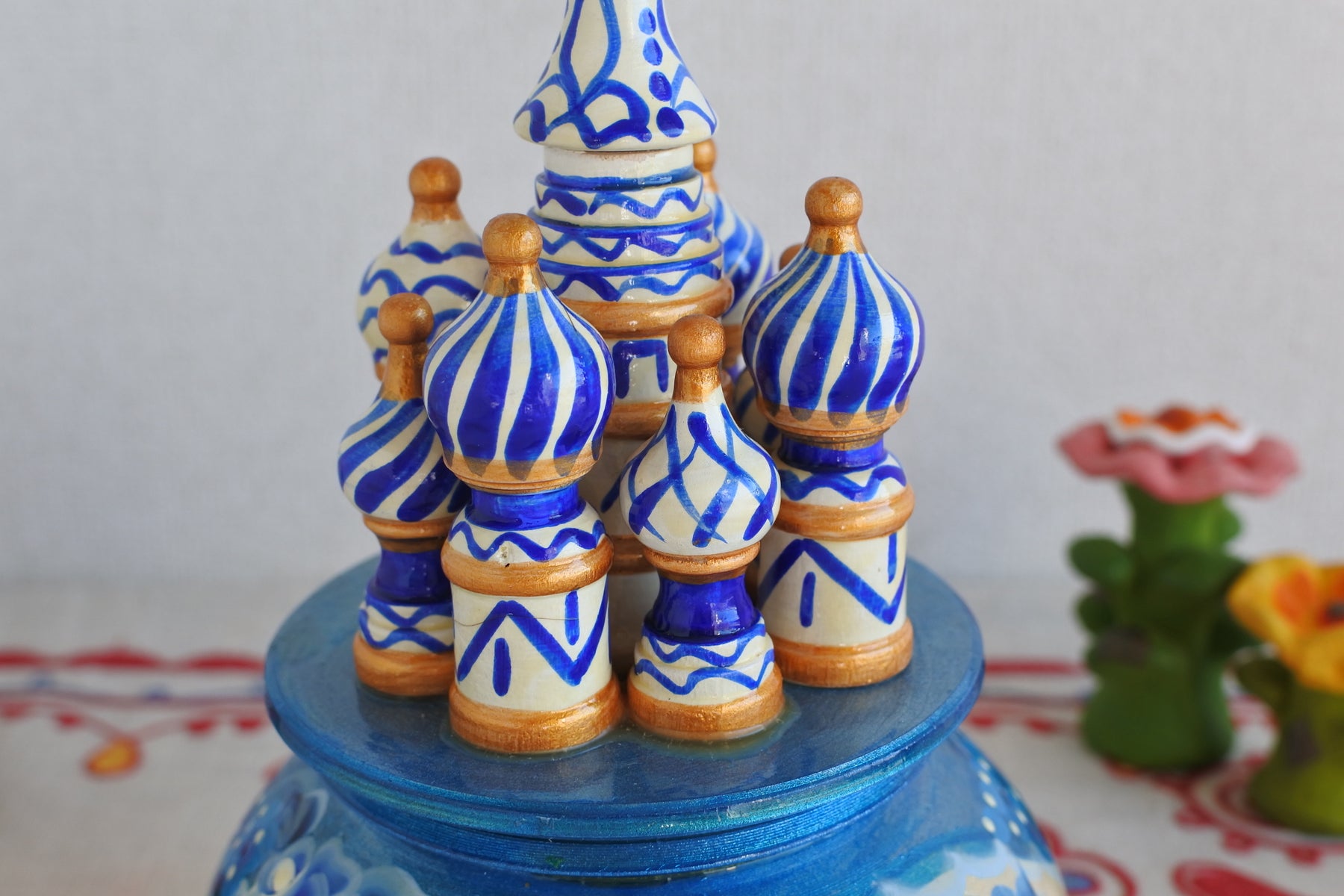 ワシリー大聖堂の木製オルゴールです。大聖堂がくるくると回りながらロシアの曲が流れます。天辺にはロシア正教会の八反十字架が付いています。