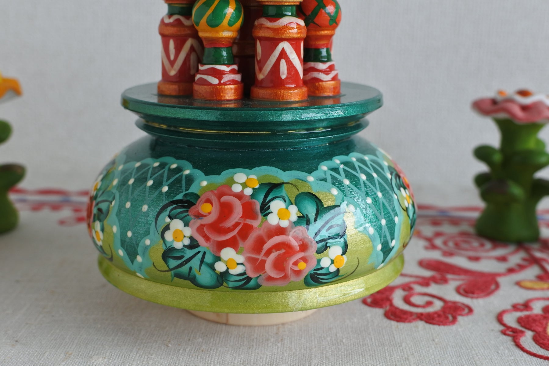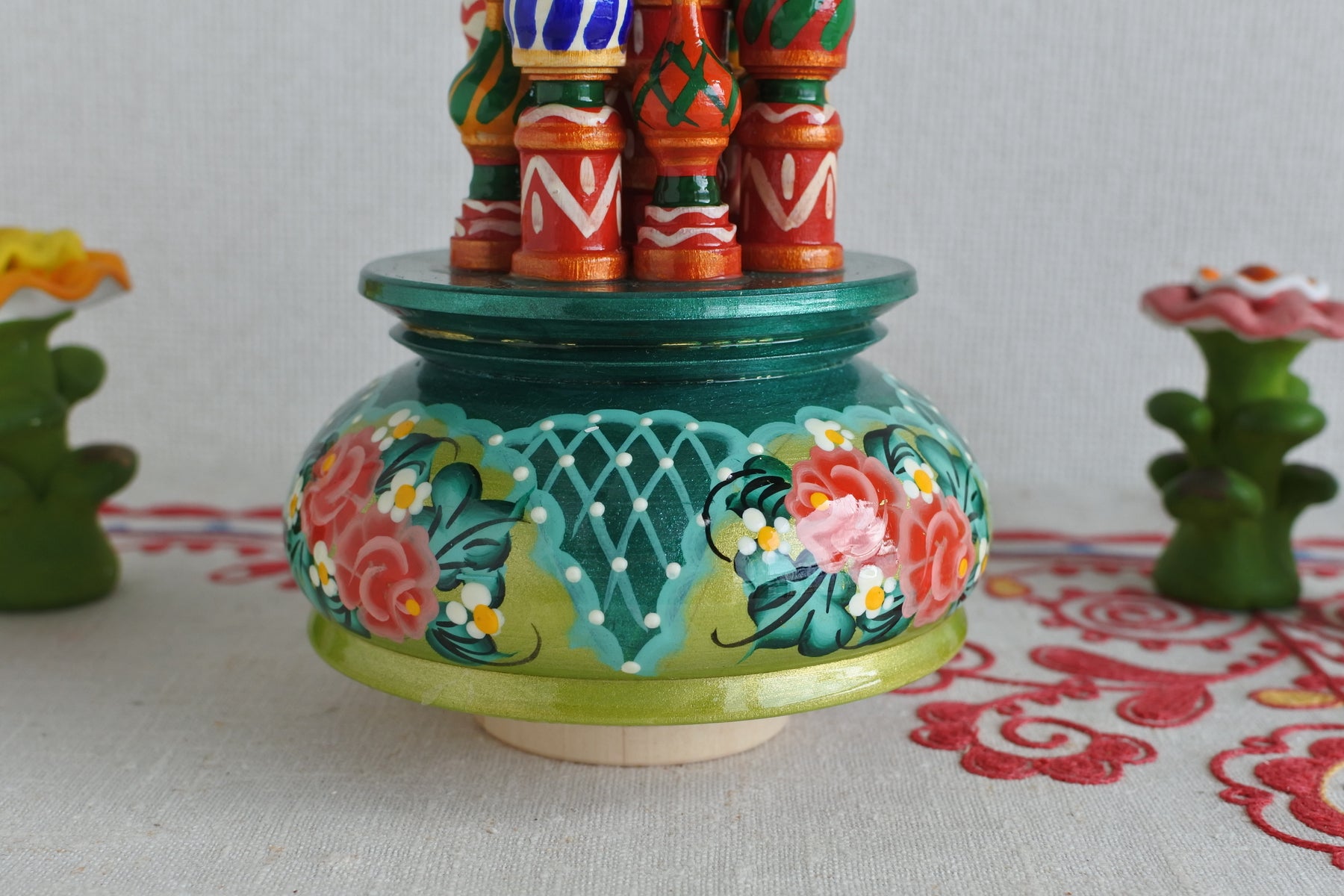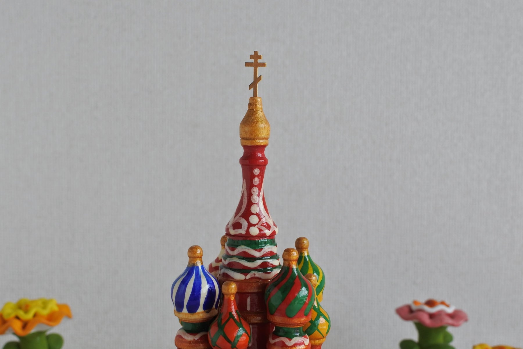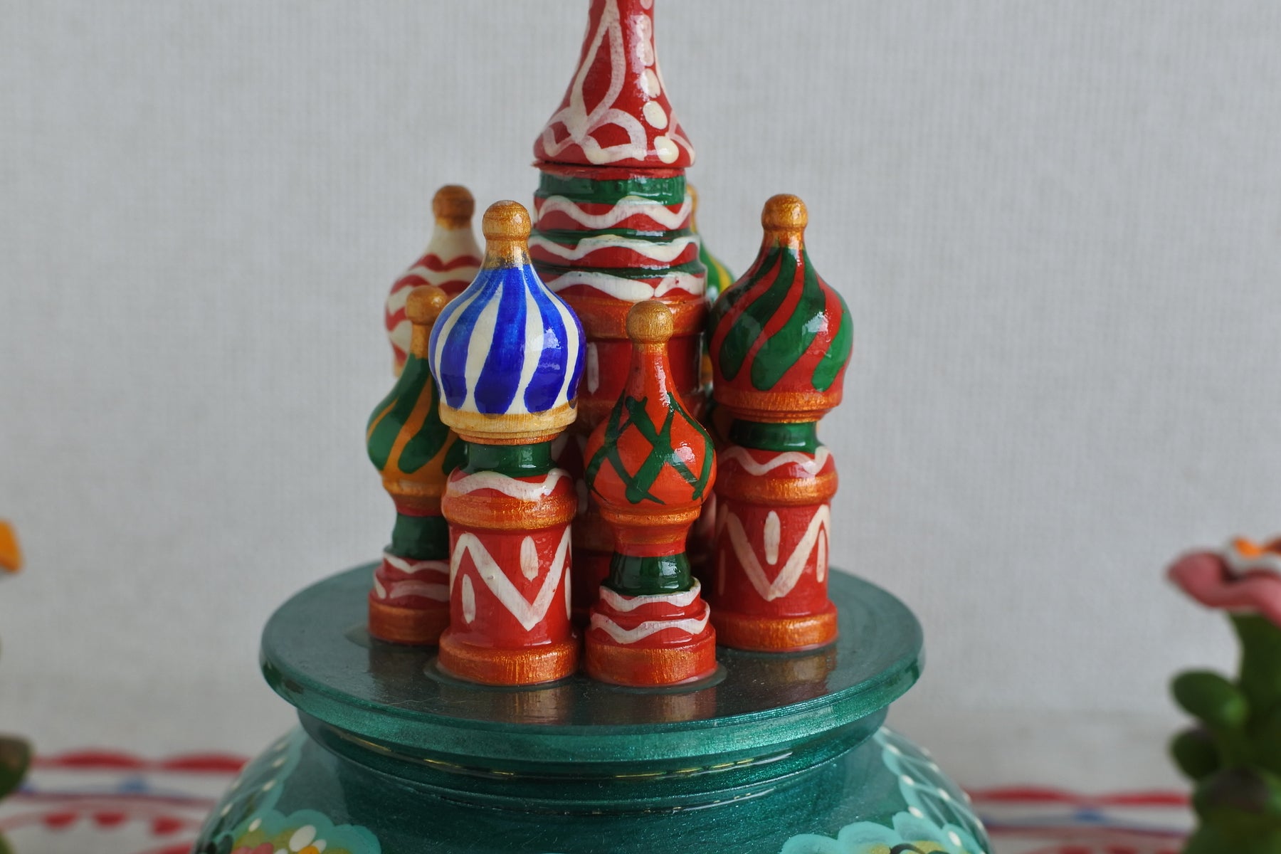 ワシリー大聖堂の木製オルゴールです。大聖堂がくるくると回りながらロシアの曲が流れます。天辺にはロシア正教会の八反十字架が付いています。
