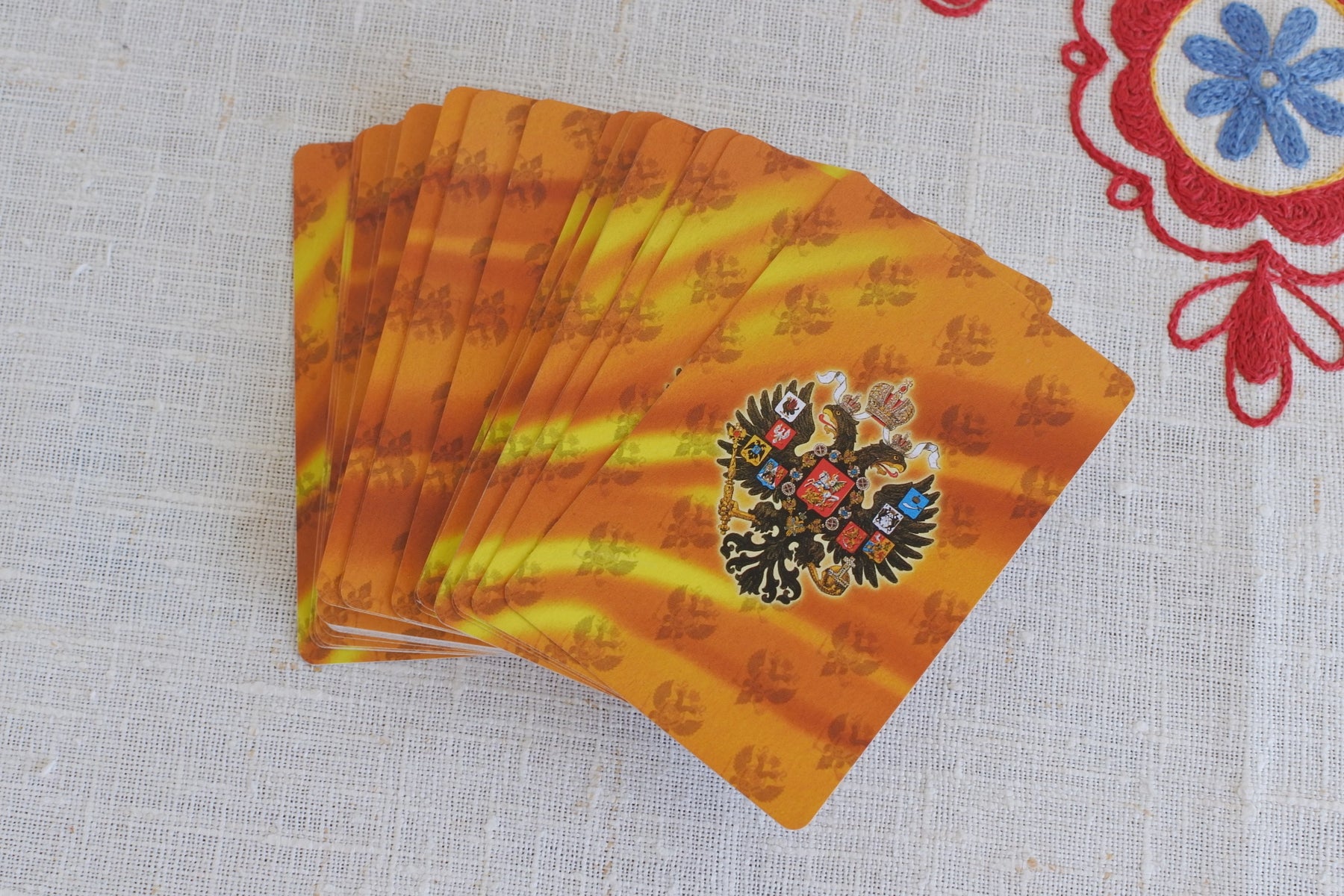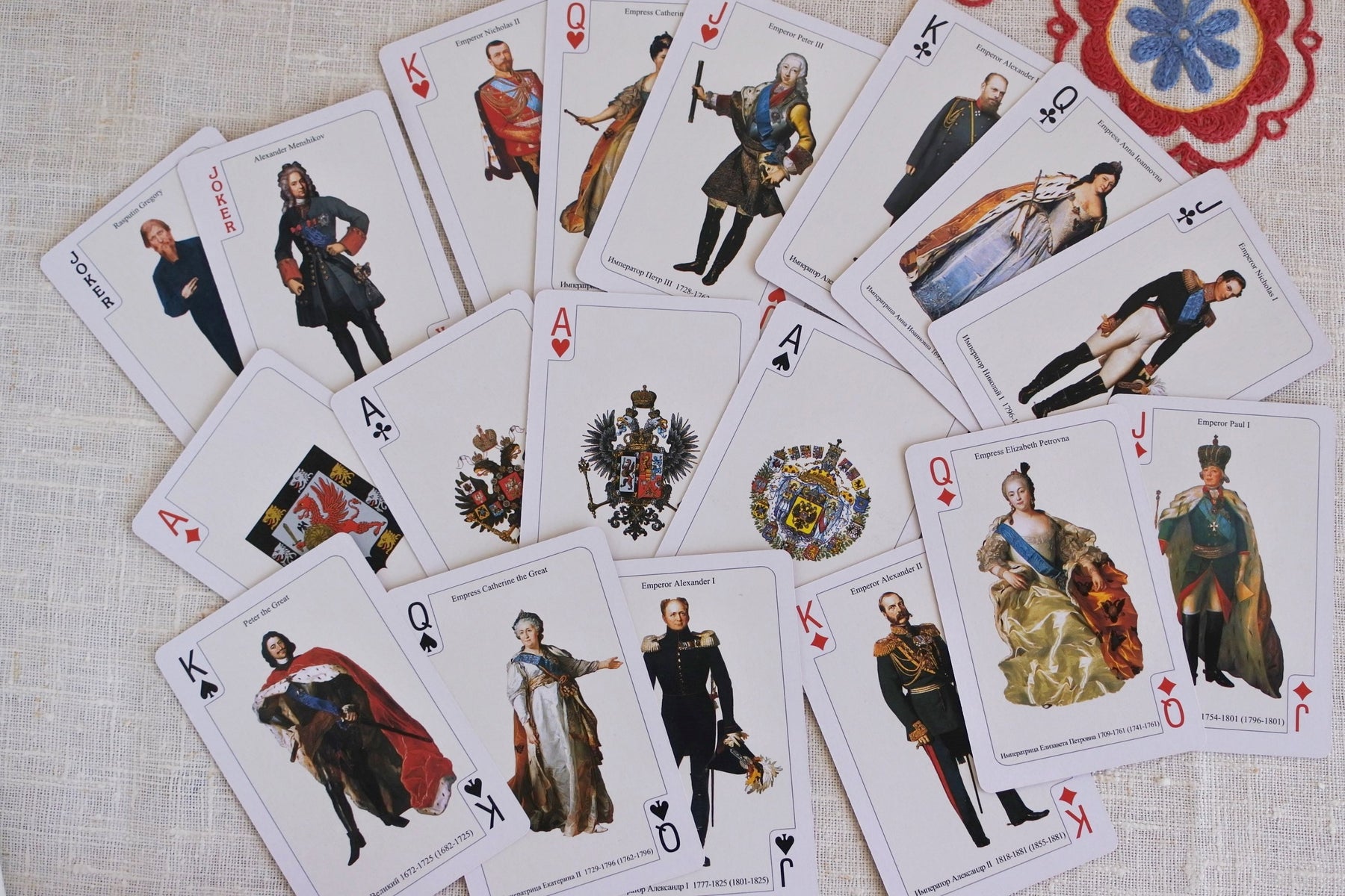 ロマノフ王朝のトランプです。A、J、Q、K+Jorkerには歴代ロマノフ王朝の皇帝、女帝が描かれています。カードの裏面はロシア帝国の紋章があります。ゲームに興じるよりもついついカードを見入ってしまうかもしれません。