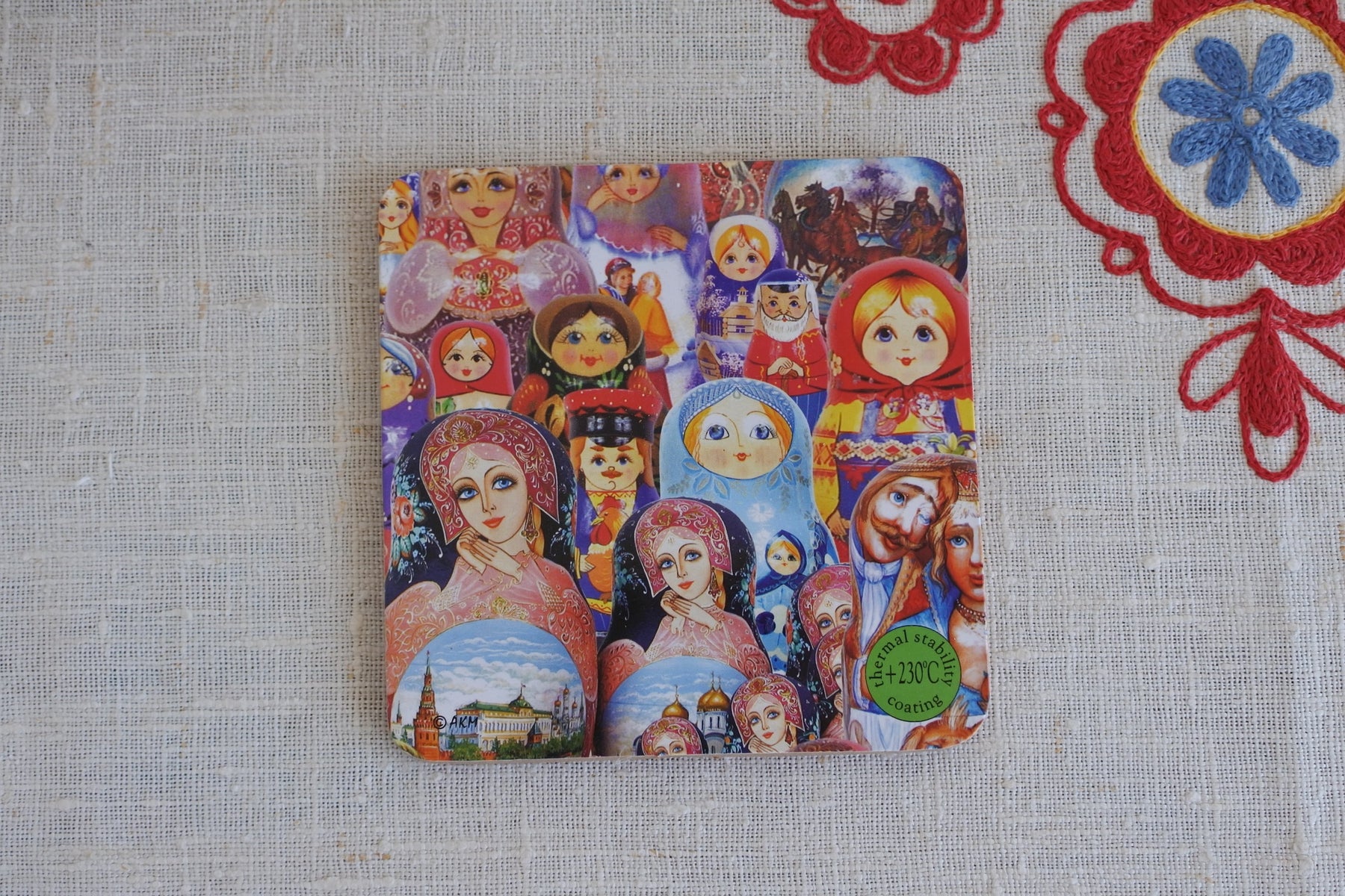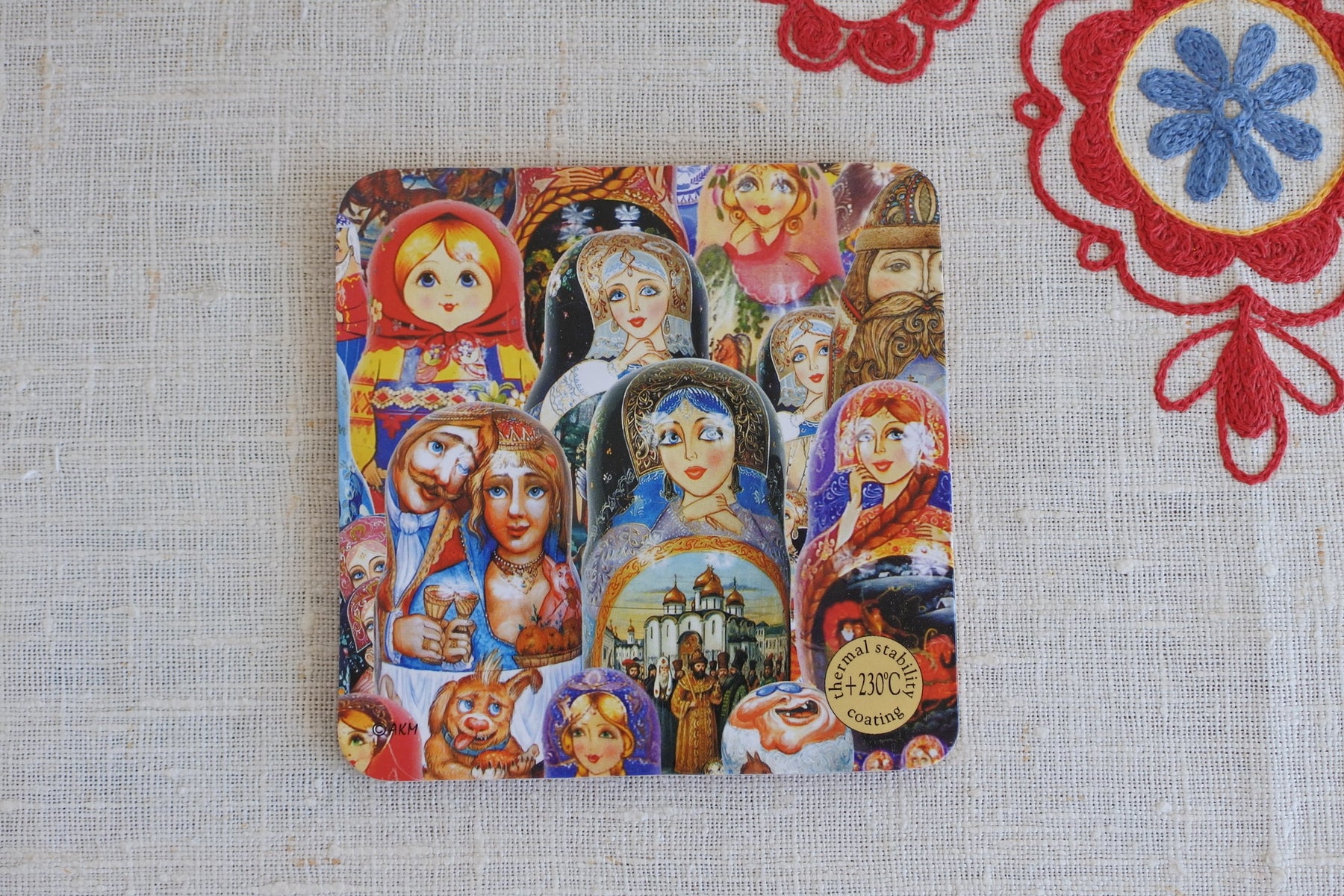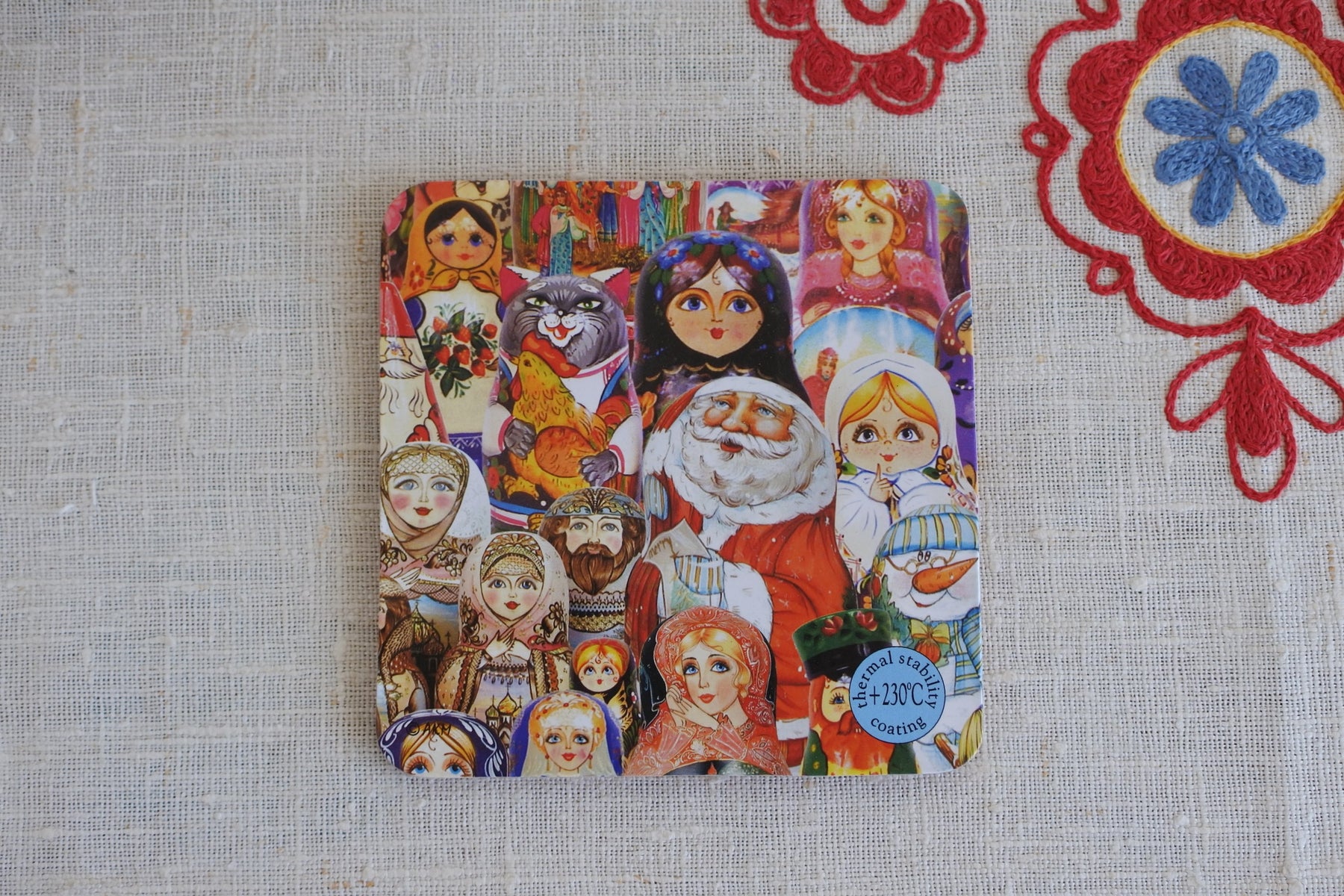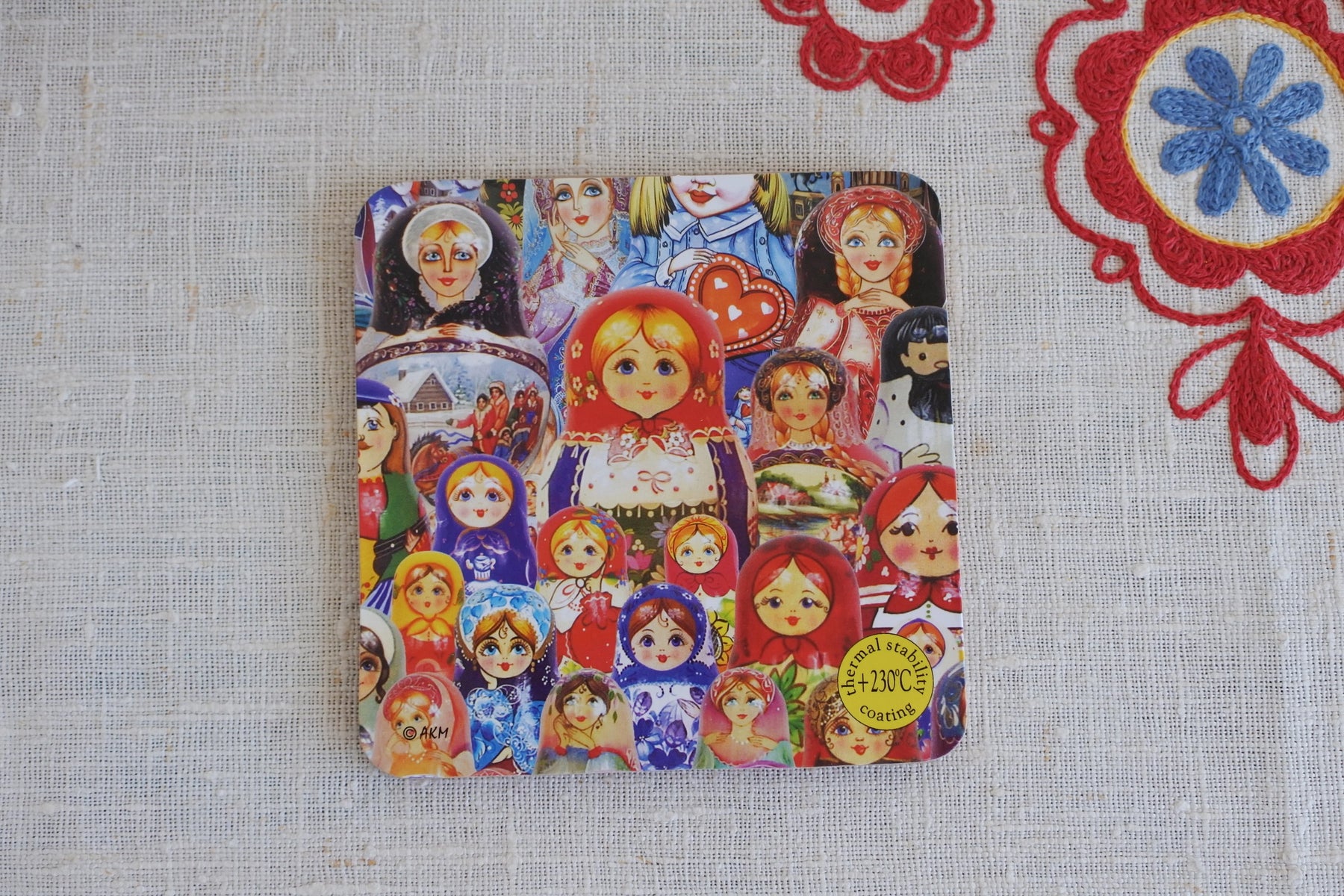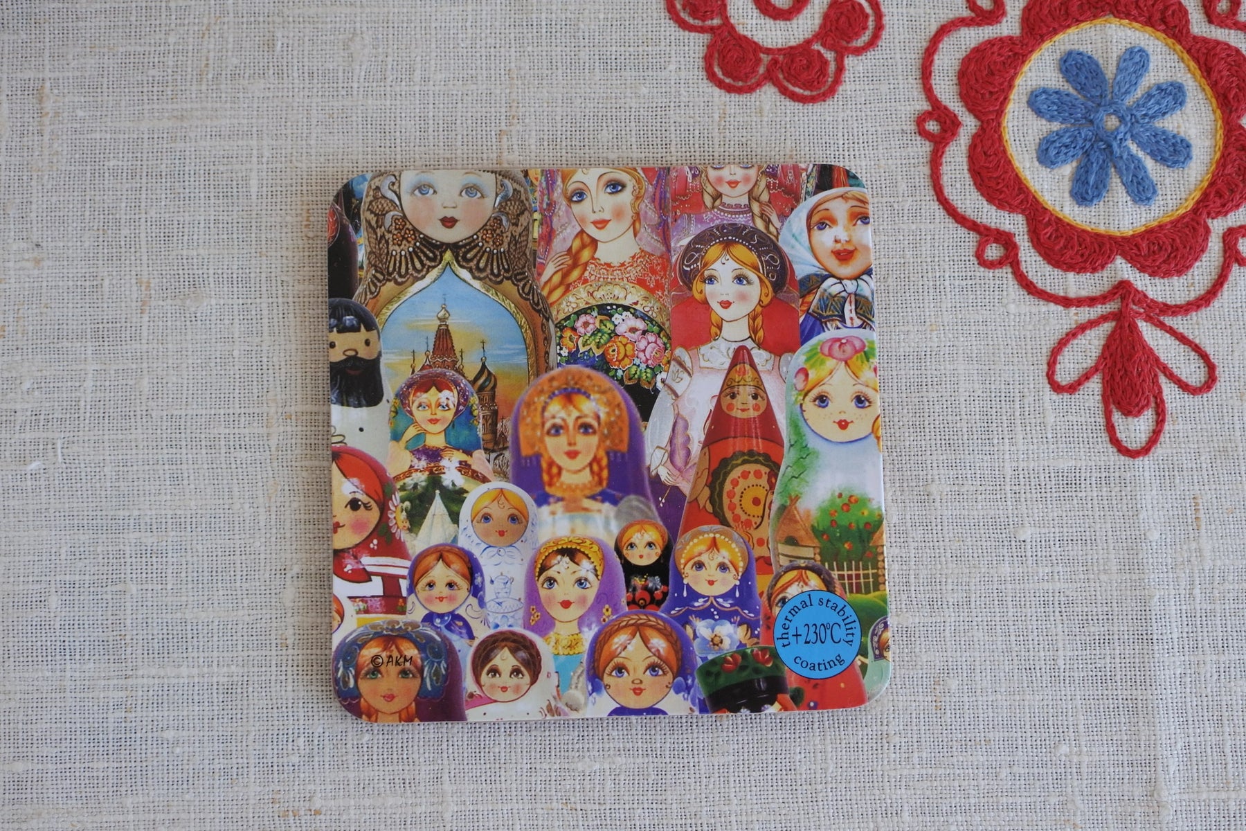 華やかなマトリョーシカがプリントされたコースターです。いろいろなお顔のマトリョーシカが勢ぞろい。6種類あります。お好きなマトリョーシカは写っていますか?