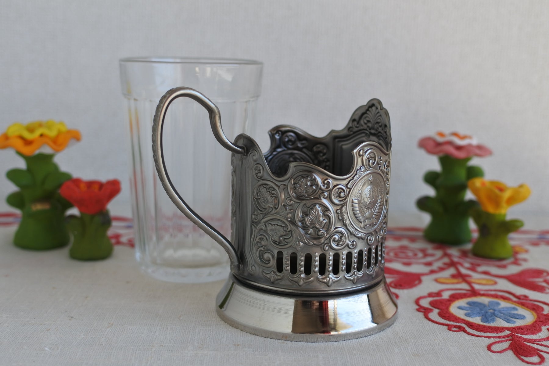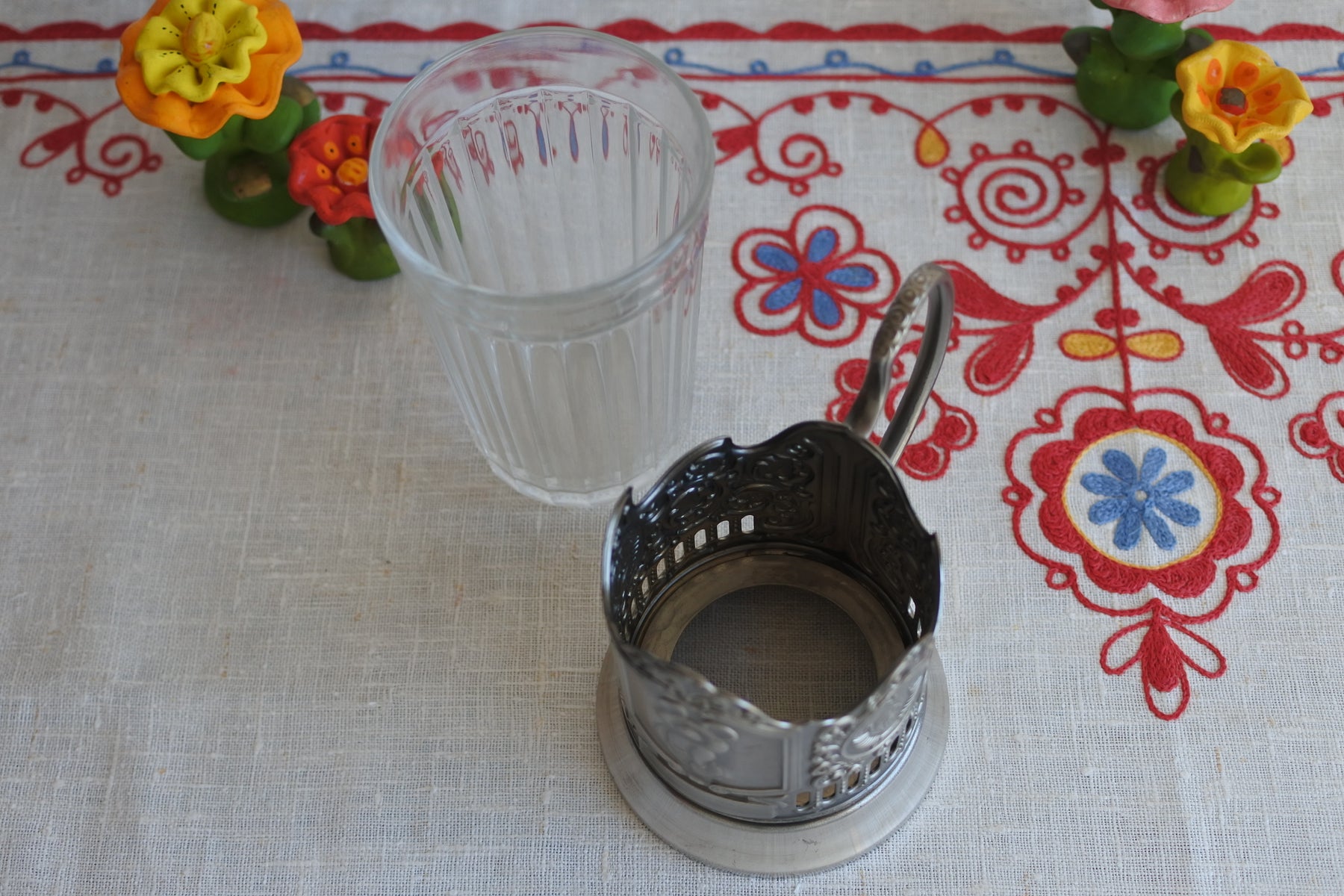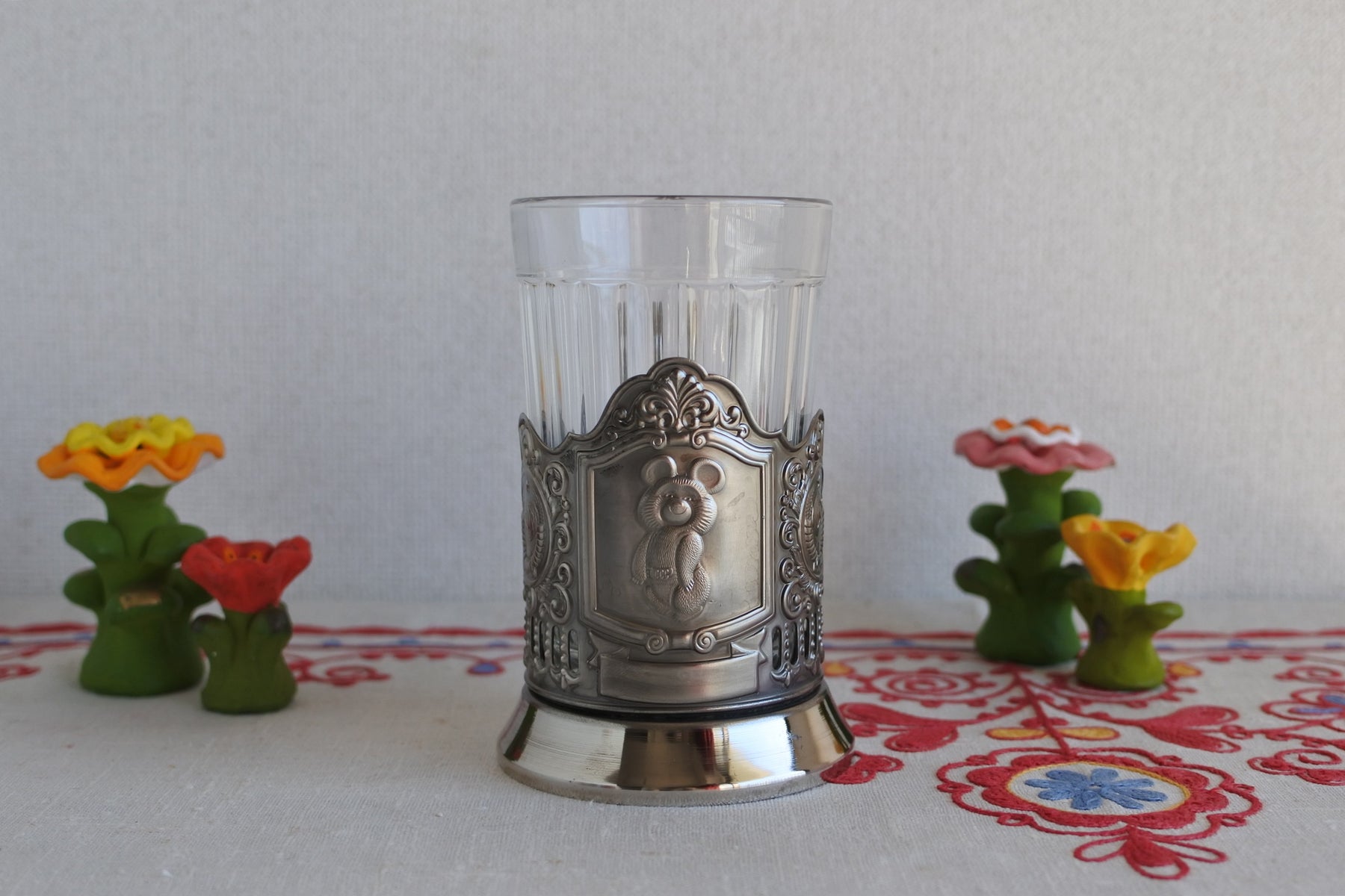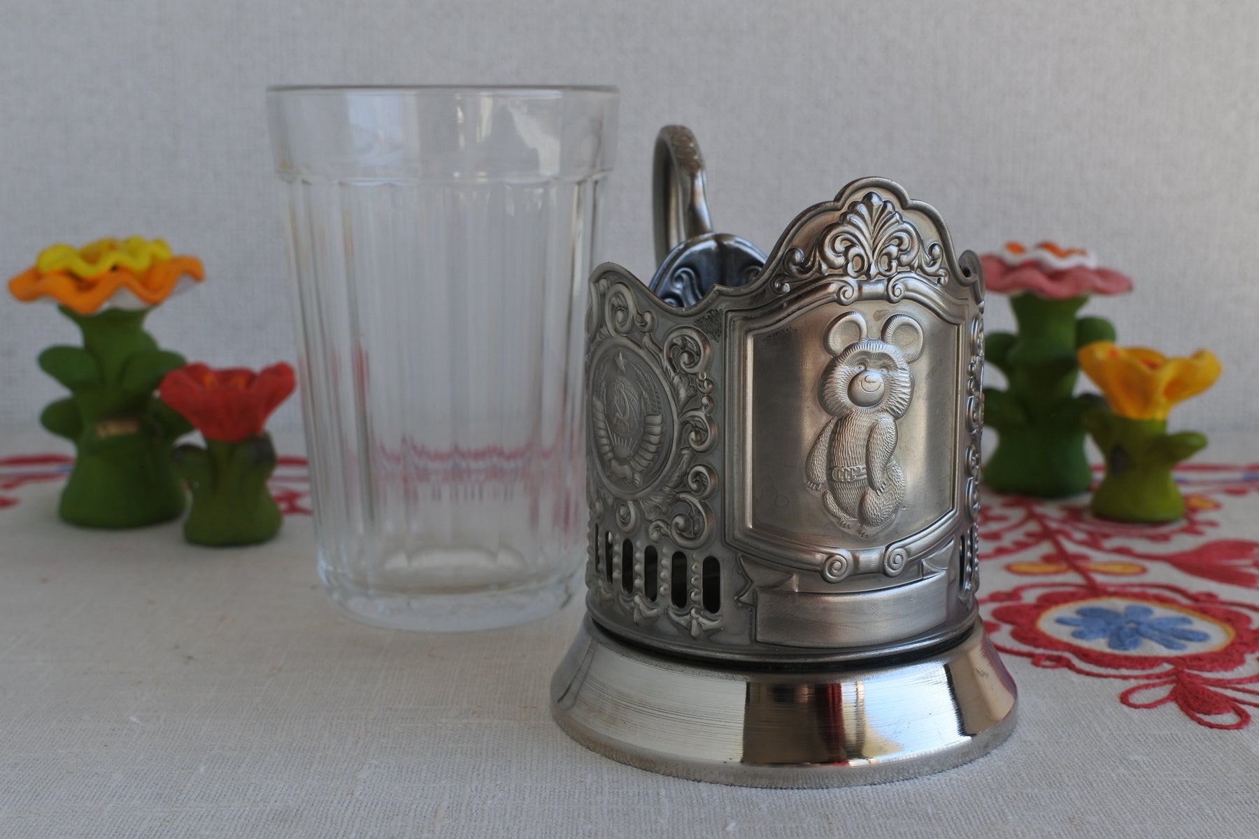 映画や小説にもよく出てくるグラスホルダー。シベリア鉄道ではお馴染みの風景。熱々の紅茶を並々と注いで熱いうちにいただきます。 真鍮に彫金で打ち出された「モスクワオリンピック ミーシャ」。 耐熱グラスとセットです。