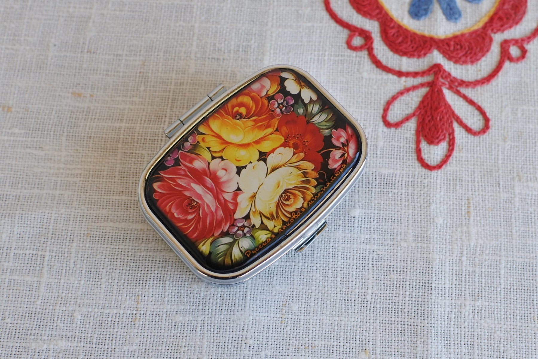 美しく開けるのが楽しくなるピルケース。持ち運びに便利なサイズです。ロシアの工芸ラッカーミニアチュールの絵画デザインがプリントされています。繊細で色鮮やかな物語が小箱の中で広がります。