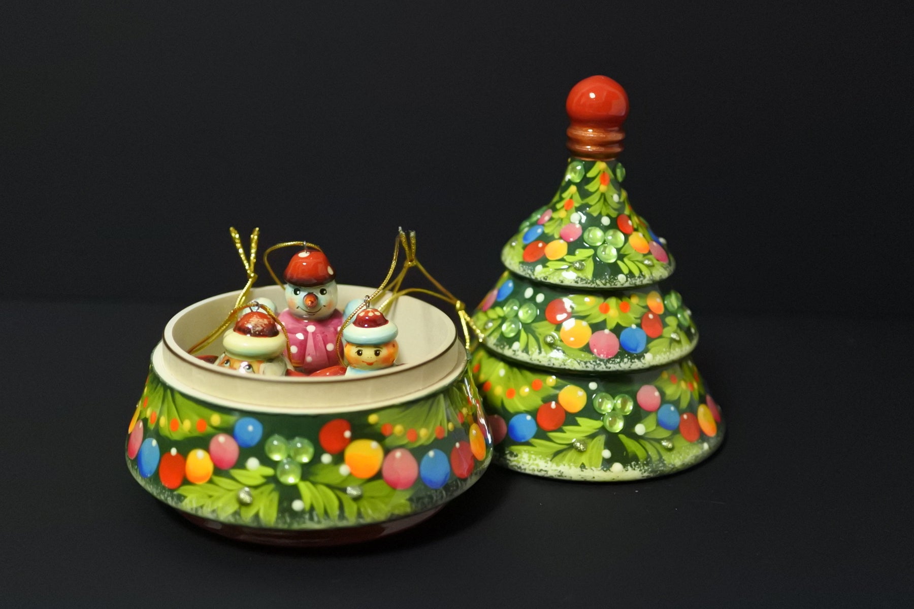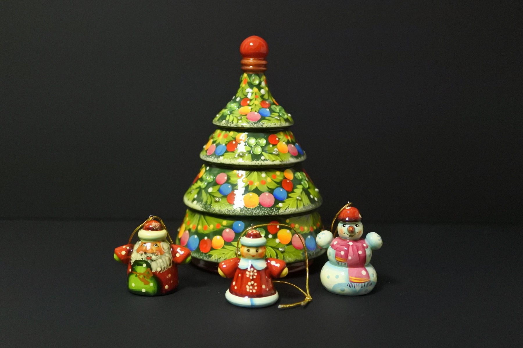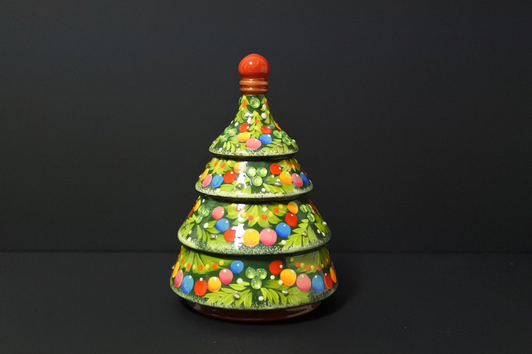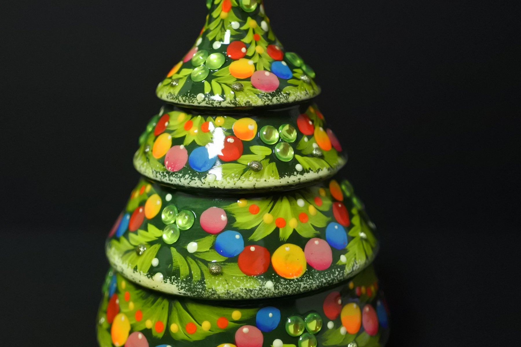 4色の鮮やかなクリスマスボールが描かれ、グリーンのビーズが施された華やかなクリスマスツリーです。