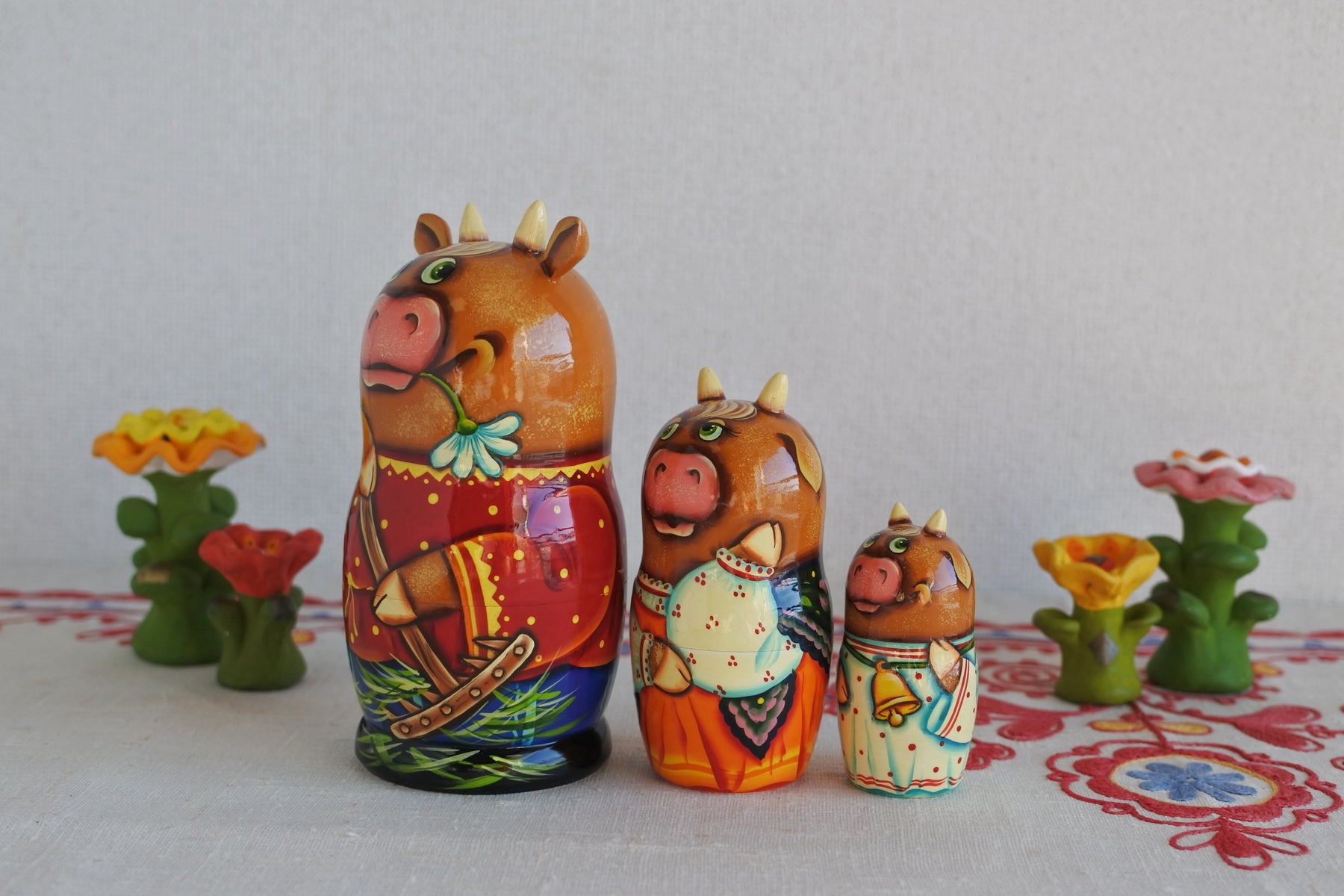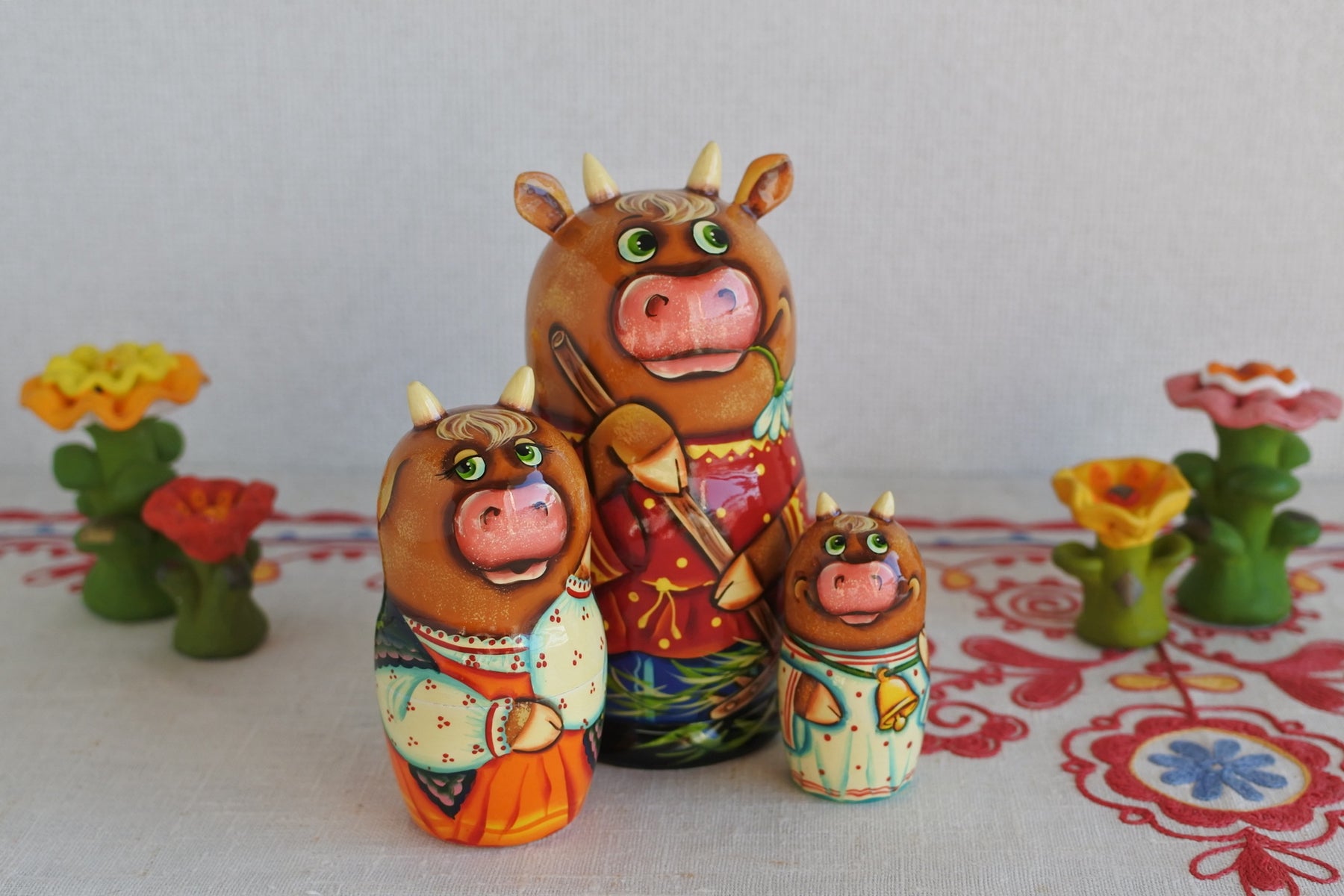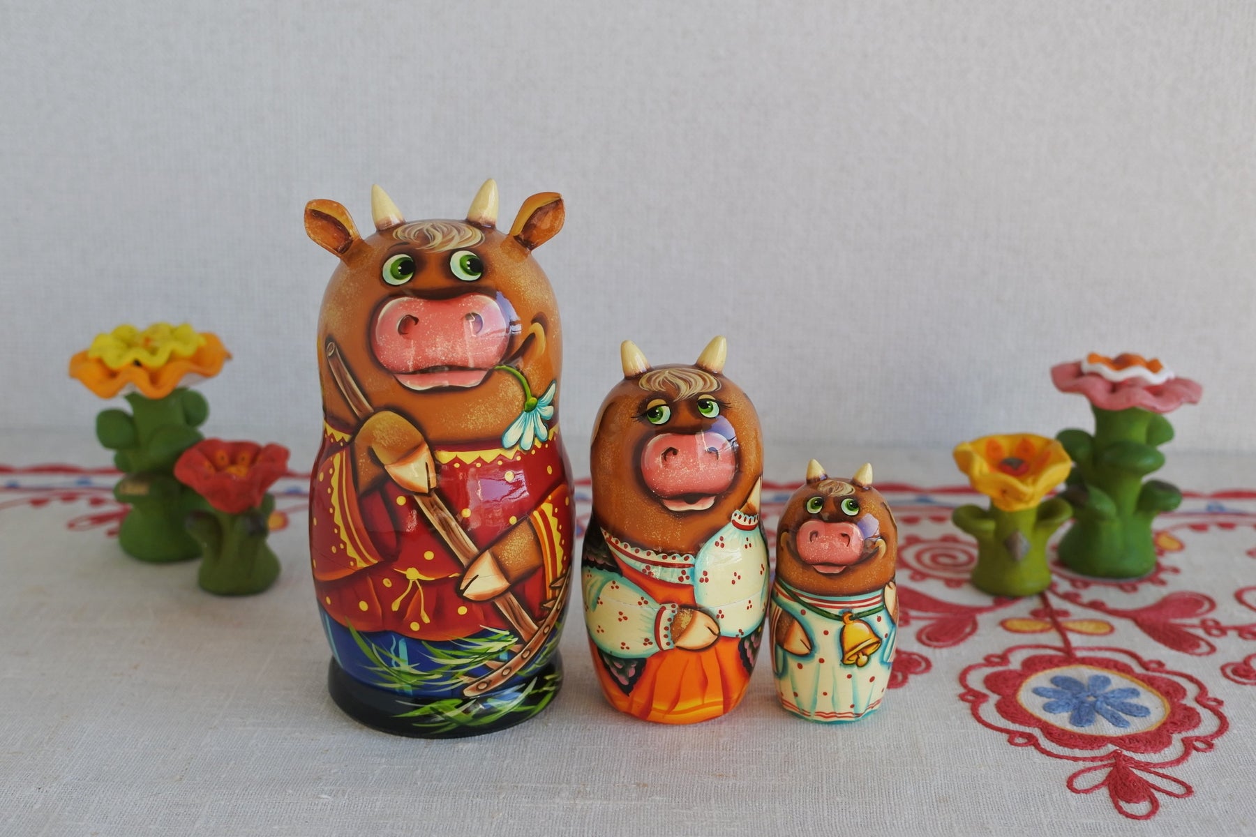 牛の家族のマトリョーシカ。休日は広いお庭の草刈り。朽ちたマーガレットをくわえて。ゆったりとしたロシア時間。耳と角が生えた細工がニクい!