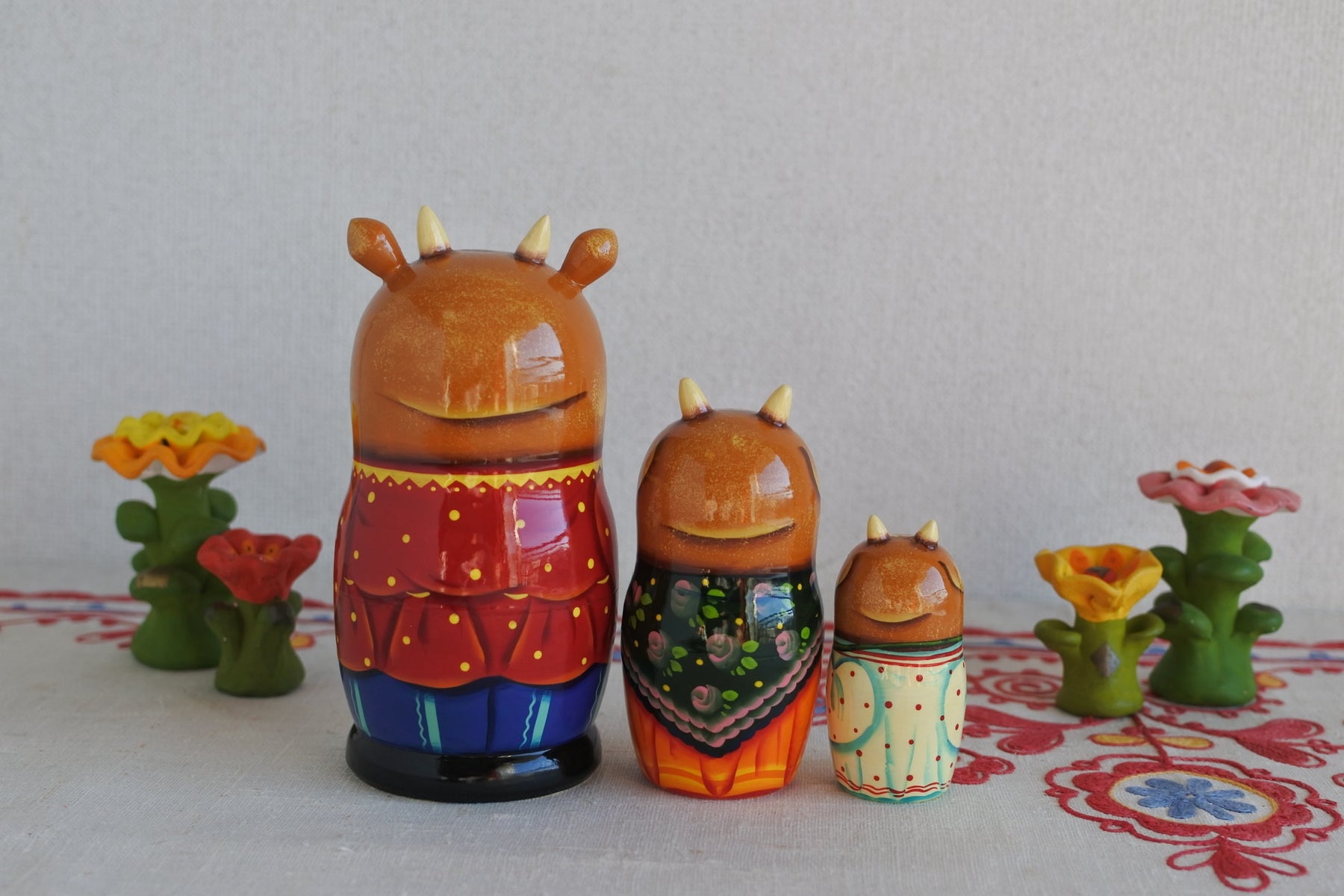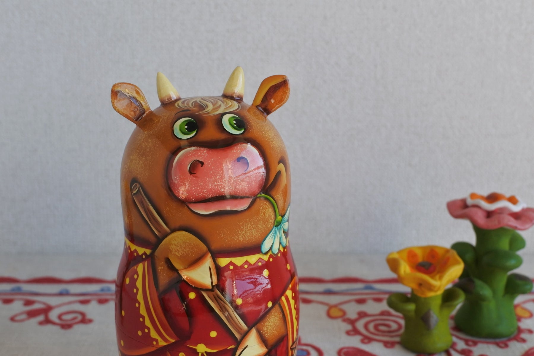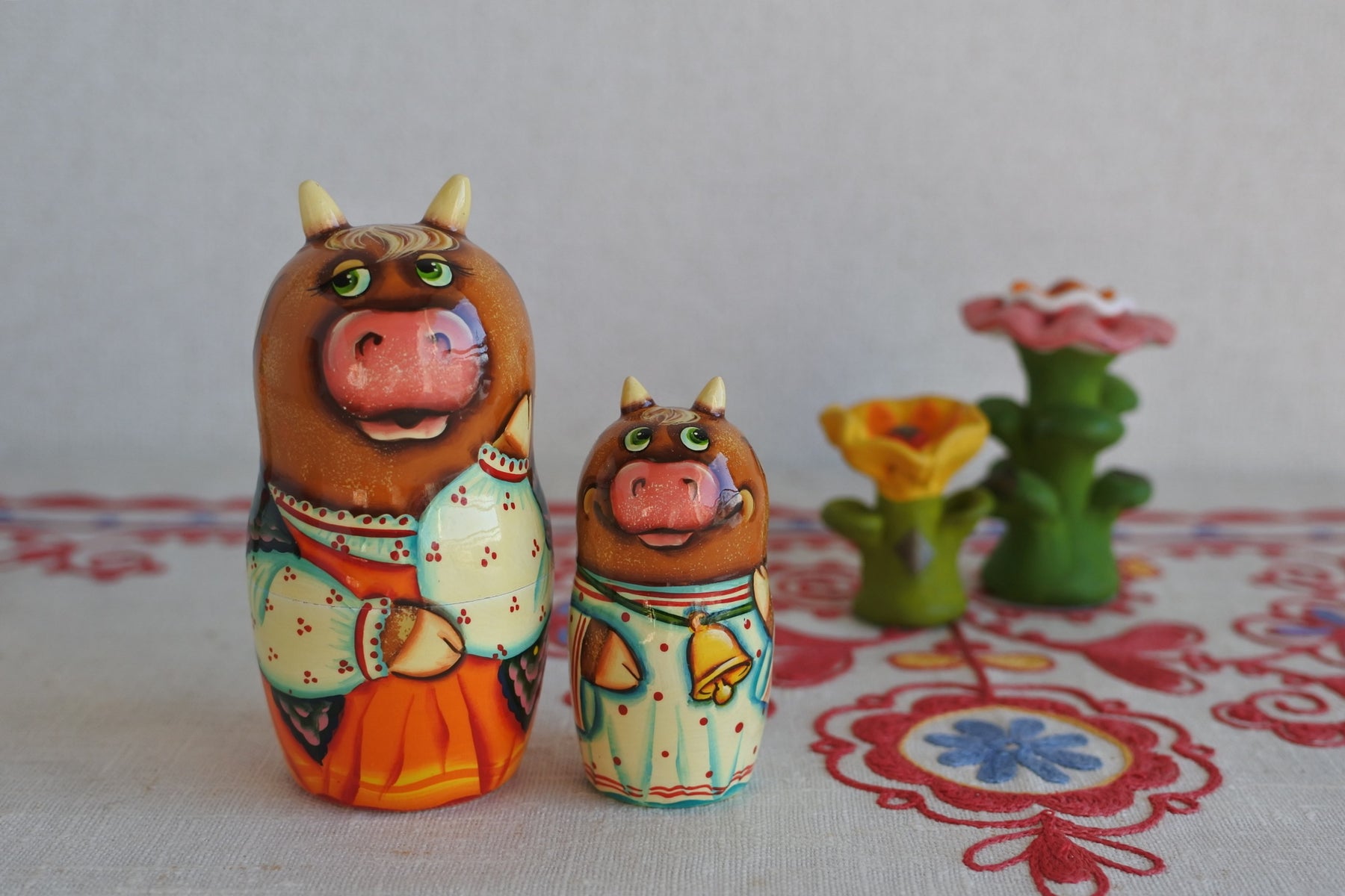 牛の家族のマトリョーシカ。休日は広いお庭の草刈り。朽ちたマーガレットをくわえて。ゆったりとしたロシア時間。耳と角が生えた細工がニクい!